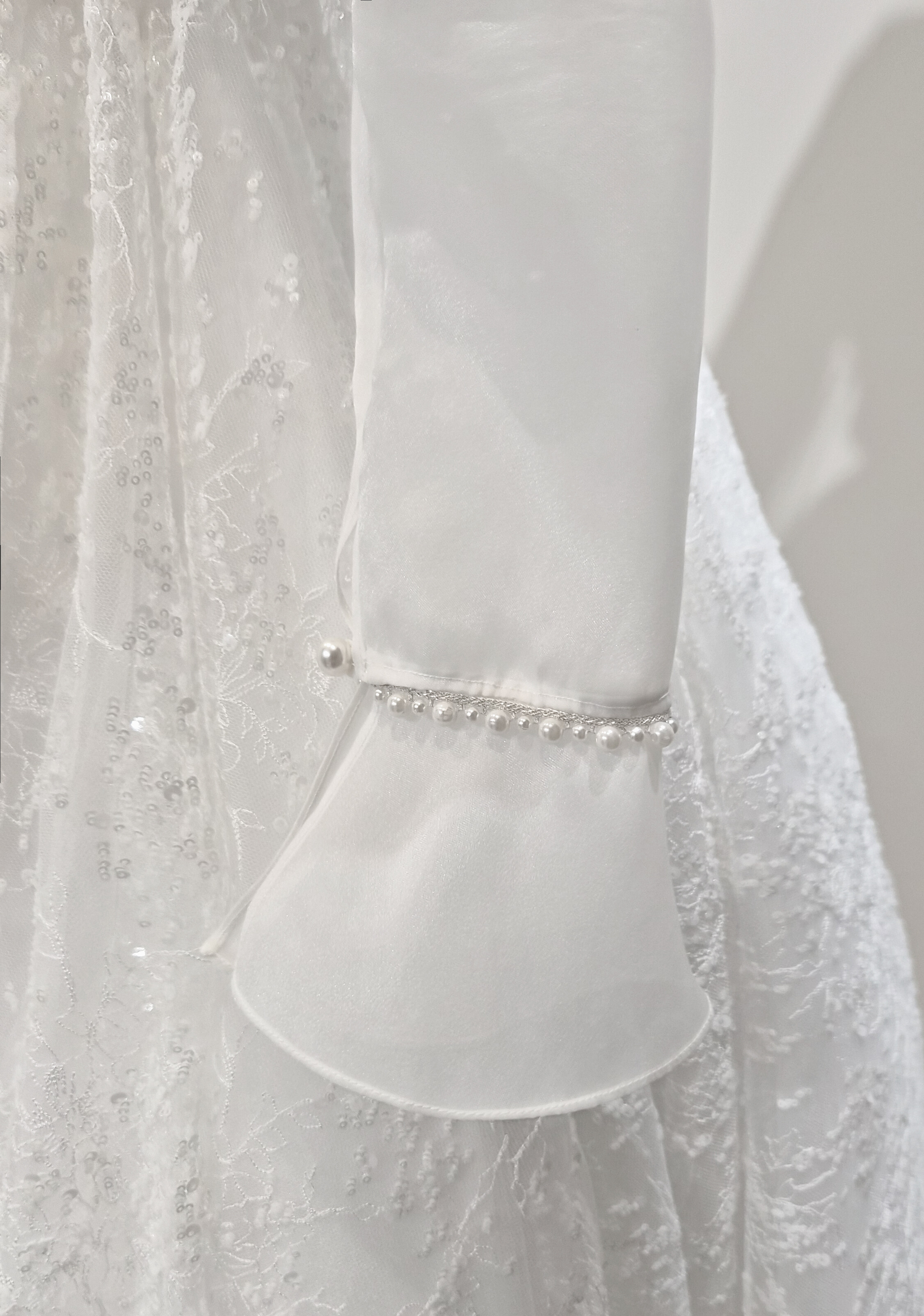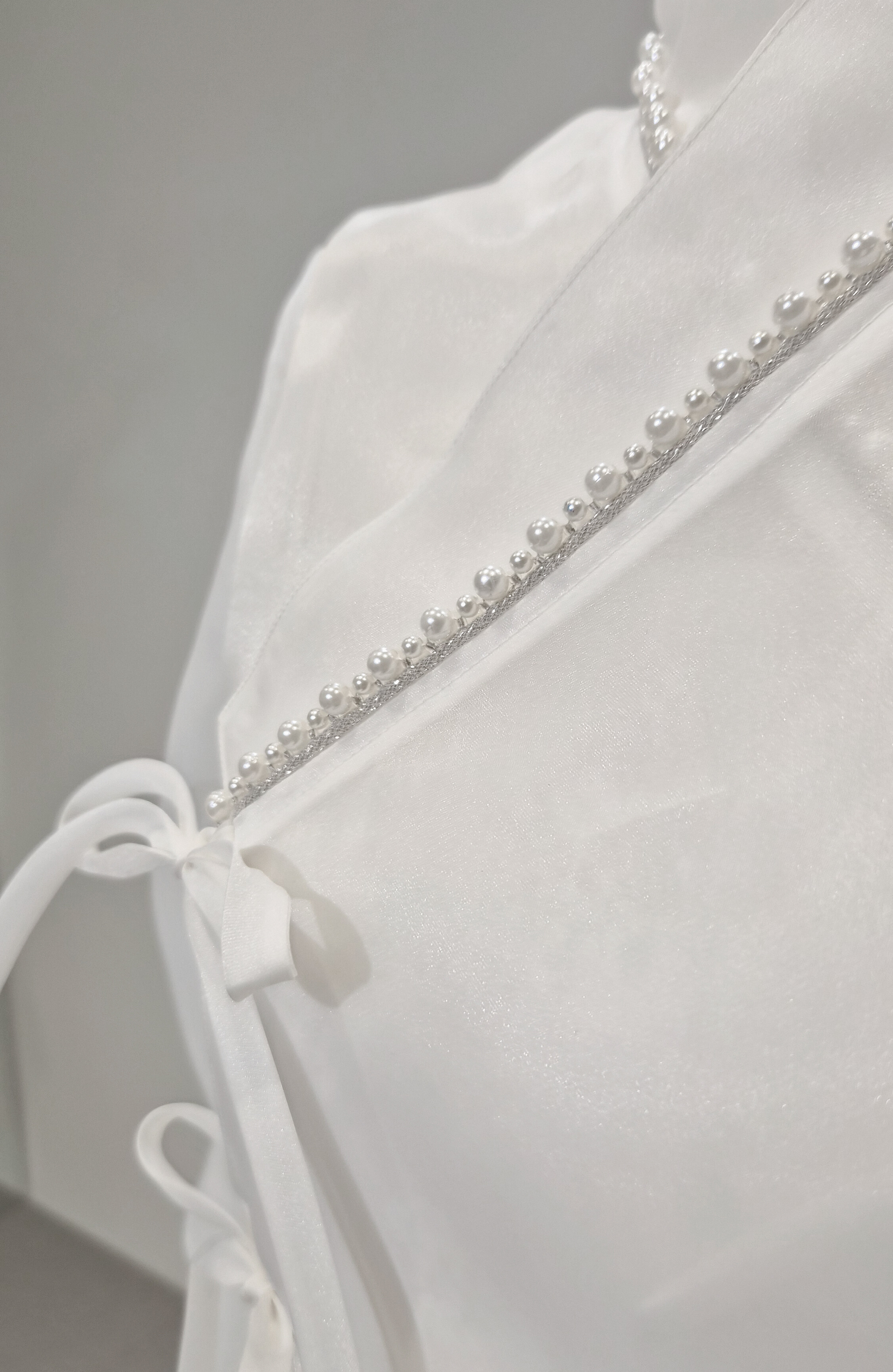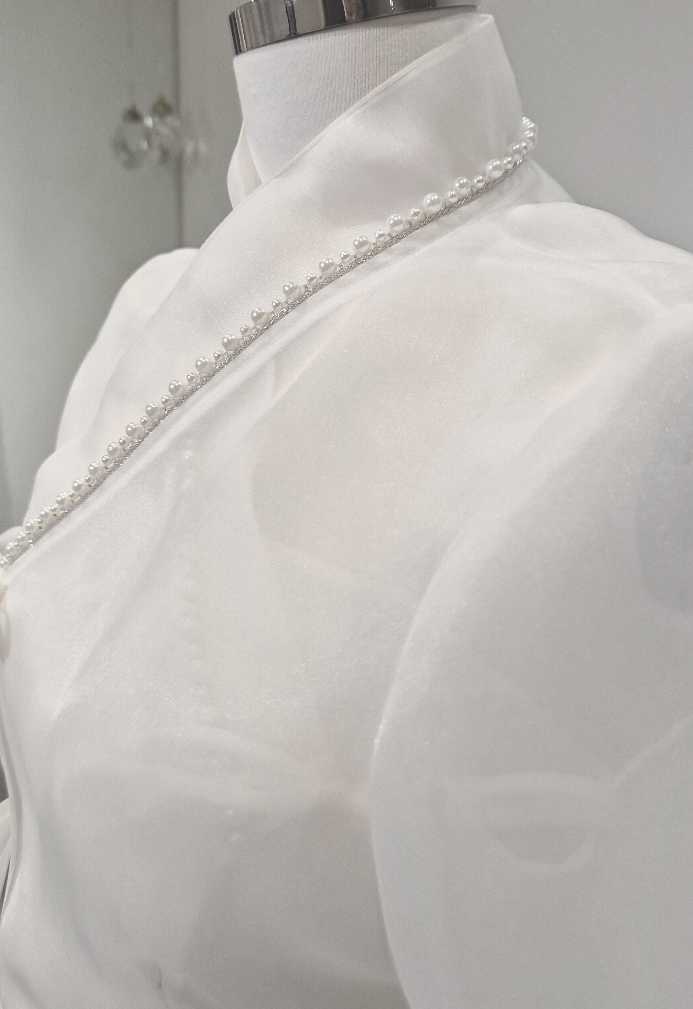 전통 한복 저고리의 실루엣을 서양식 블라우스 감성으로 재해석하였습니다. 은은하게 비치는 시스루 소재로 부드럽고 여성스러운 분위기를 낼 수 있습니다. 깃과 소매 끝에 더해진 진주 장식은 우아한 포인트로 작용하여 전체 스타일에 고급스러움을 더해줍니다.