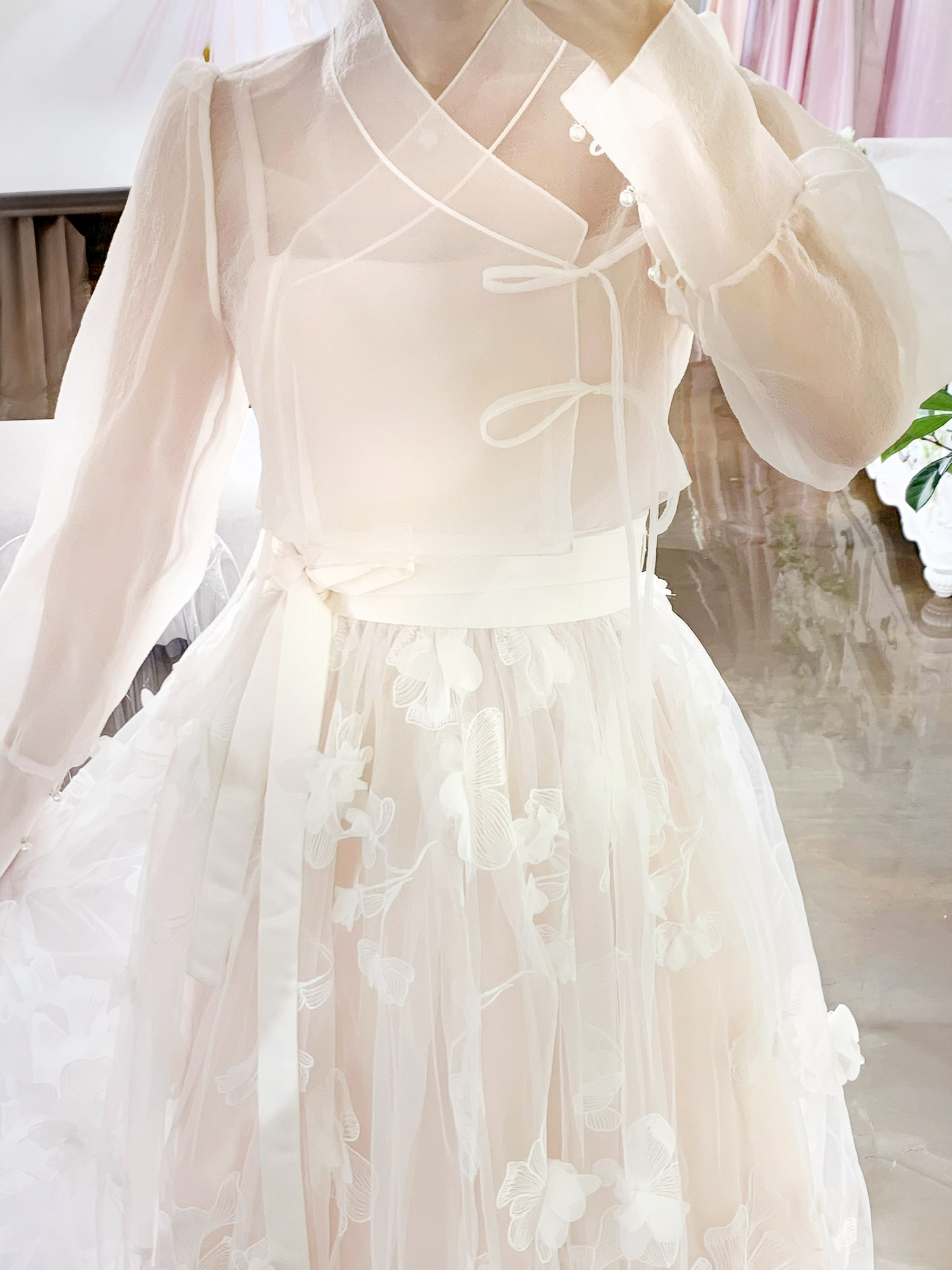 Made from a sheer, lightweight fabric, this blouse creates an elegant and airy silhouette. The signature collar and ribbon tie borrowed from traditional Korean hanbok are softened with graceful curves, blending effortlessly whether layered over a simple dress or paired with a hanbok skirt. The voluminous puff sleeves add a lovely, romantic touch, completing a look that’s both feminine and timeless.