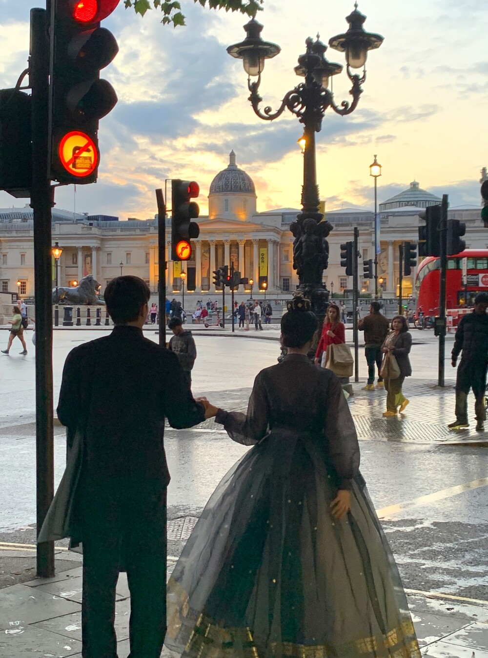 전통 한복의 감성을 우아하게 서양식 실루엣에 녹여냈습니다. 투명한 오간자 소재를 활용하여 로맨틱하고 여리여리한 무드를 자아내며, 자연스럽게 퍼지는 A라인 실루엣으로 풍성함을 더했습니다. 밑단을 따라 섬세하게 더해진 금박 패턴 장식이 은은한 빛을 머금어 전통미와 함께 고급스럽고 화려한 분위기를 완성합니다.