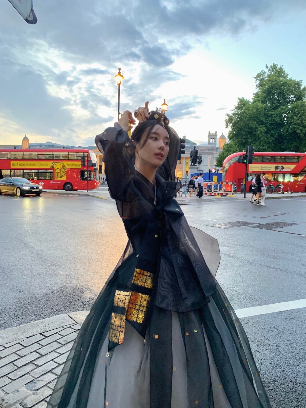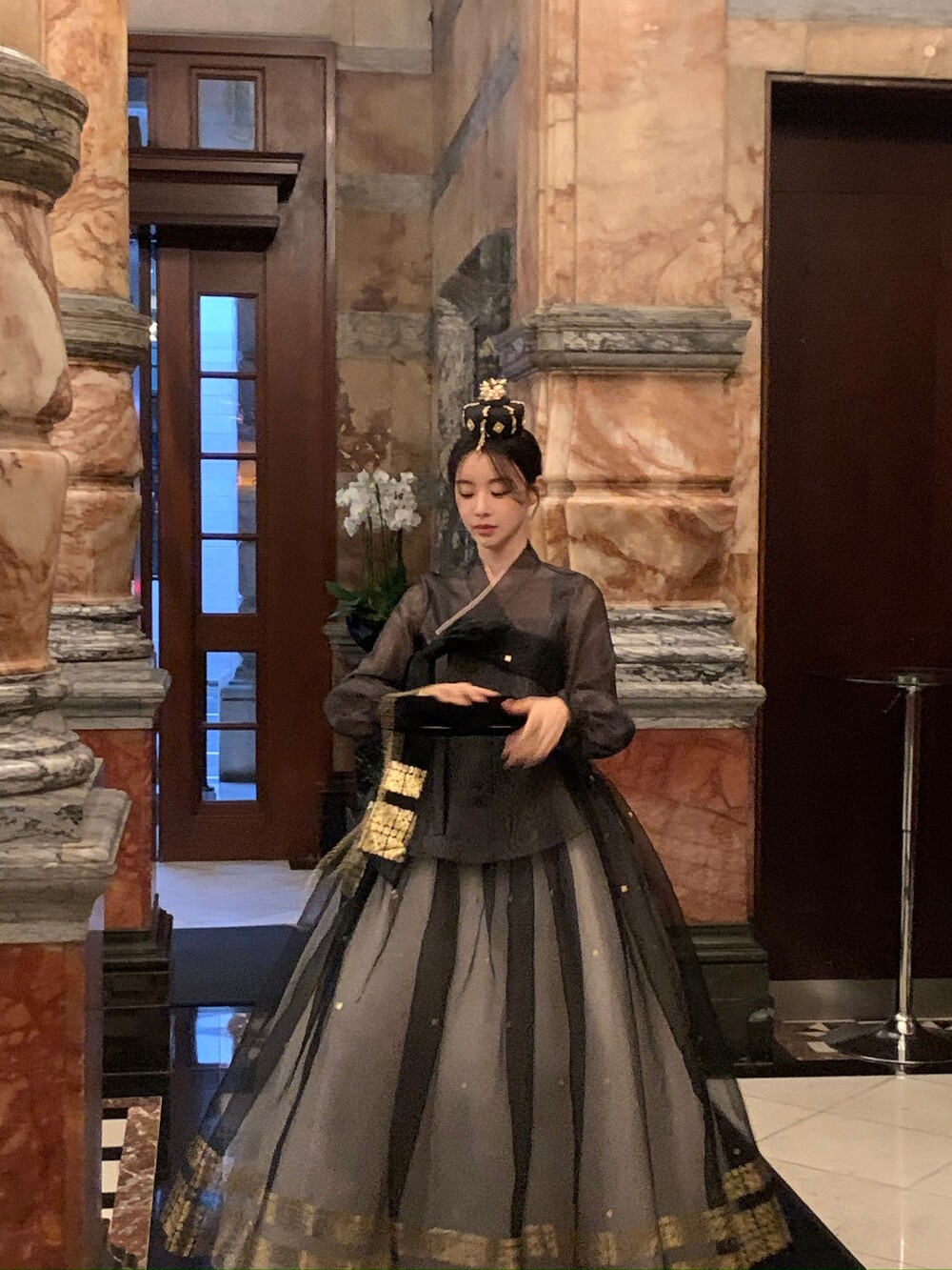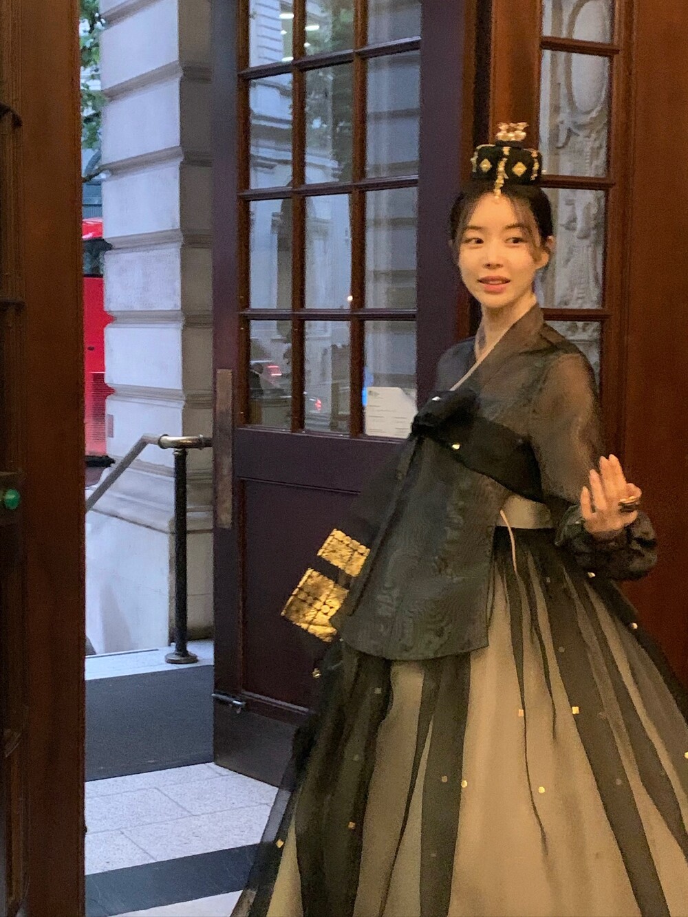 This Organza dress gracefully blends the sentiment of traditional Korean hanbok with a Western silhouette. The sheer, lightweight fabric creates a romantic and delicate mood, while the softly flared A-line shape adds volume and elegance. Intricate gold foil details along the hem subtly catch the light, infusing the look with traditional charm and a touch of luxurious brilliance.