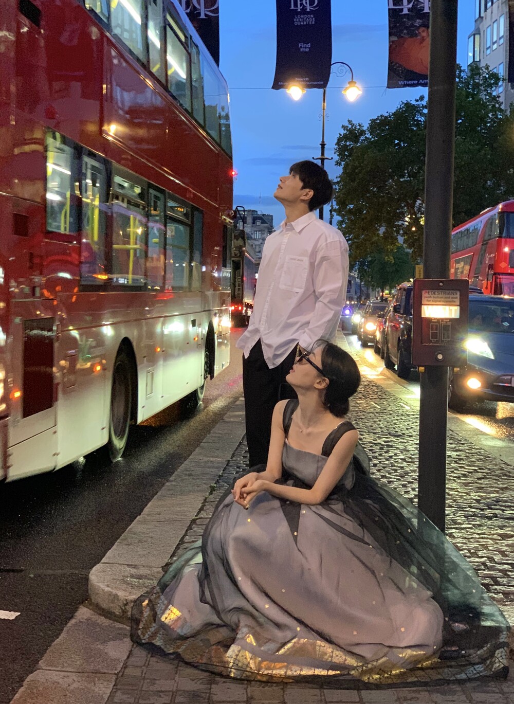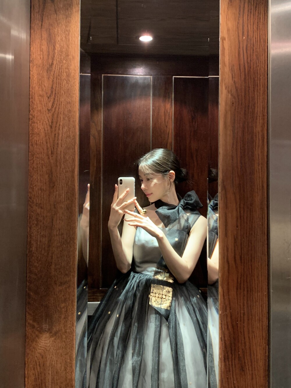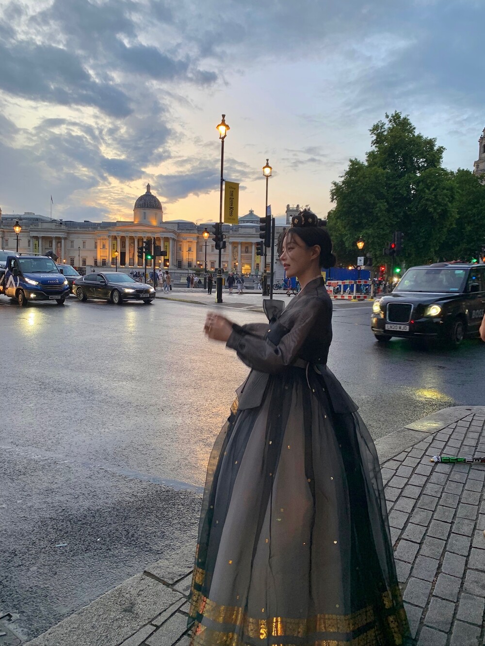 This Organza dress gracefully blends the sentiment of traditional Korean hanbok with a Western silhouette. The sheer, lightweight fabric creates a romantic and delicate mood, while the softly flared A-line shape adds volume and elegance. Intricate gold foil details along the hem subtly catch the light, infusing the look with traditional charm and a touch of luxurious brilliance.