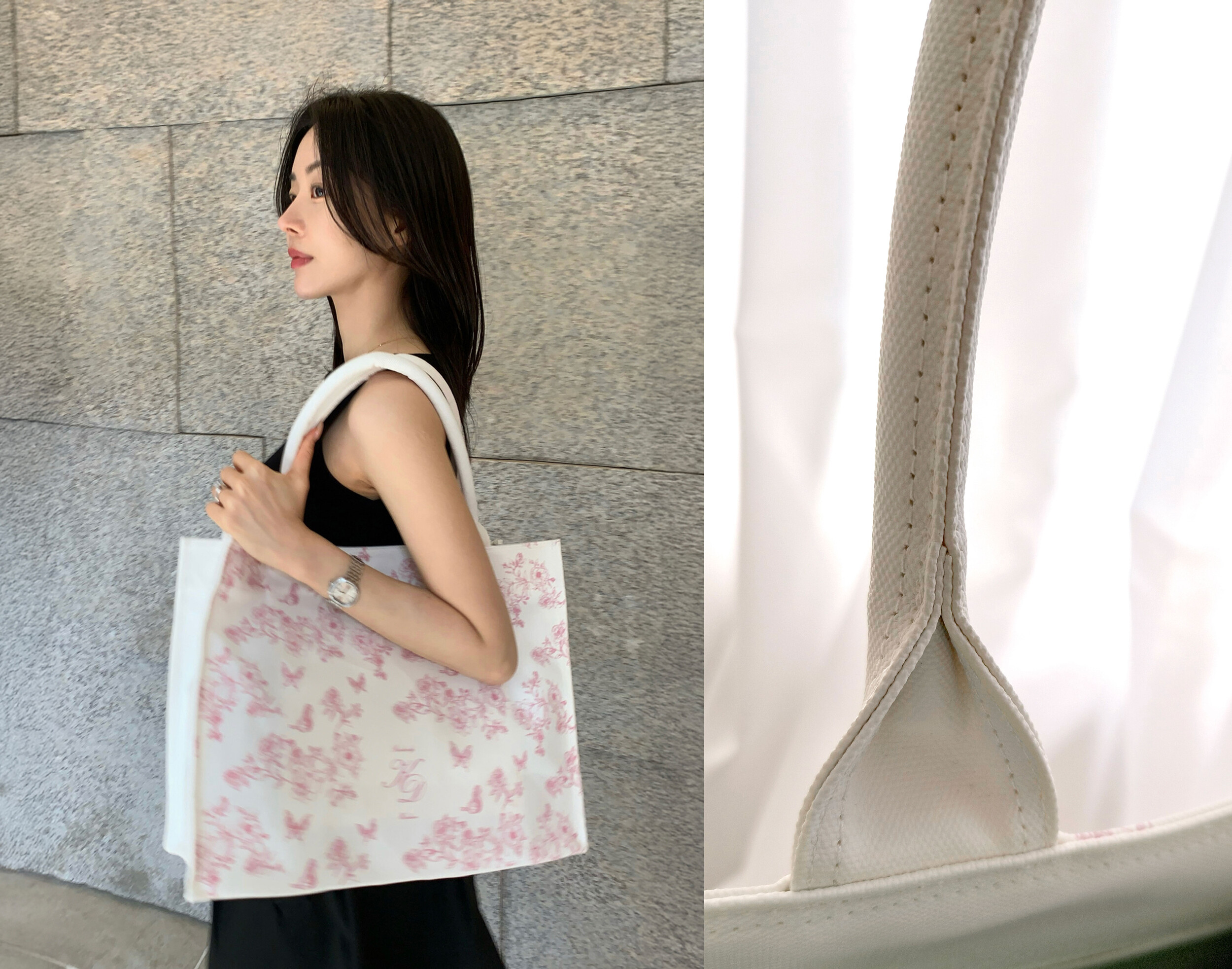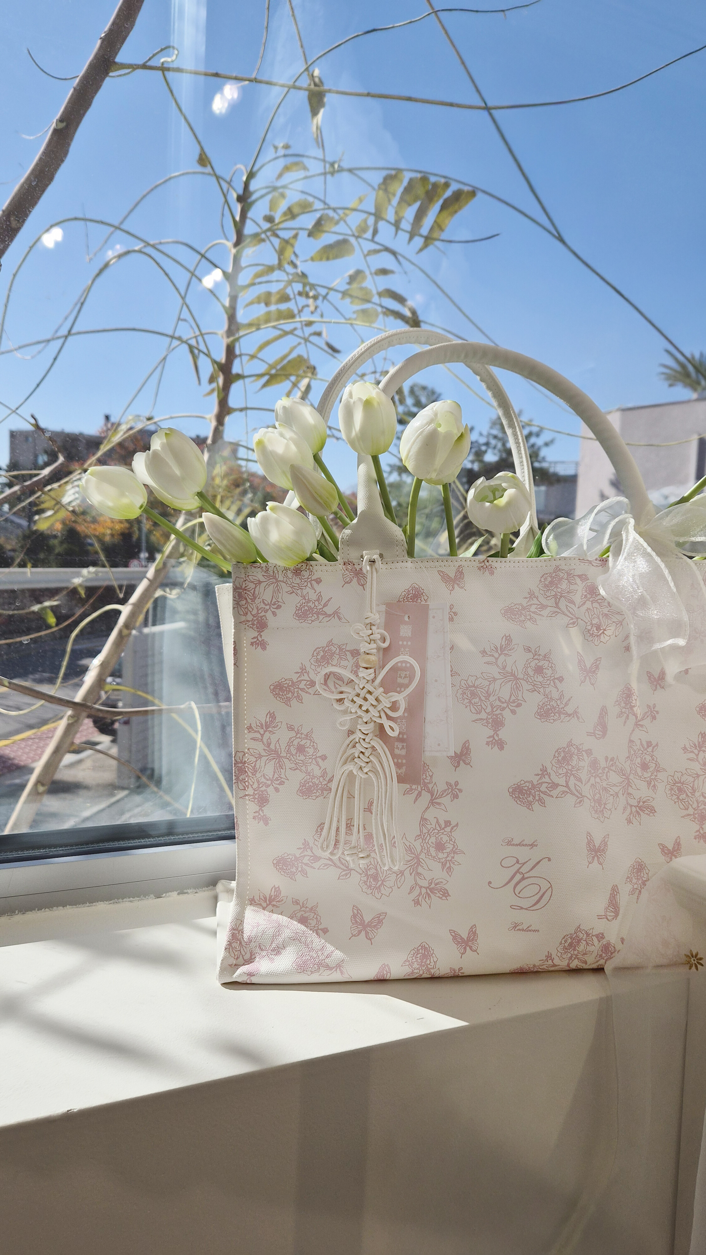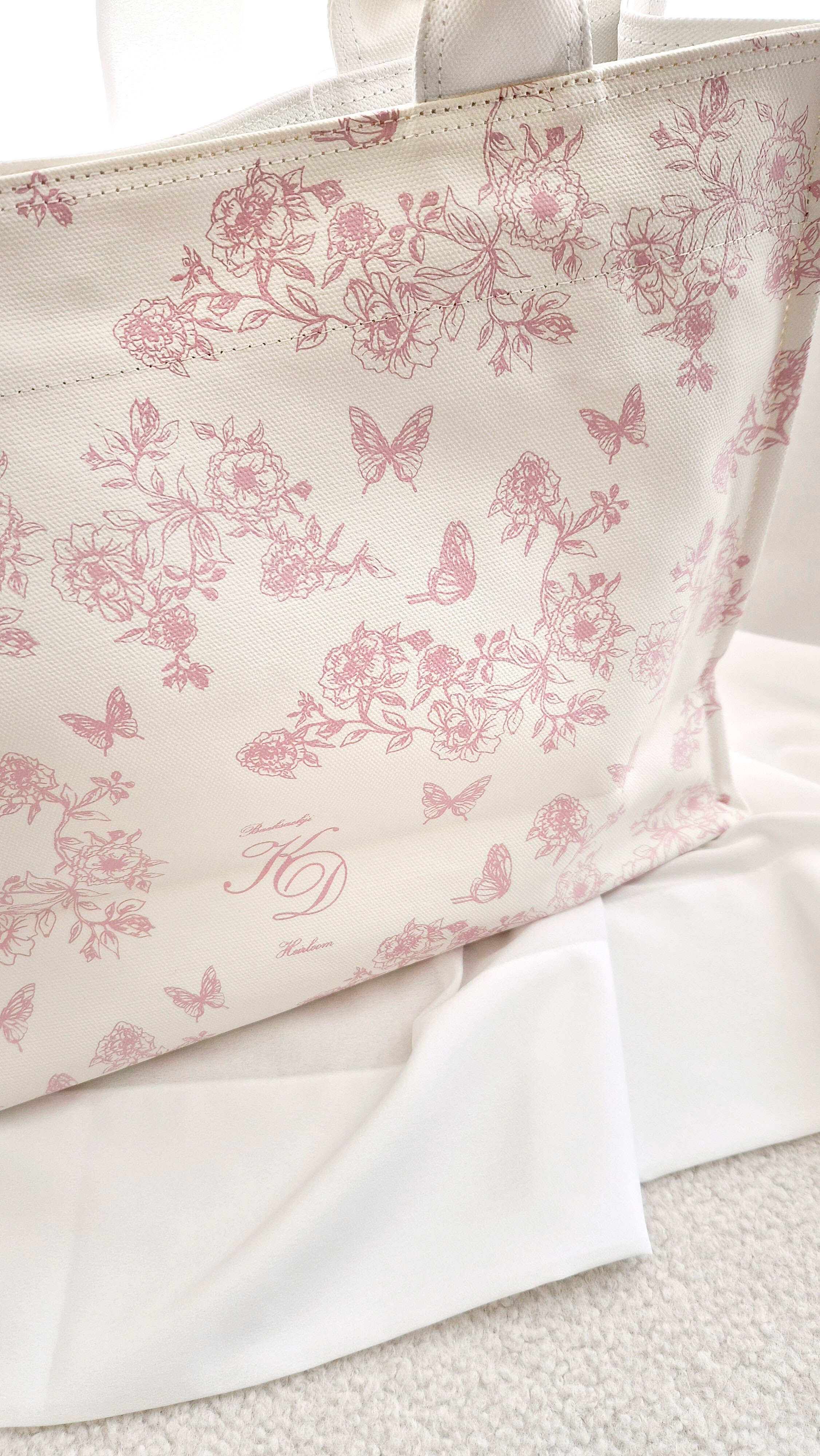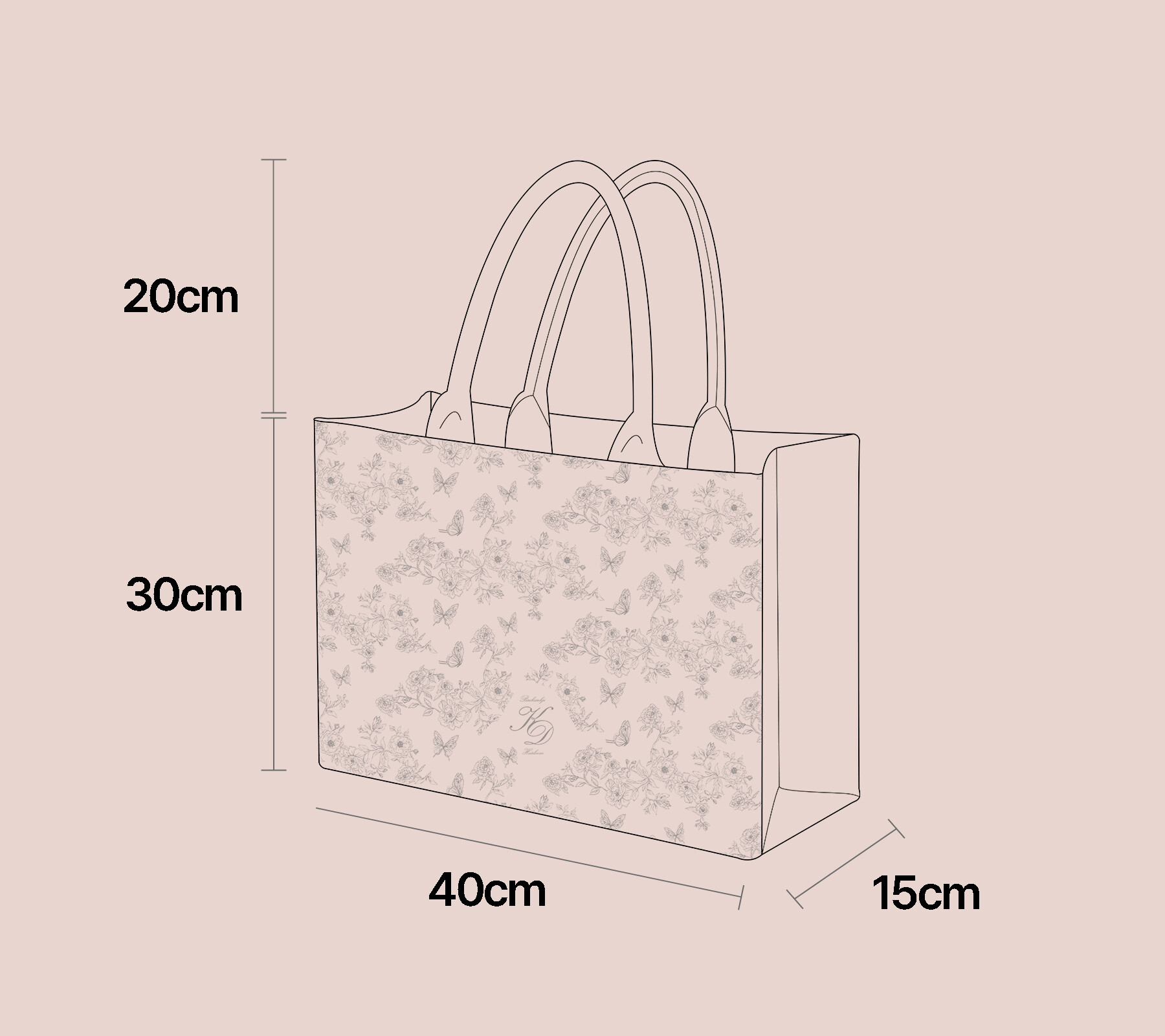 Featuring a soft ivory base adorned with K-Dress’s signature floral and butterfly motifs, it captures an effortlessly elegant and romantic mood at a glance. Crafted in a generous size with durable fabric, the bag is perfect not only for everyday use but also as a stylish travel companion. An inner pocket and magnetic closure add both practicality and security, making it as functional as it is refined. Bring a touch of K-Dress’s signature charm into your daily life with this timeless shopper bag, designed to make every day feel a little more special.