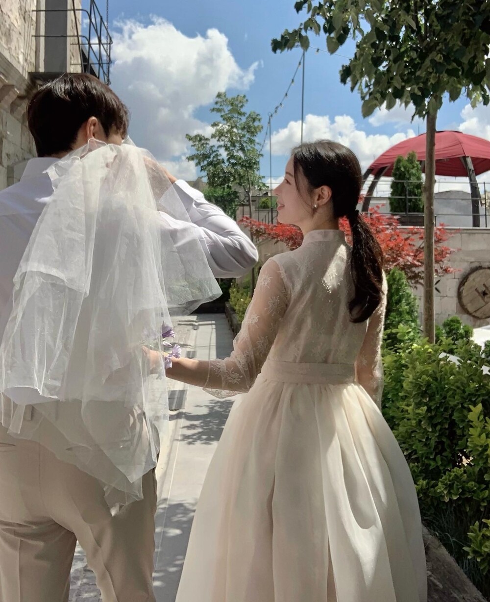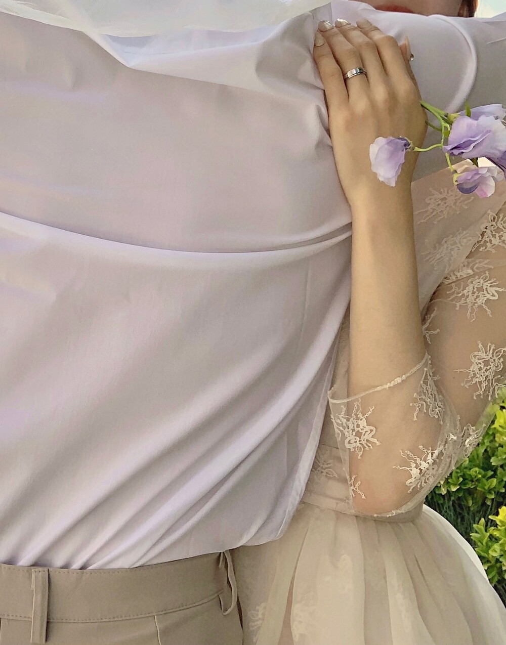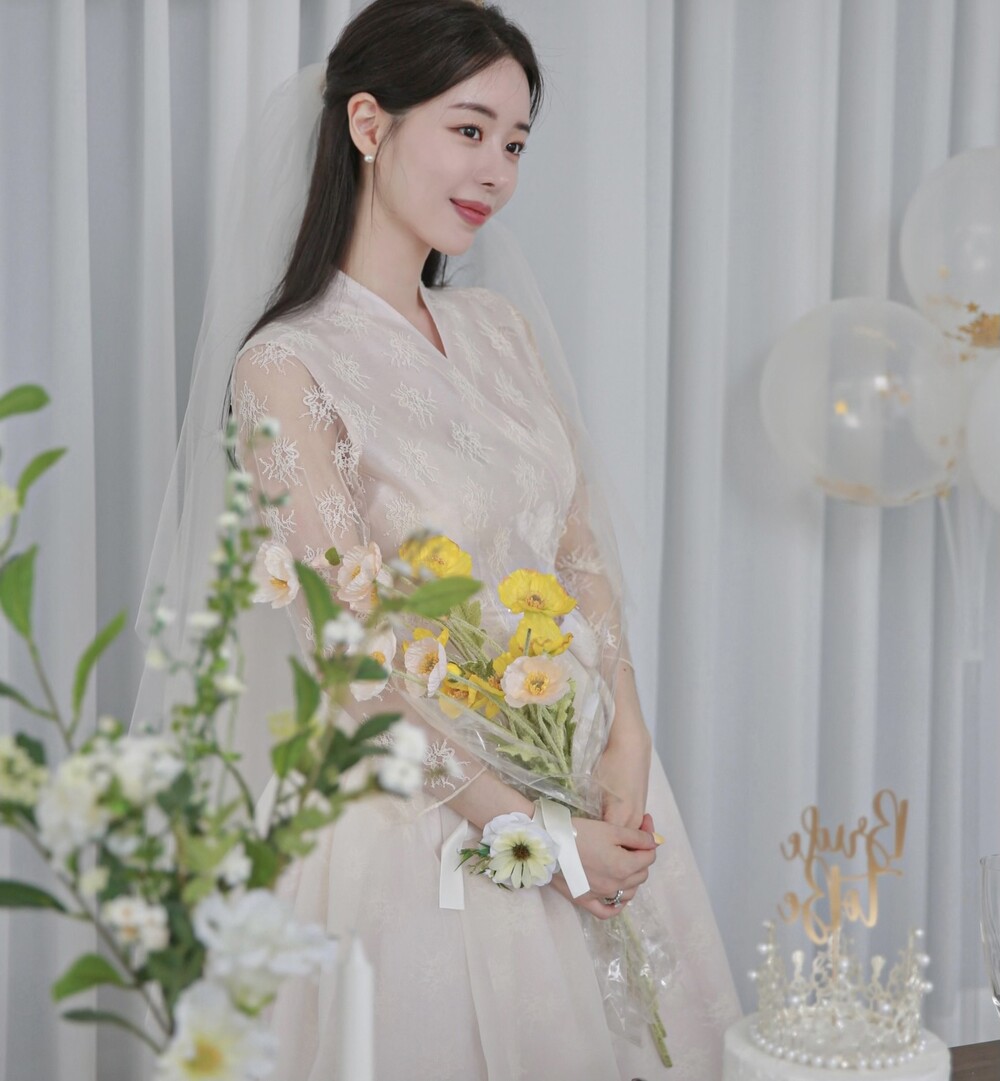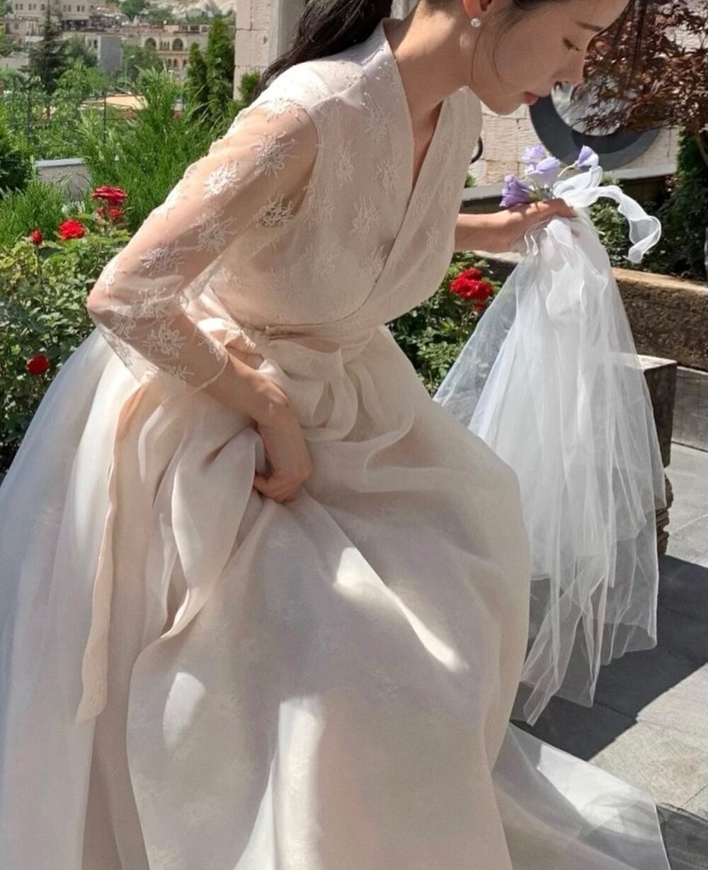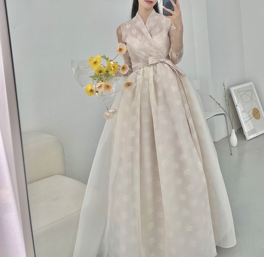 This soft beige dress exudes an elegant and feminine charm. Designed in a wrap style reminiscent of the traditional cheolik silhouette, it features an all-over delicate lace fabric that adds a refined touch. The sheer 3/4 sleeves make it light and comfortable to wear in any season. The skirt flows out into a voluminous A-line shape, creating graceful movement, while the full-length hem—slightly grazing the floor on a 162cm model wearing size S makes it perfect for both formal occasions and special events.