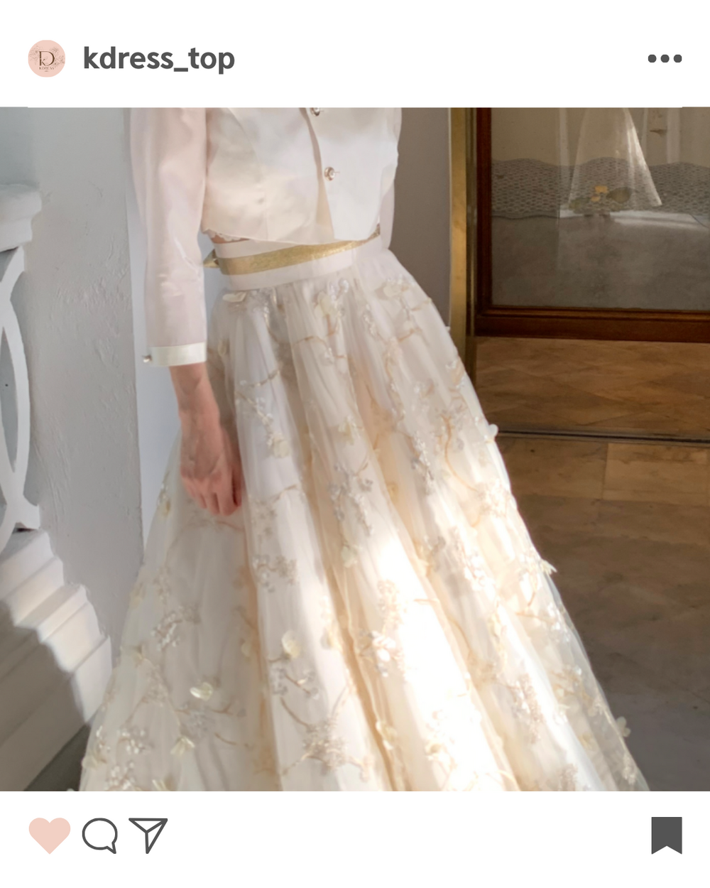 일반 스커트의 3배 이상의 원단을 사용해 풍성하게 퍼지는 훌 스커트에는 입체적인 꽃잎 장식과 금사로 수놓은 섬세한 줄기 패턴이 더해져 우아한 입체감이 담았습니다. 스커트 허리에는 치마자락과 같은 금사 톤의 골드띠가 덧대어져, 움직임이 있을 때마다 크롭 자켓 아래로 자연스럽게 비쳐 은근한 세련미를 더하였습니다.