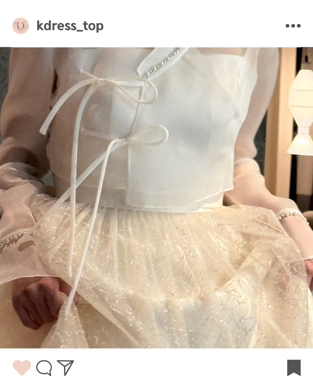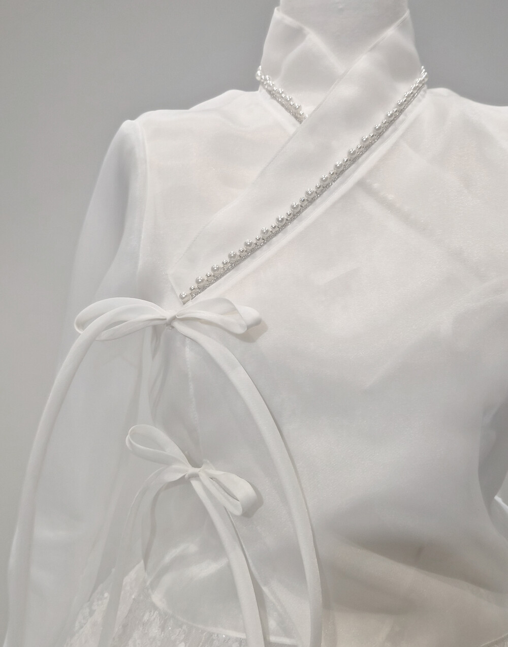 전통 한복 저고리의 실루엣을 서양식 블라우스 감성으로 재해석하였습니다. 은은하게 비치는 시스루 소재로 부드럽고 여성스러운 분위기를 낼 수 있습니다. 깃과 소매 끝에 더해진 진주 장식은 우아한 포인트로 작용하여 전체 스타일에 고급스러움을 더해줍니다.