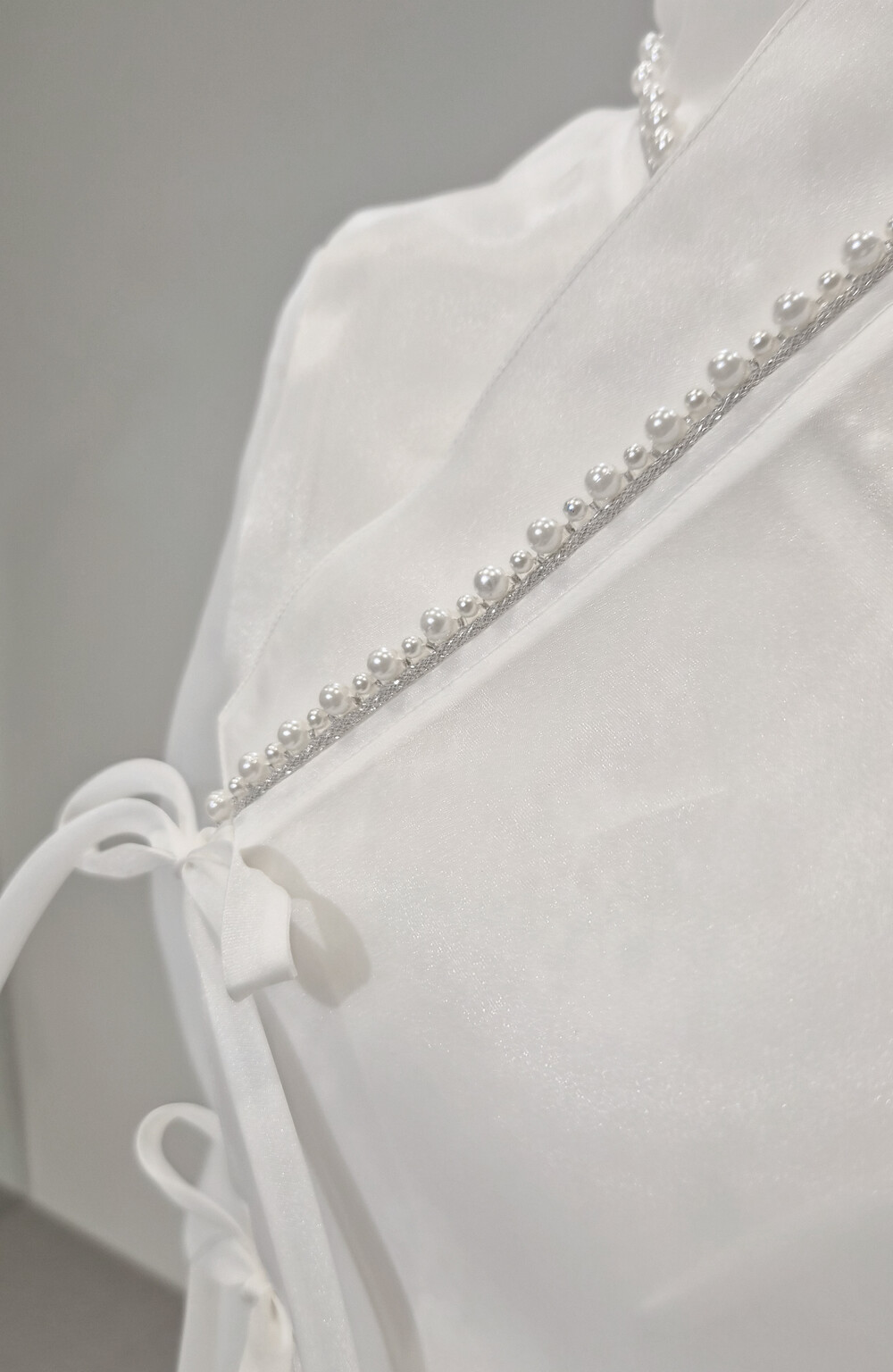 This piece reinterprets the silhouette of a traditional Hanbok jeogori with the sensibility of a Western-style blouse. Made from a subtly sheer fabric, it creates a soft and feminine look. Pearl embellishments along the collar and sleeve cuffs add a graceful touch, enhancing the overall elegance of the outfit.