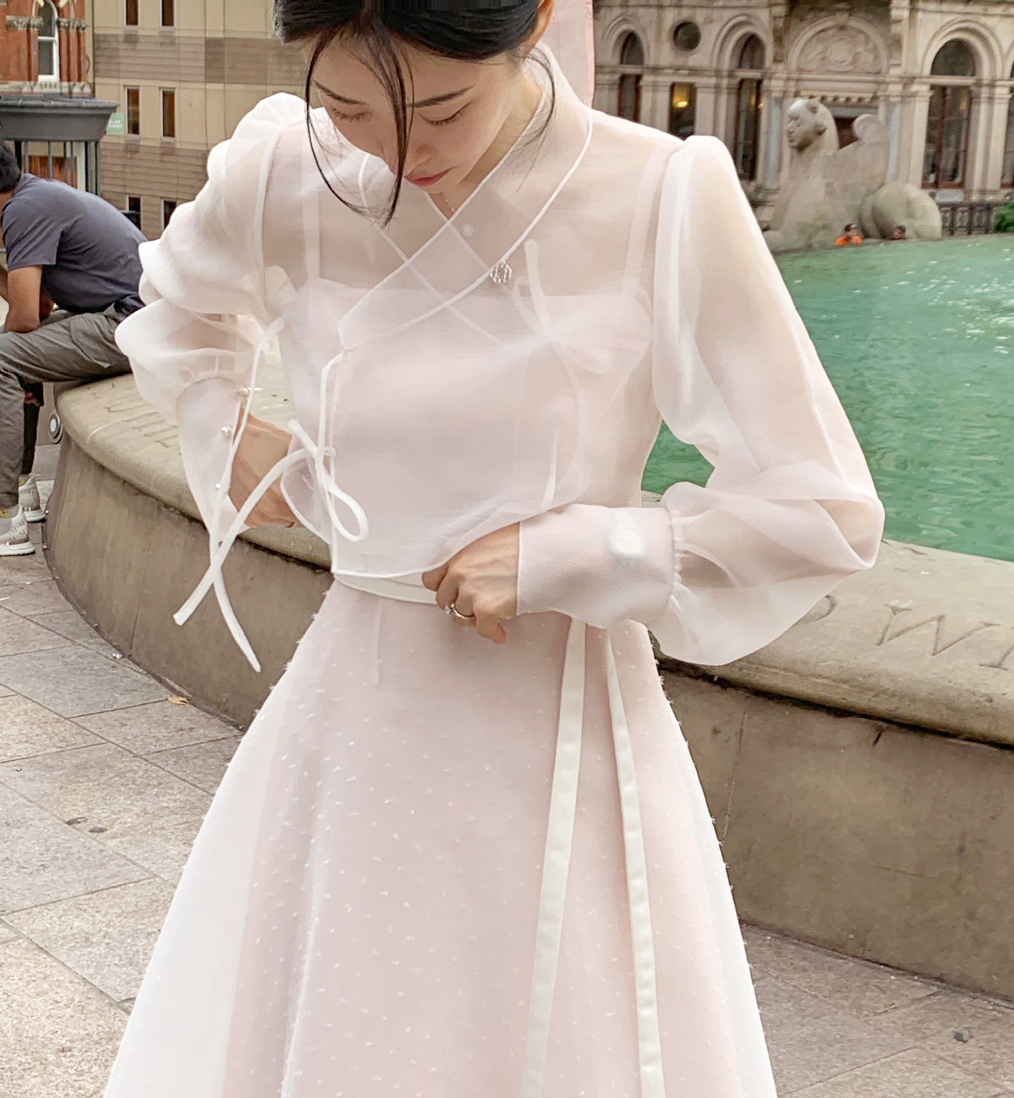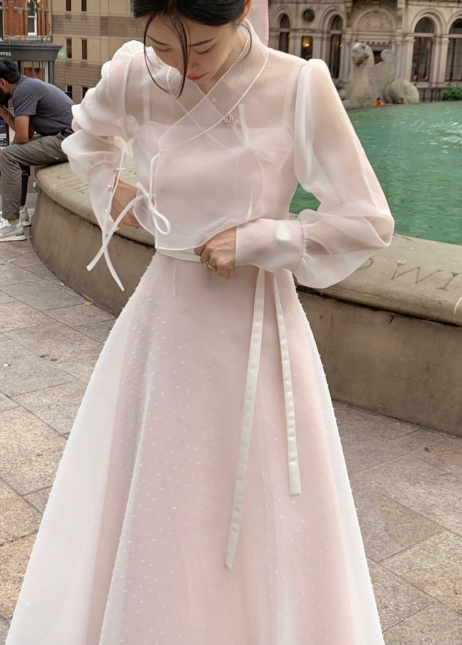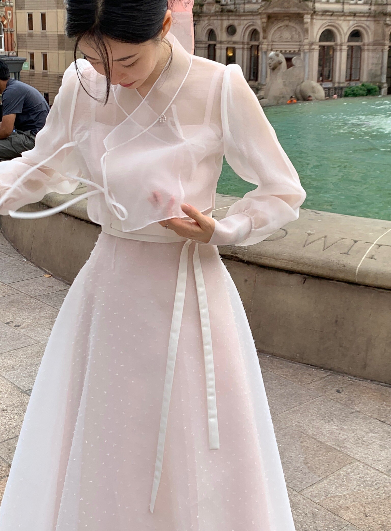 Made from a sheer, lightweight fabric, this blouse creates an elegant and airy silhouette. The signature collar and ribbon tie borrowed from traditional Korean hanbok are softened with graceful curves, blending effortlessly whether layered over a simple dress or paired with a hanbok skirt. The voluminous puff sleeves add a lovely, romantic touch, completing a look that’s both feminine and timeless.