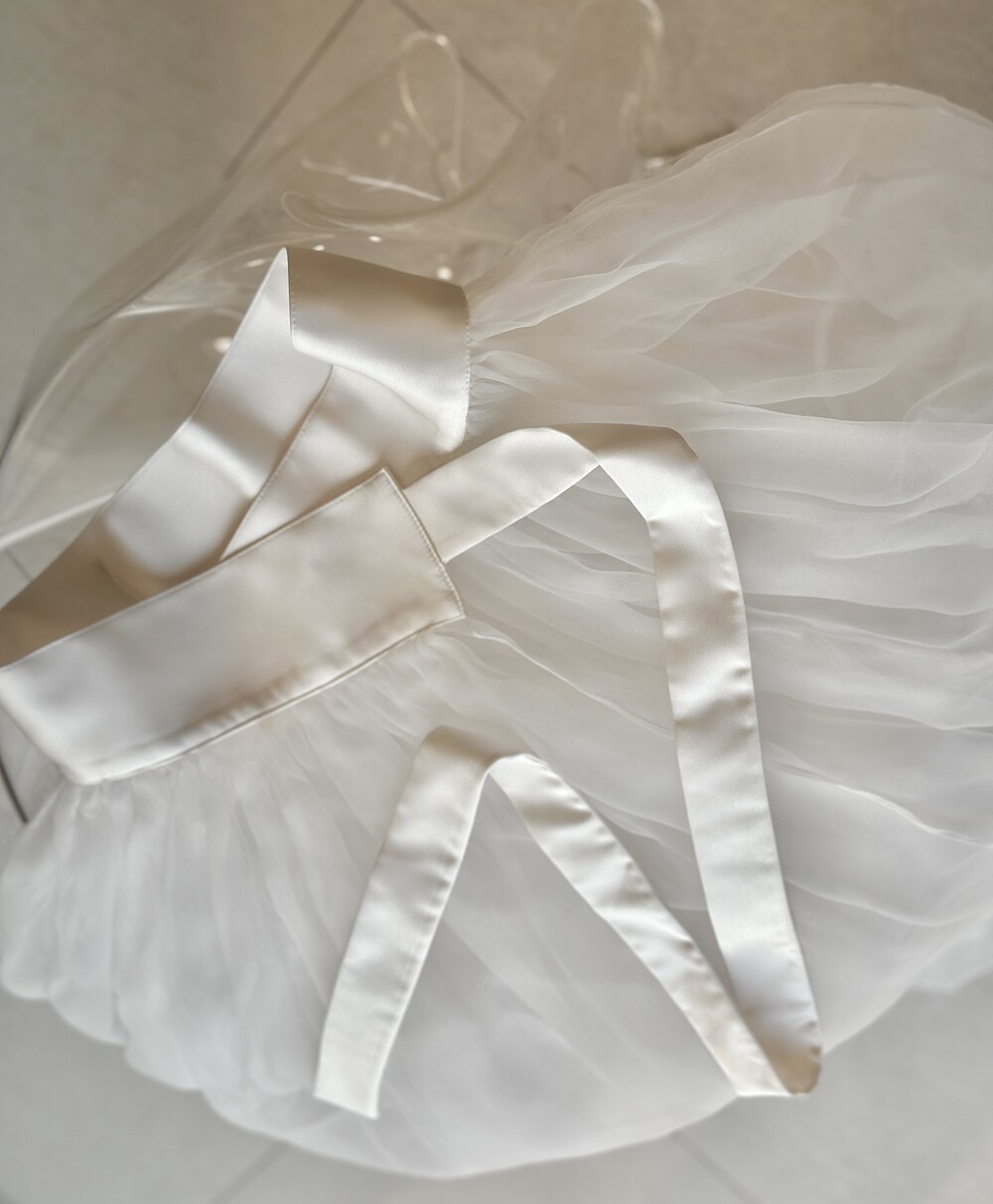 가볍고 투명한 소재로 제작되어, 전체적으로 단정하고 깔끔하되 우아한 분위기를 연출하며 드레스에 깊이감과 입체감을 더해줍니다.