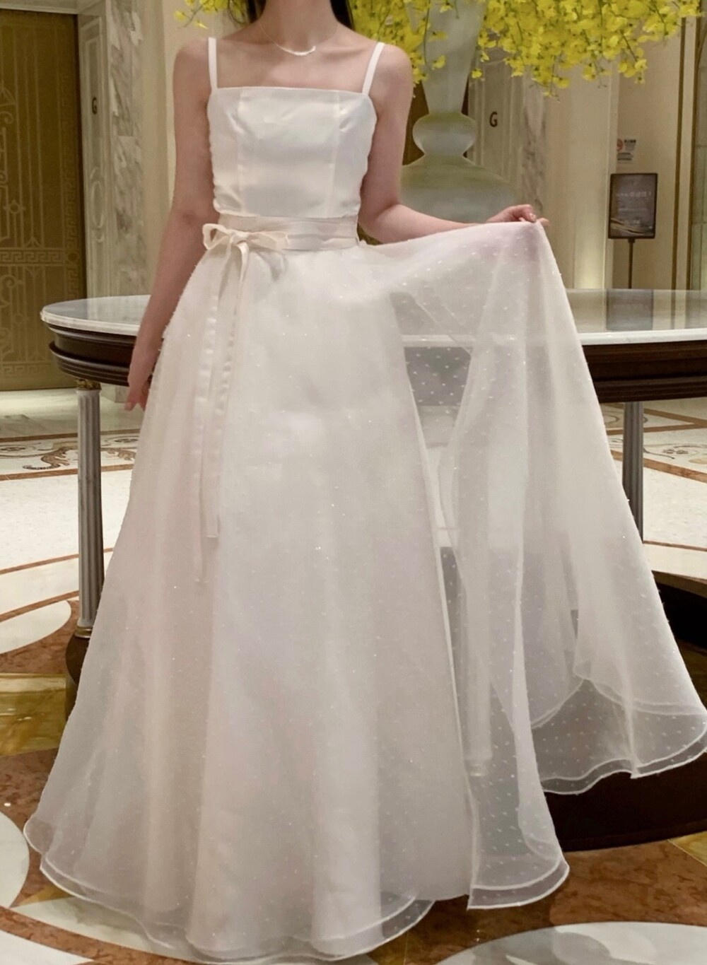 The Shine overskirt, delicately infused with subtle shimmer, adds a radiant touch to your look. Layered over a dress, it creates graceful volume and completes a silhouette that’s both elegant and romantic.