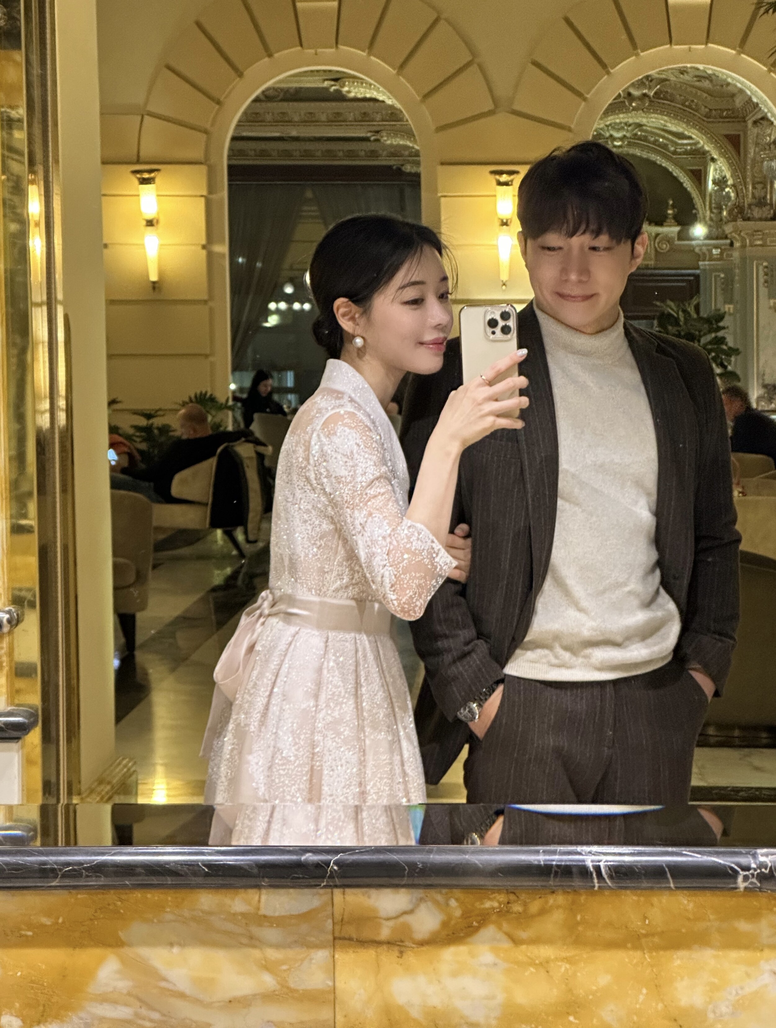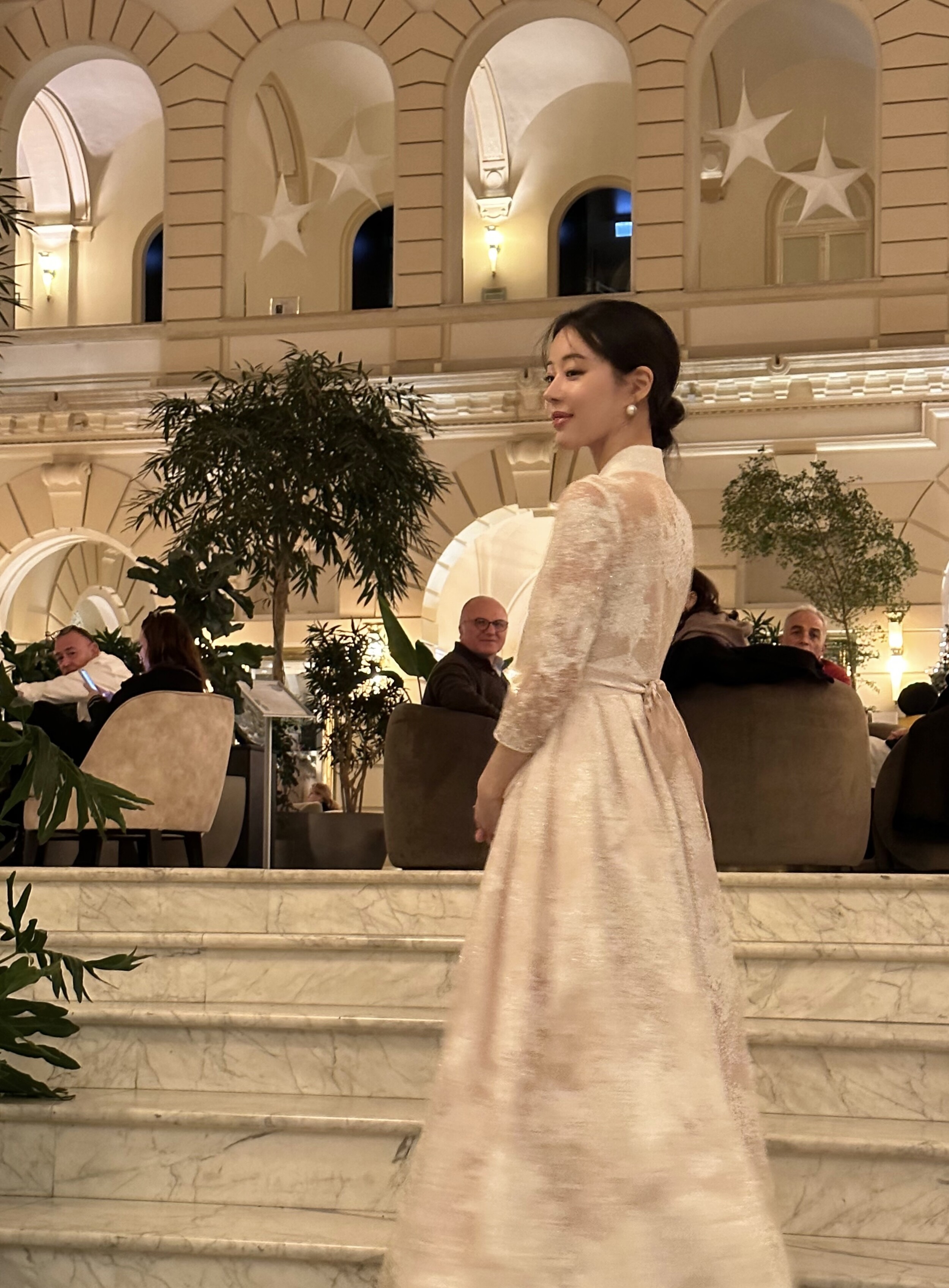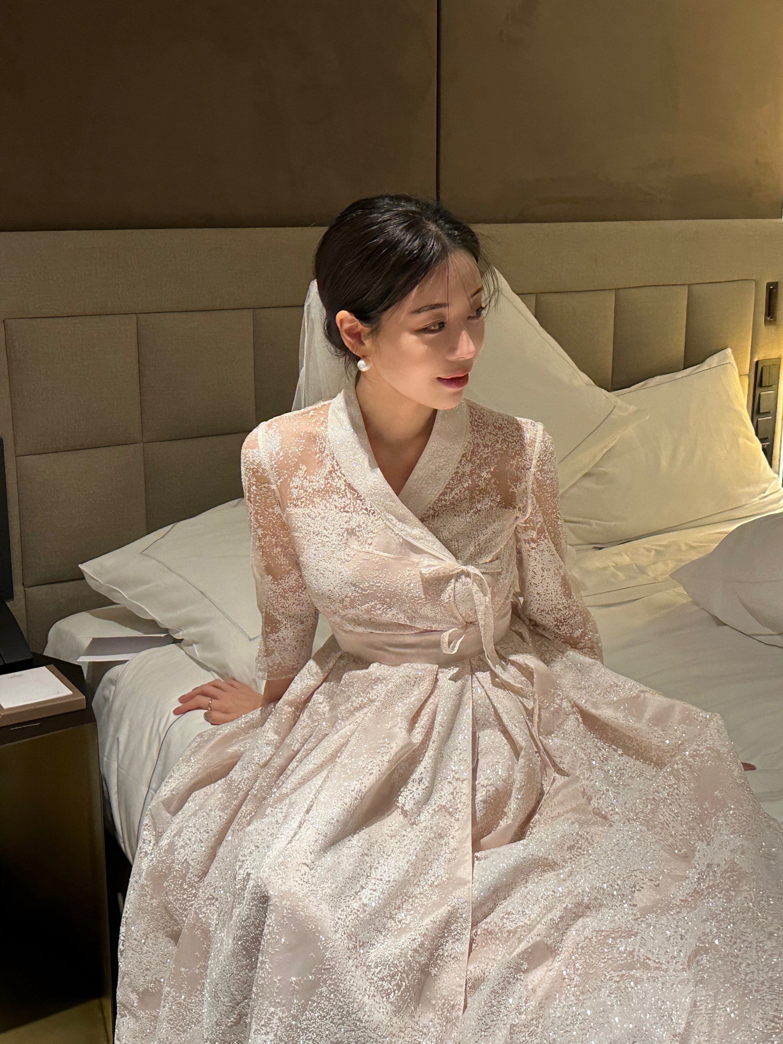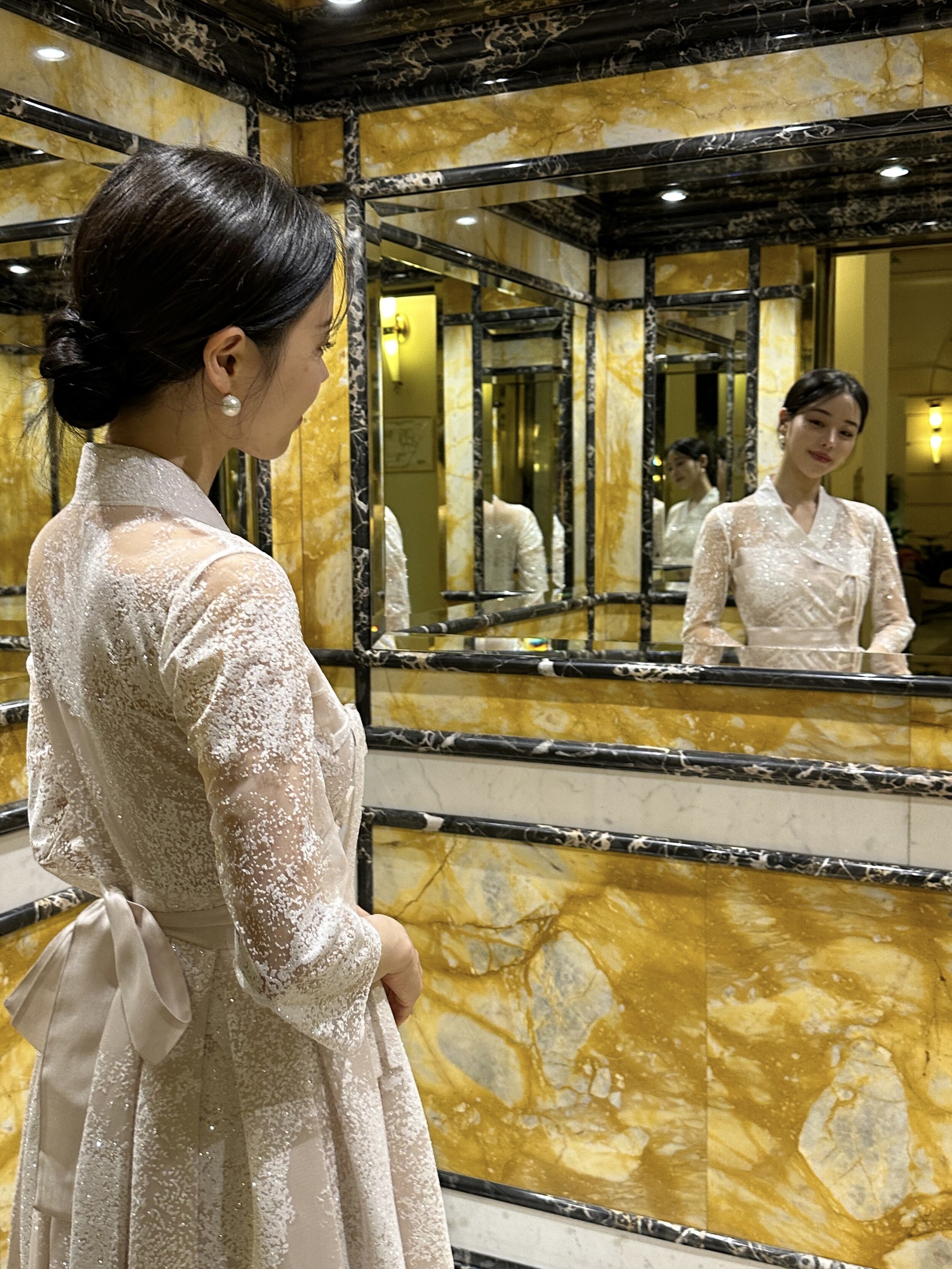The soft pink hue, reminiscent of pearl, is delicately woven into a snowflake-like shimmer fabric made from premium Italian imported material. Its weight and refined texture give the dress a luxurious presence that captures the eye. While inspired by traditional Hanbok, the neckline is gently softened, and the sheer three-quarter sleeves make it suitable for any season. With a full length of 134cm, it gracefully reaches the tops of the feet on someone 162cm tall, making it a perfect choice for formal occasions.