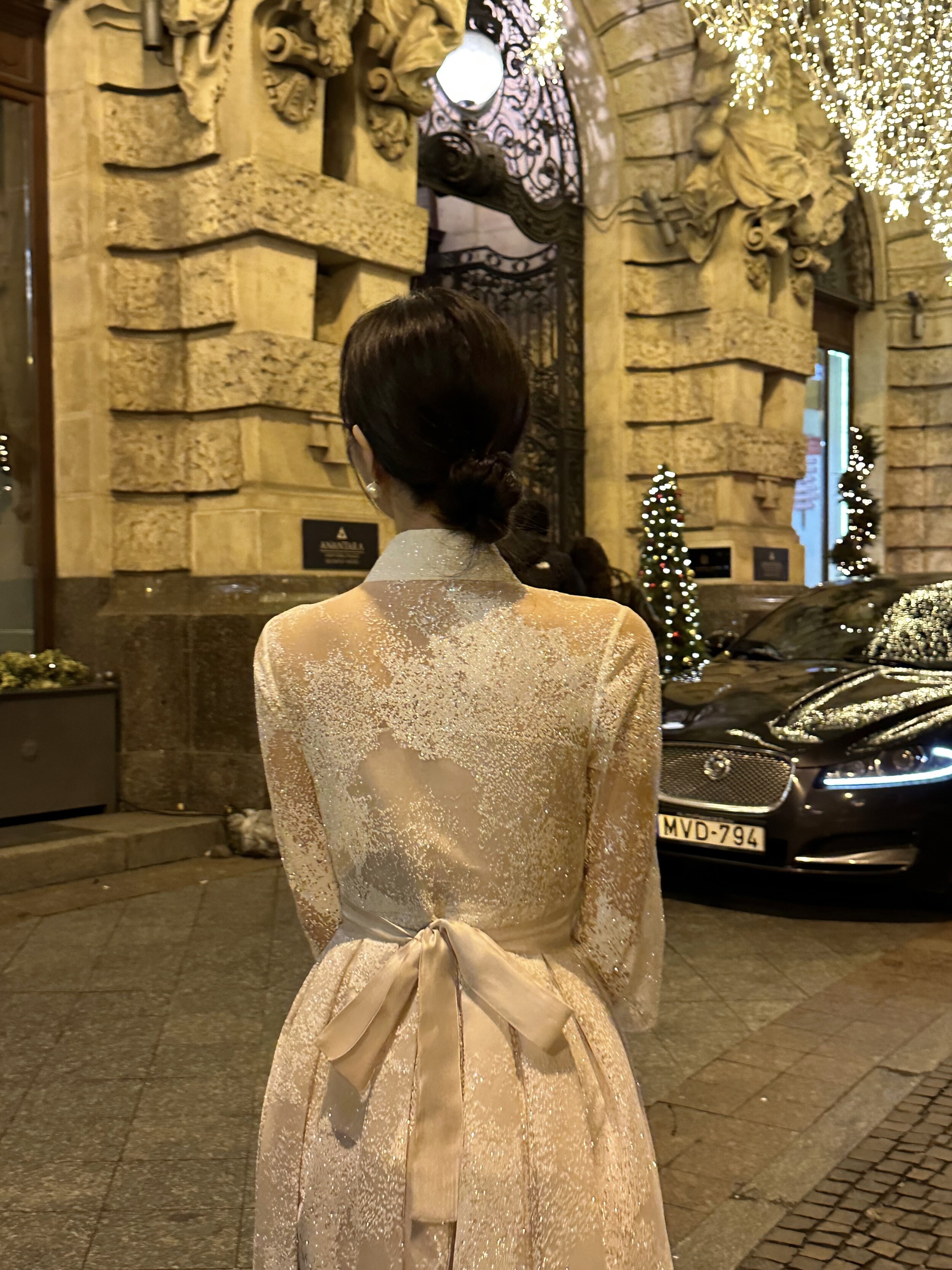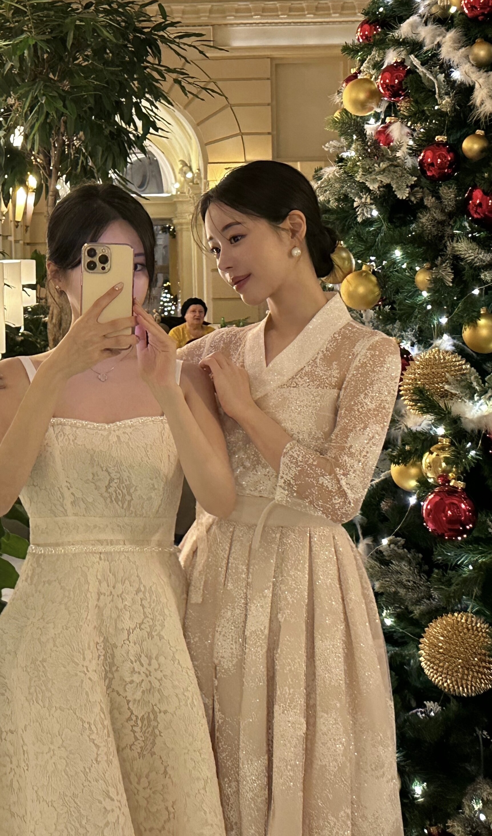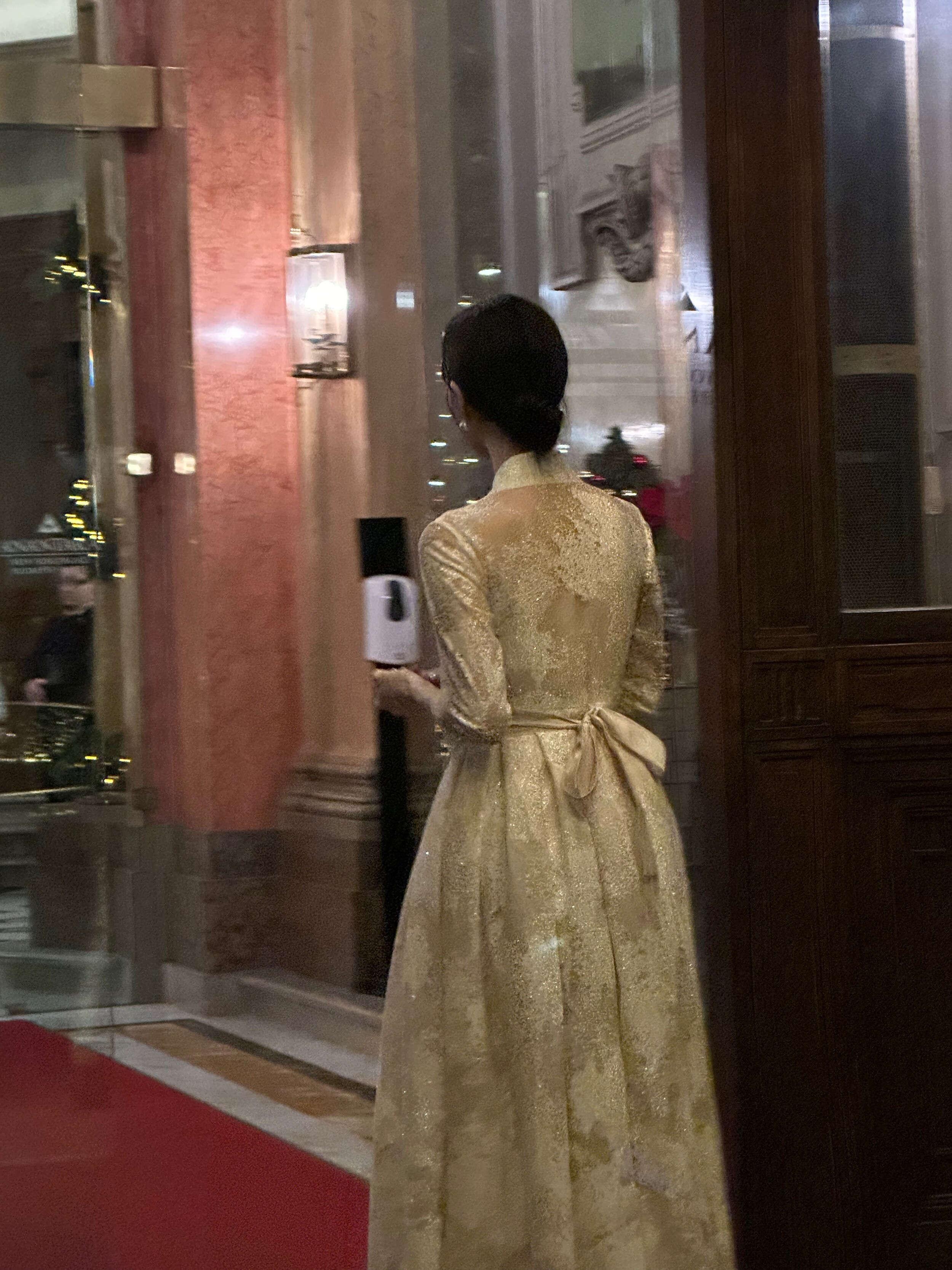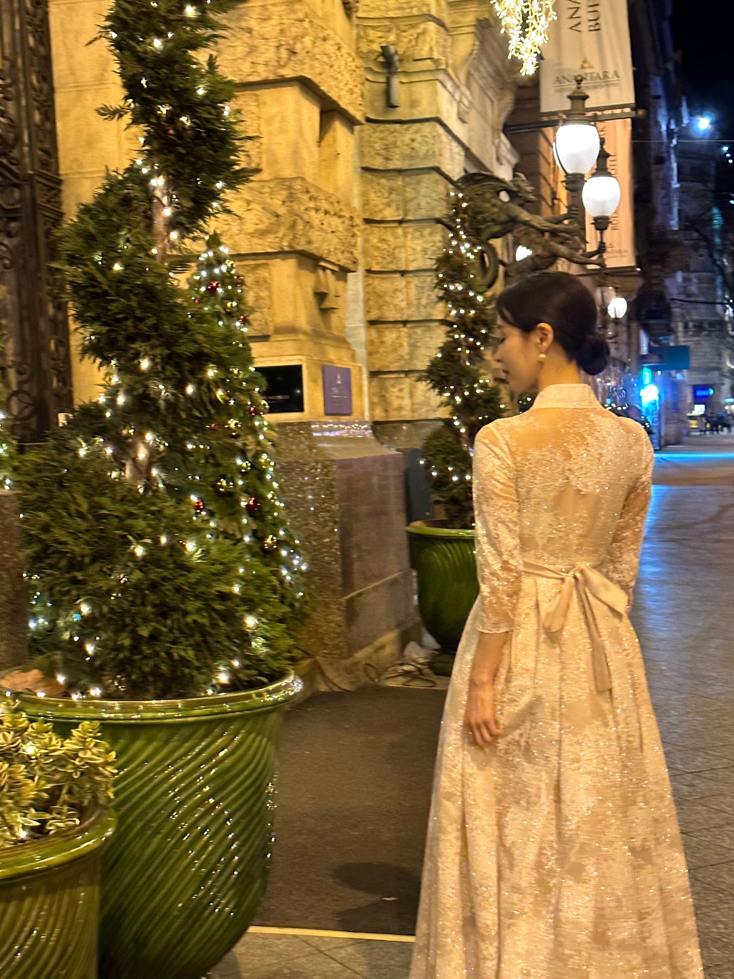 The soft pink hue, reminiscent of pearl, is delicately woven into a snowflake-like shimmer fabric made from premium Italian imported material. Its weight and refined texture give the dress a luxurious presence that captures the eye. While inspired by traditional Hanbok, the neckline is gently softened, and the sheer three-quarter sleeves make it suitable for any season. With a full length of 134cm, it gracefully reaches the tops of the feet on someone 162cm tall, making it a perfect choice for formal occasions.