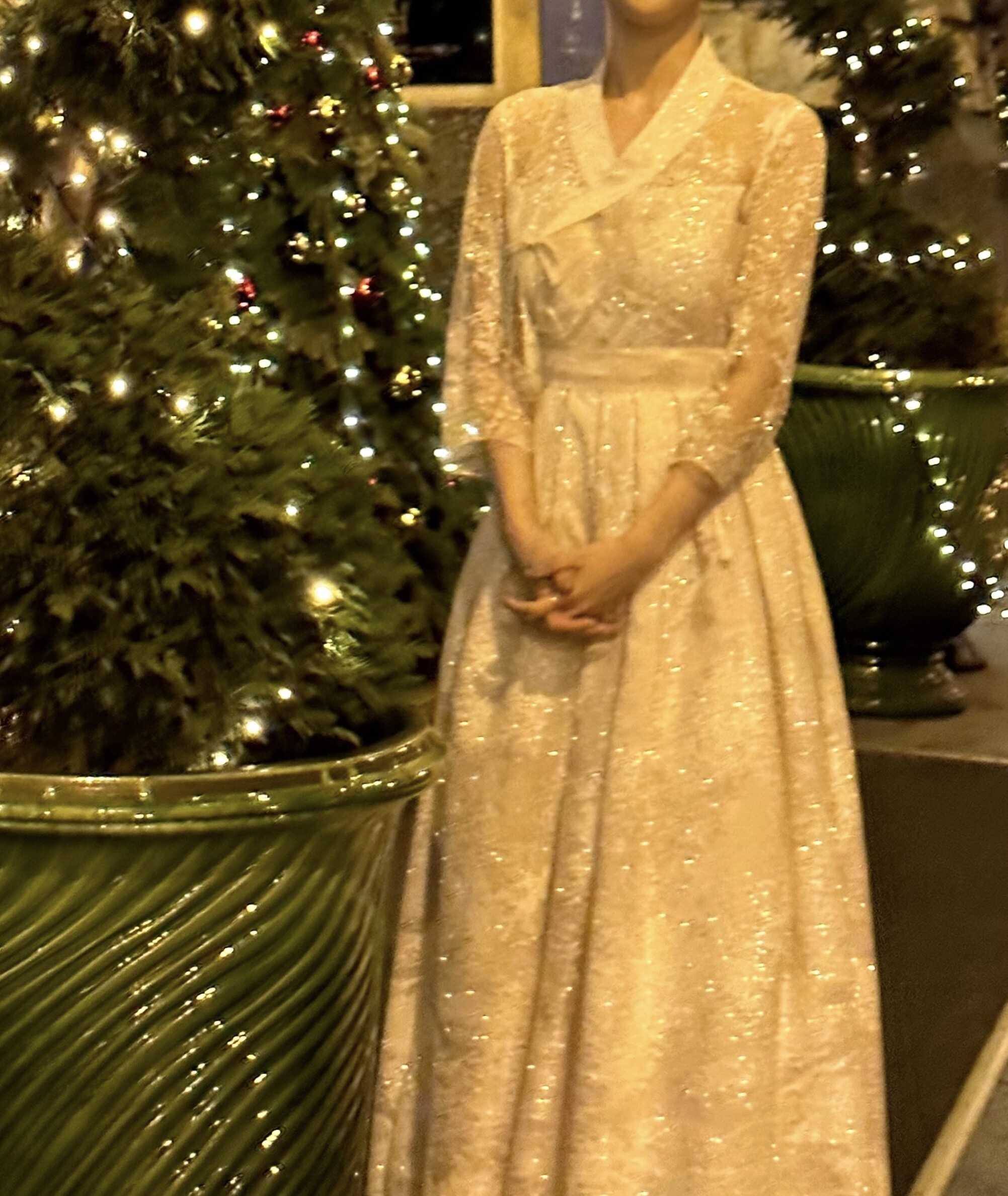 진주빛 컬러에 가까운 은은한 핑크색이 베어 있는 눈꽃 같은 펄 원단은, 대부분이 고가의 이탈리아 수입 소재로 무게감과 섬세한 매력을 지녀 시선을 사로잡습니다. 한복 스타일이지만, 목선을 가볍게 처리하고 7부 길이의 시스루 소매를 더해 계절에 관계없이 착용하기 좋습니다. 162cm 기준 발등까지 오는 134cm의 맥시 기장으로, 격식 있는 자리에도 우아하게 어울립니다.