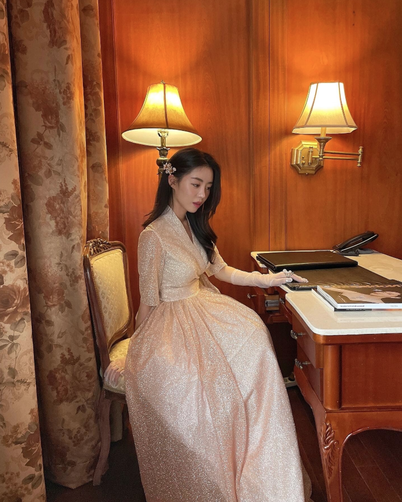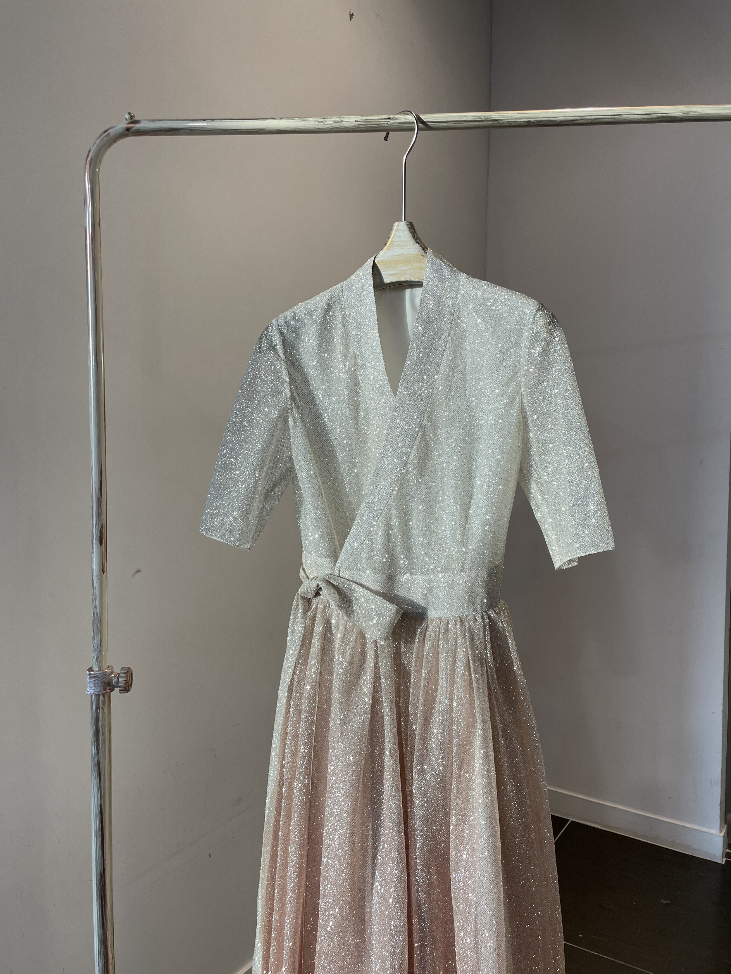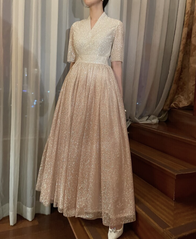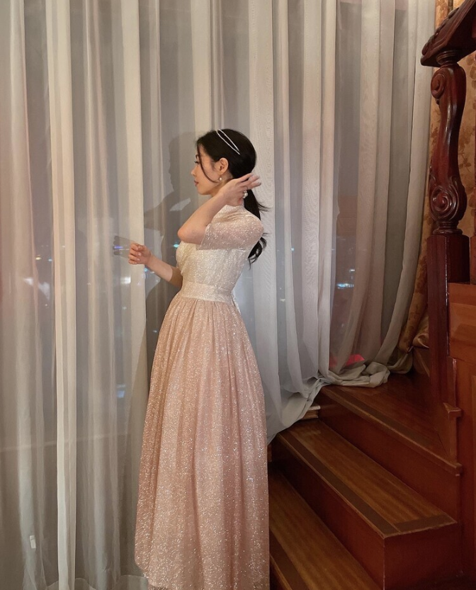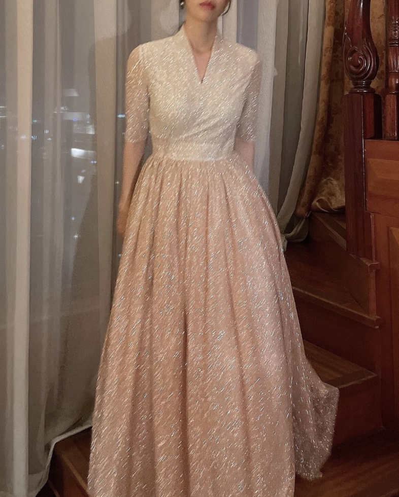 This semi-dress is crafted from a subtly shimmering glitter fabric and features a refined wrap silhouette inspired by the traditional Korean dongjeong neckline. The top is rendered in an ivory tone with delicate sparkles that cascade softly, adding an elegant and modern touch. Below the waist, the full pleated skirt fans out into a graceful A-line shape reminiscent of a hanbok, with a rose gold gradient that enhances its romantic appeal. The curved silhouette of the skirt moves beautifully with each step, catching the light and drawing the eye.