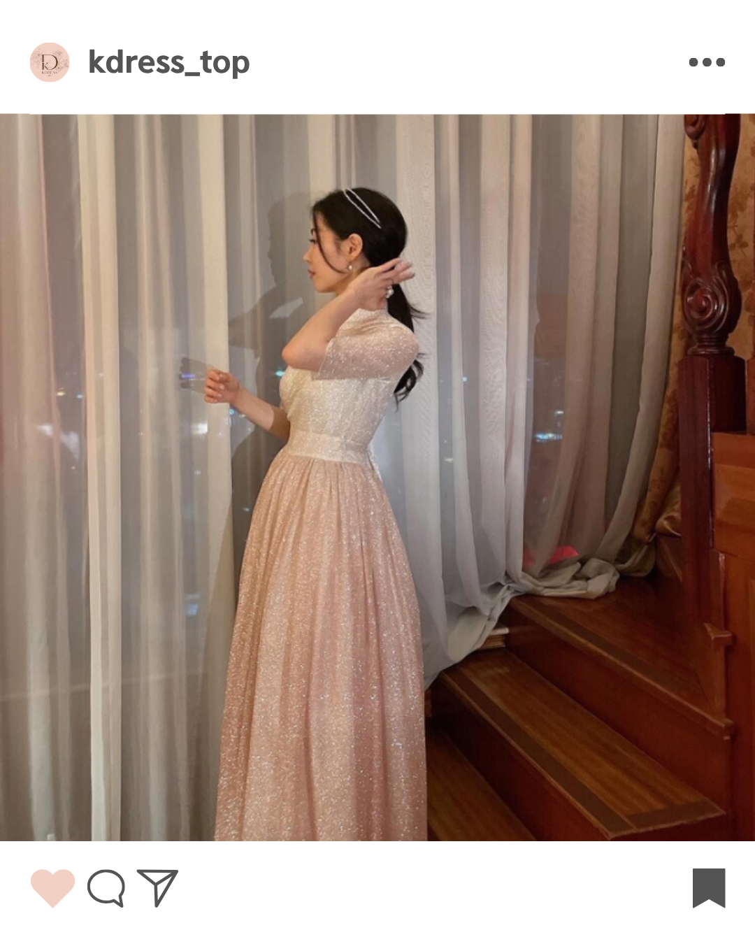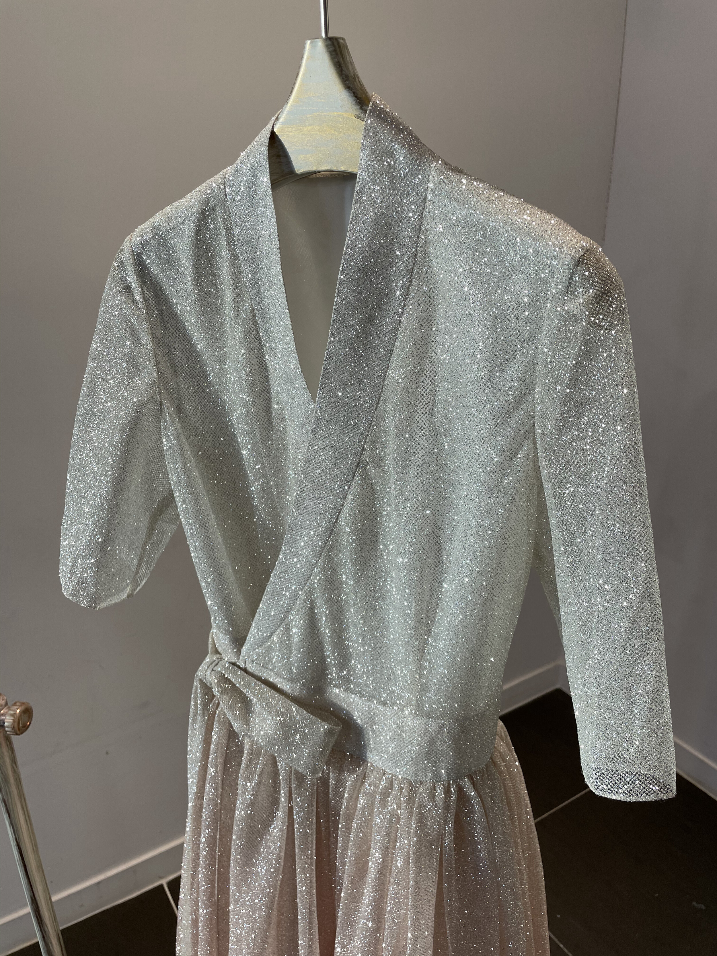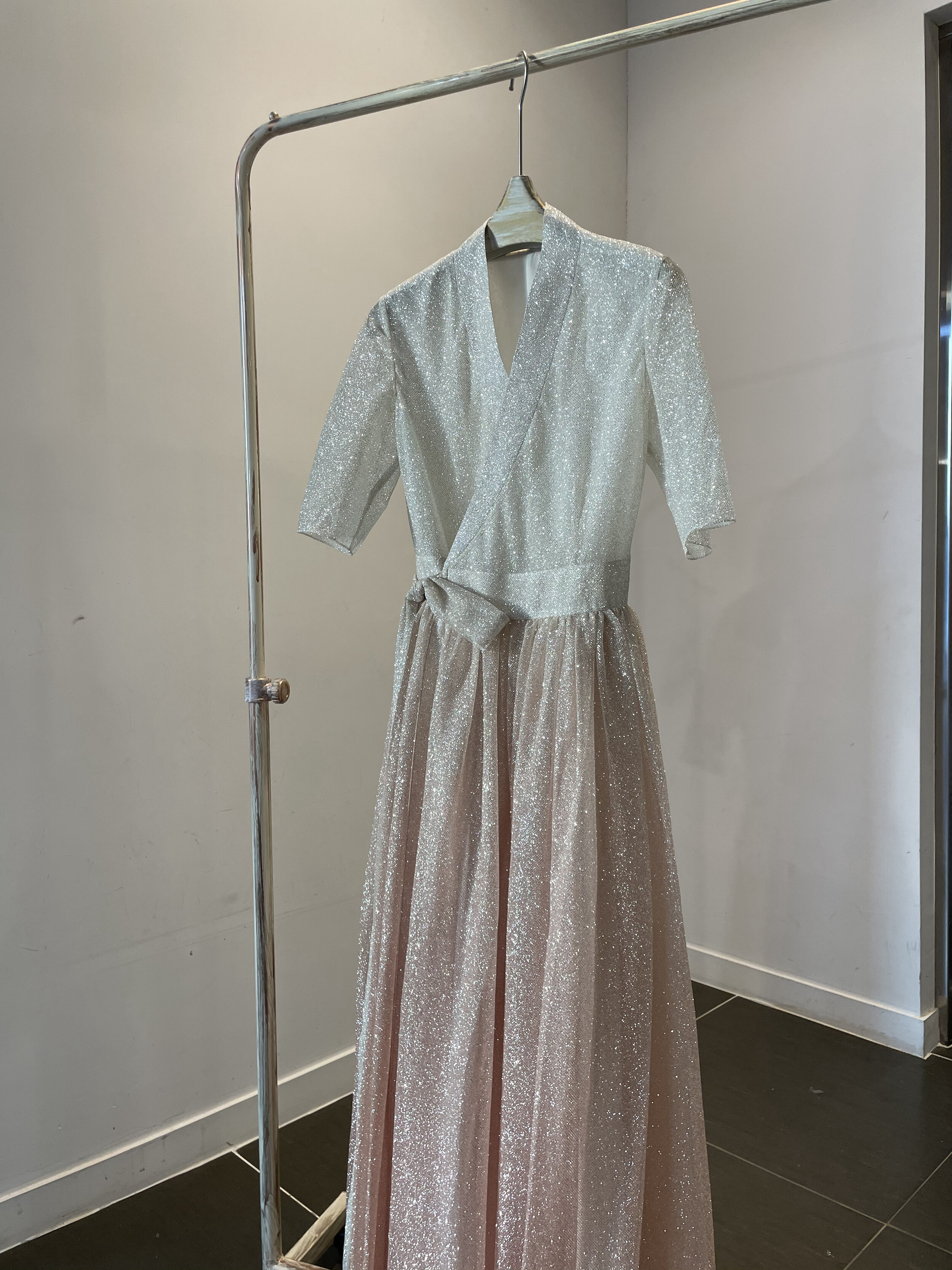 This semi-dress is crafted from a subtly shimmering glitter fabric and features a refined wrap silhouette inspired by the traditional Korean dongjeong neckline. The top is rendered in an ivory tone with delicate sparkles that cascade softly, adding an elegant and modern touch. Below the waist, the full pleated skirt fans out into a graceful A-line shape reminiscent of a hanbok, with a rose gold gradient that enhances its romantic appeal. The curved silhouette of the skirt moves beautifully with each step, catching the light and drawing the eye.