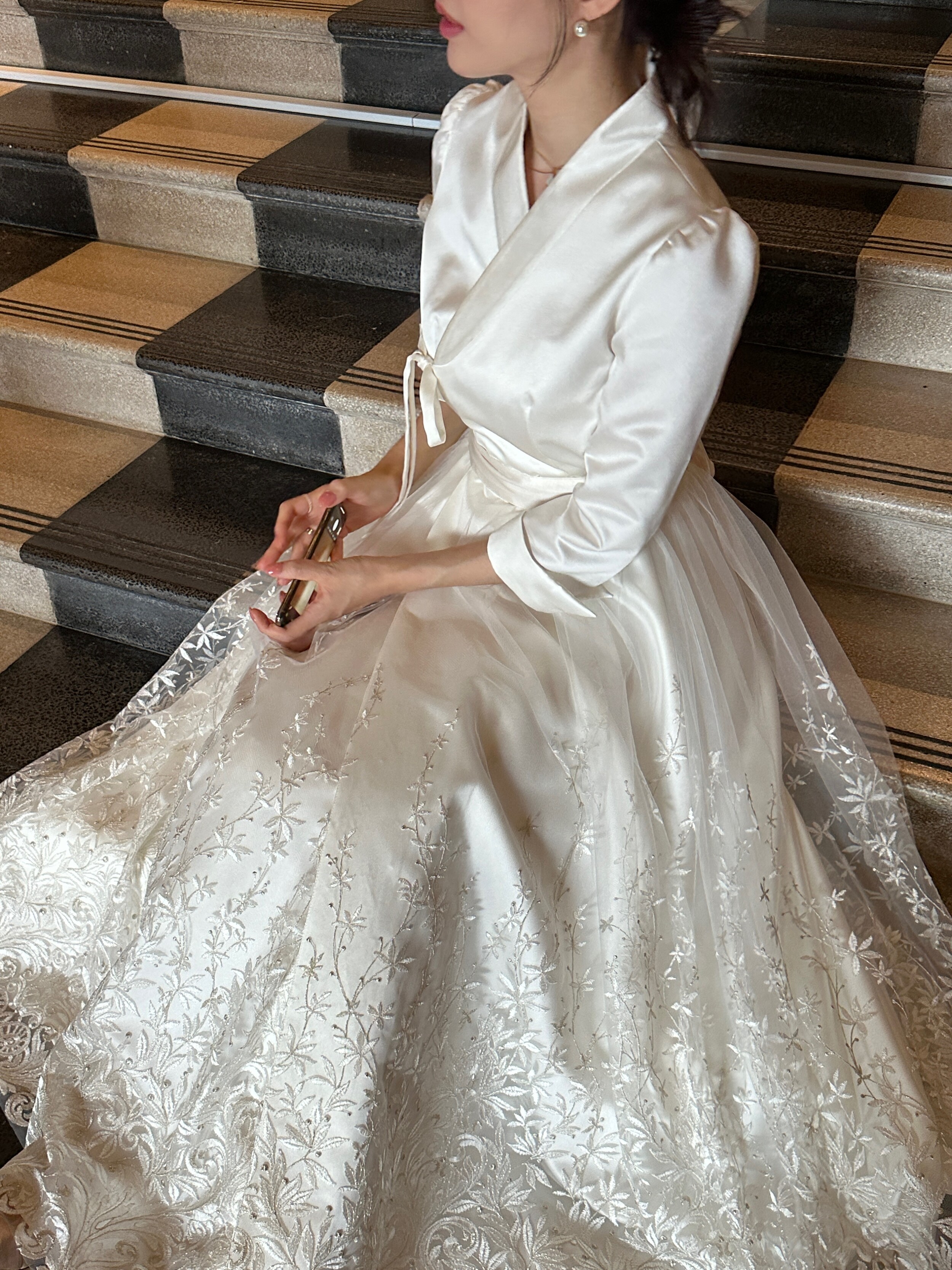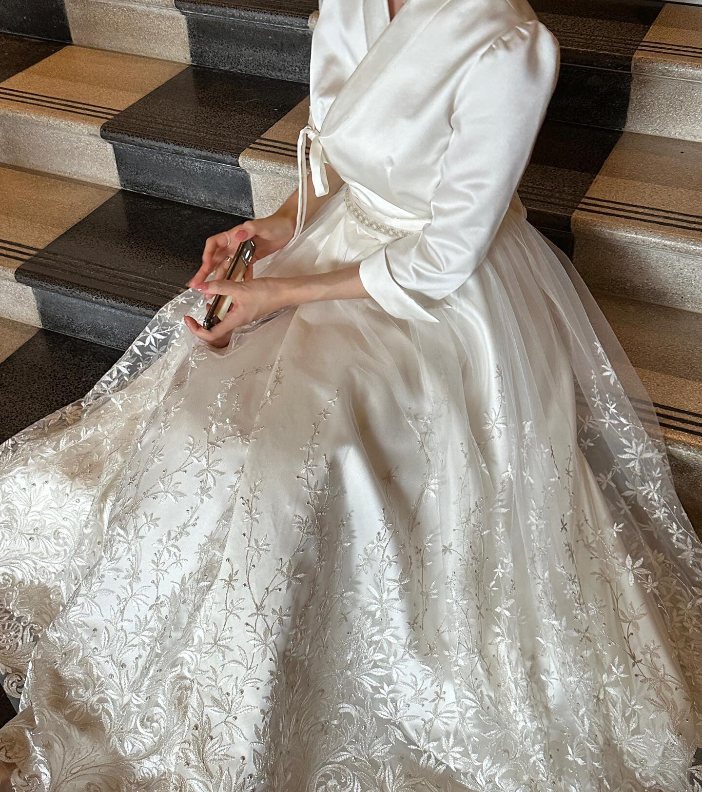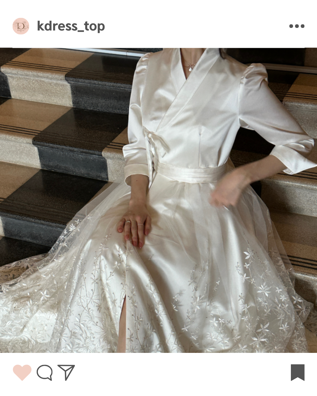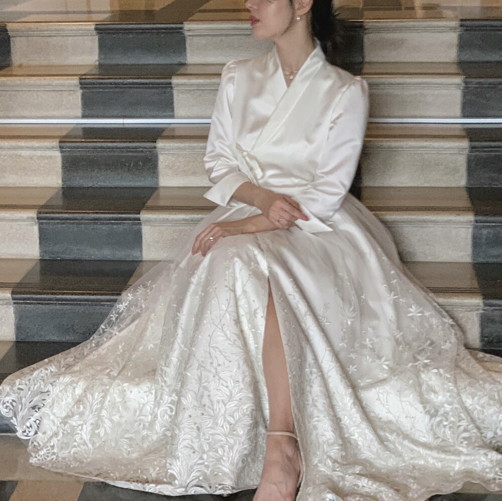 상의 부분은 고급스러운 광택감으로 품격 있는 실루엣을 완성하고, 치마자락에는 산호를 닮은 레이스가 피어나는 원단을 아낌없이 사용하여 풍성함을 더했습니다.