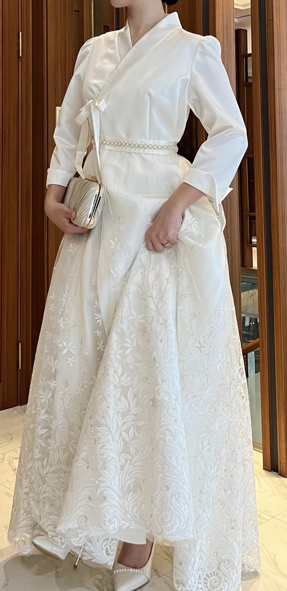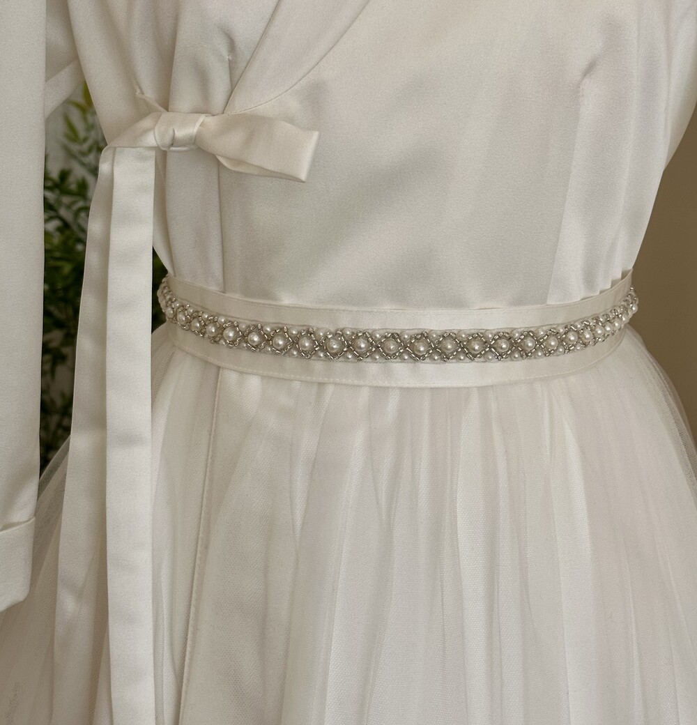 벨트 부분에 진주 비딩을 추가하여 업그레이드 시켰습니다.