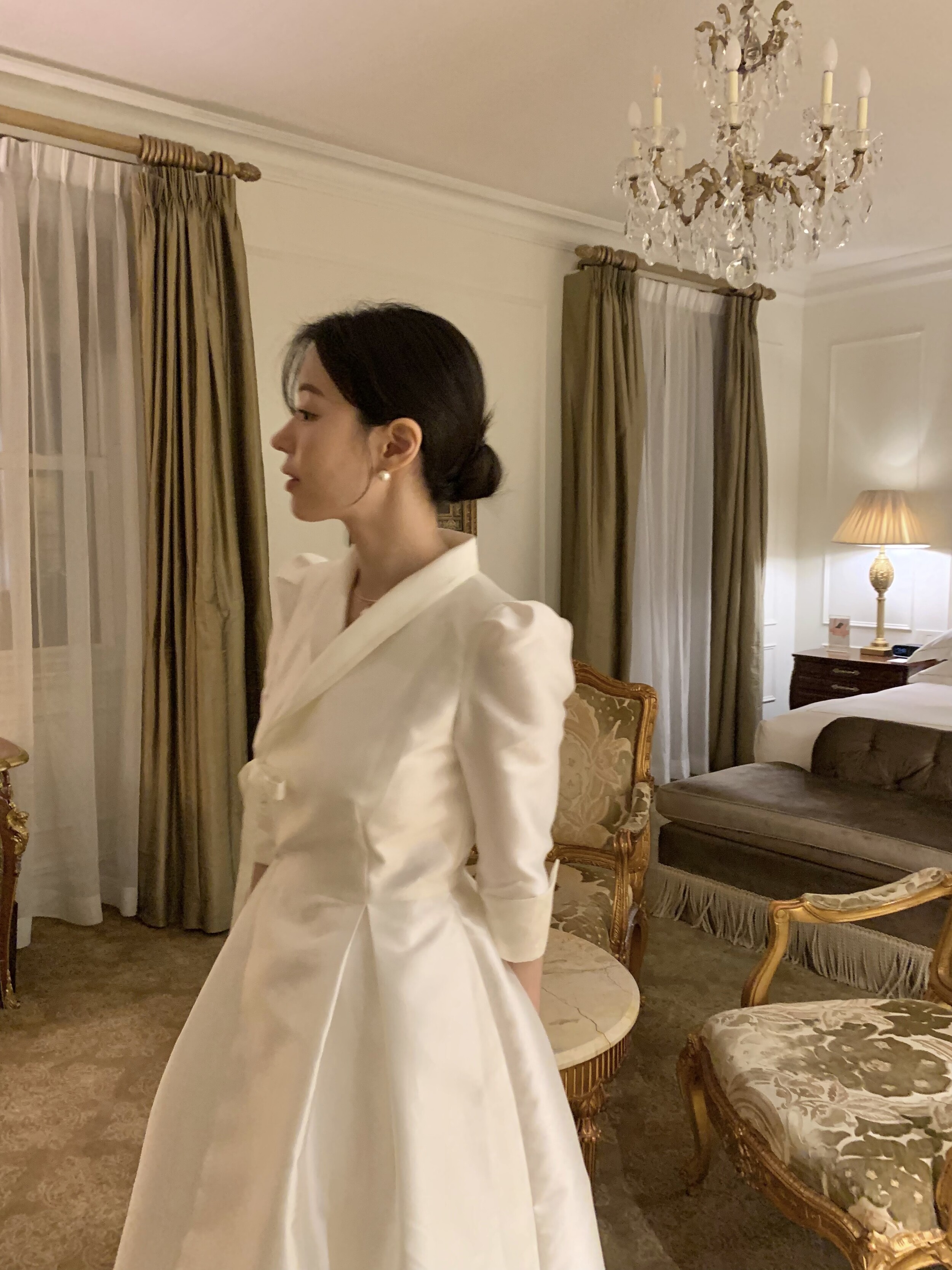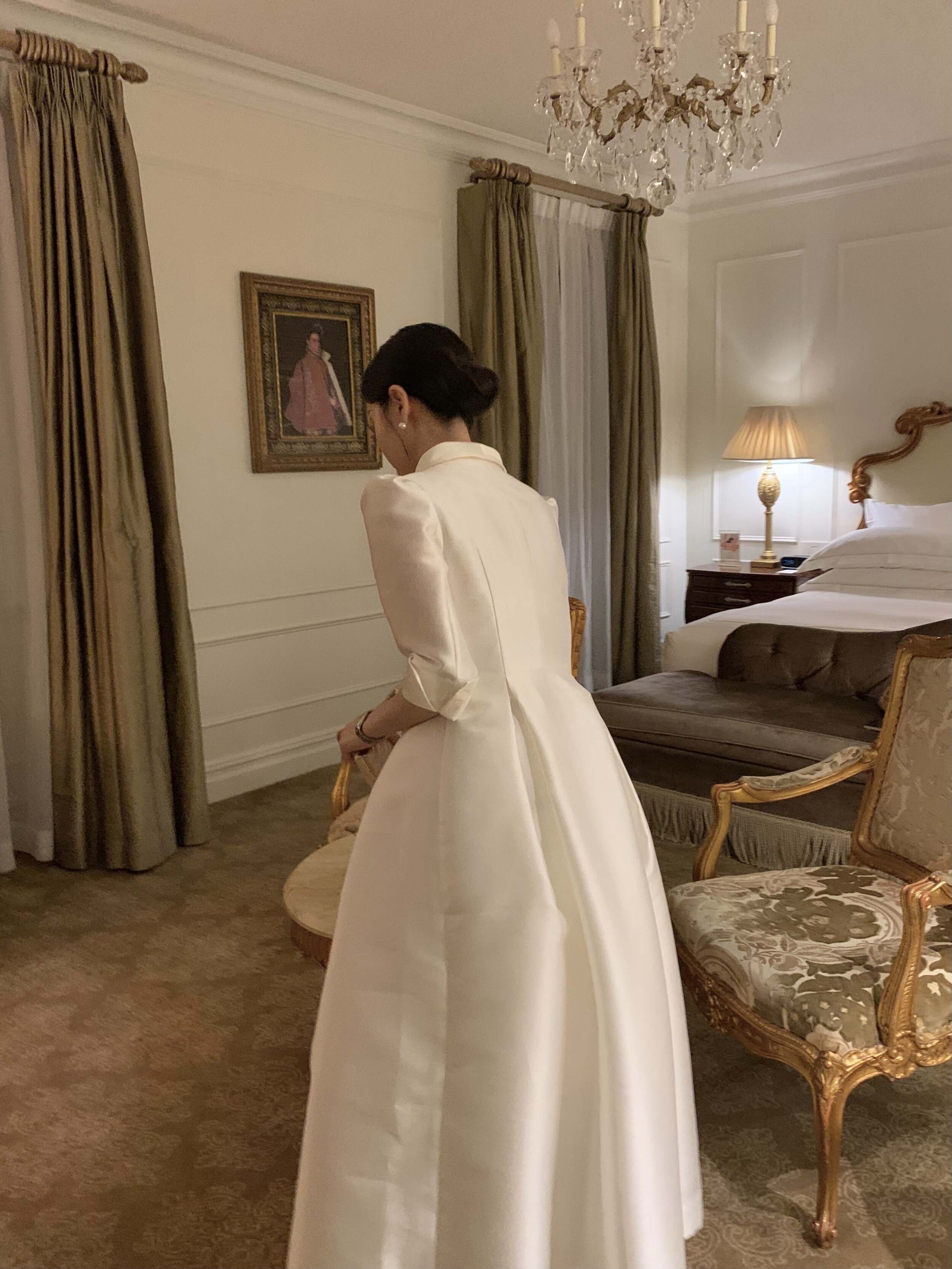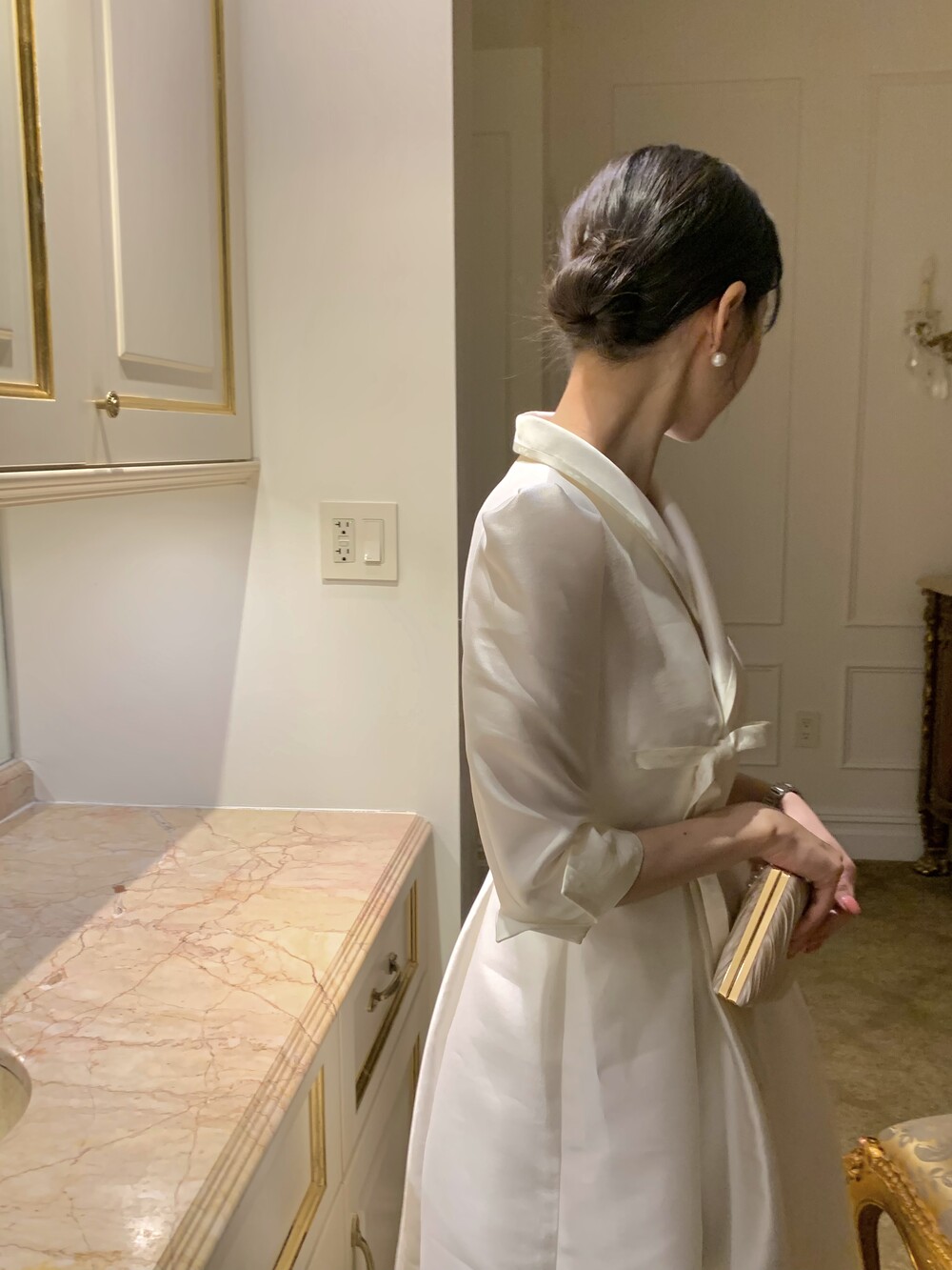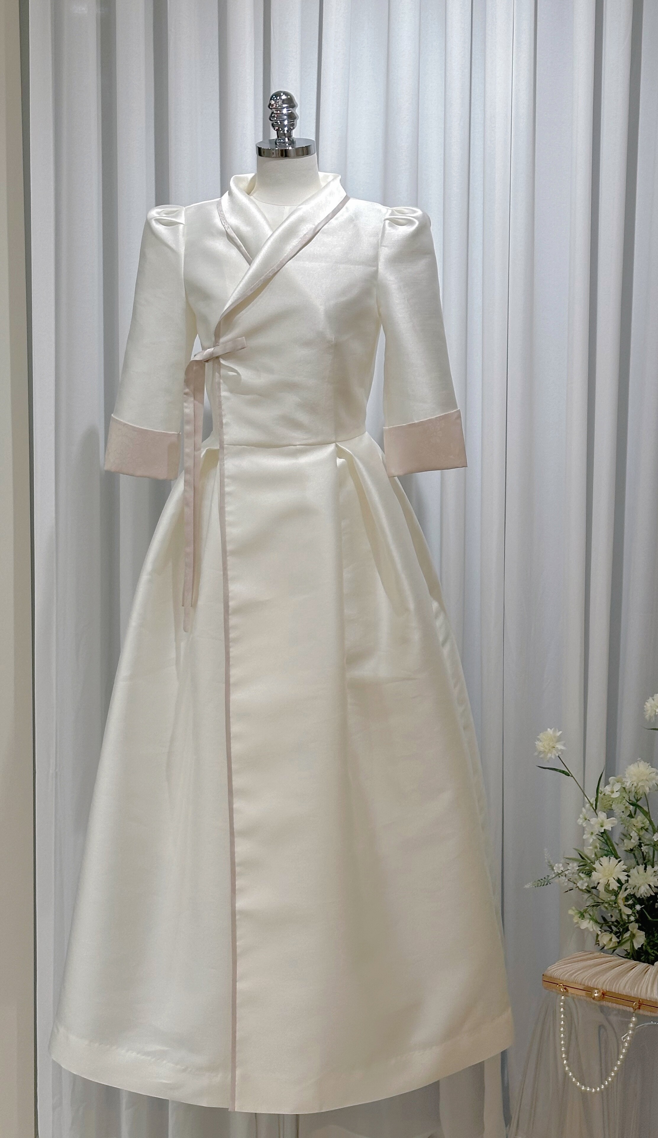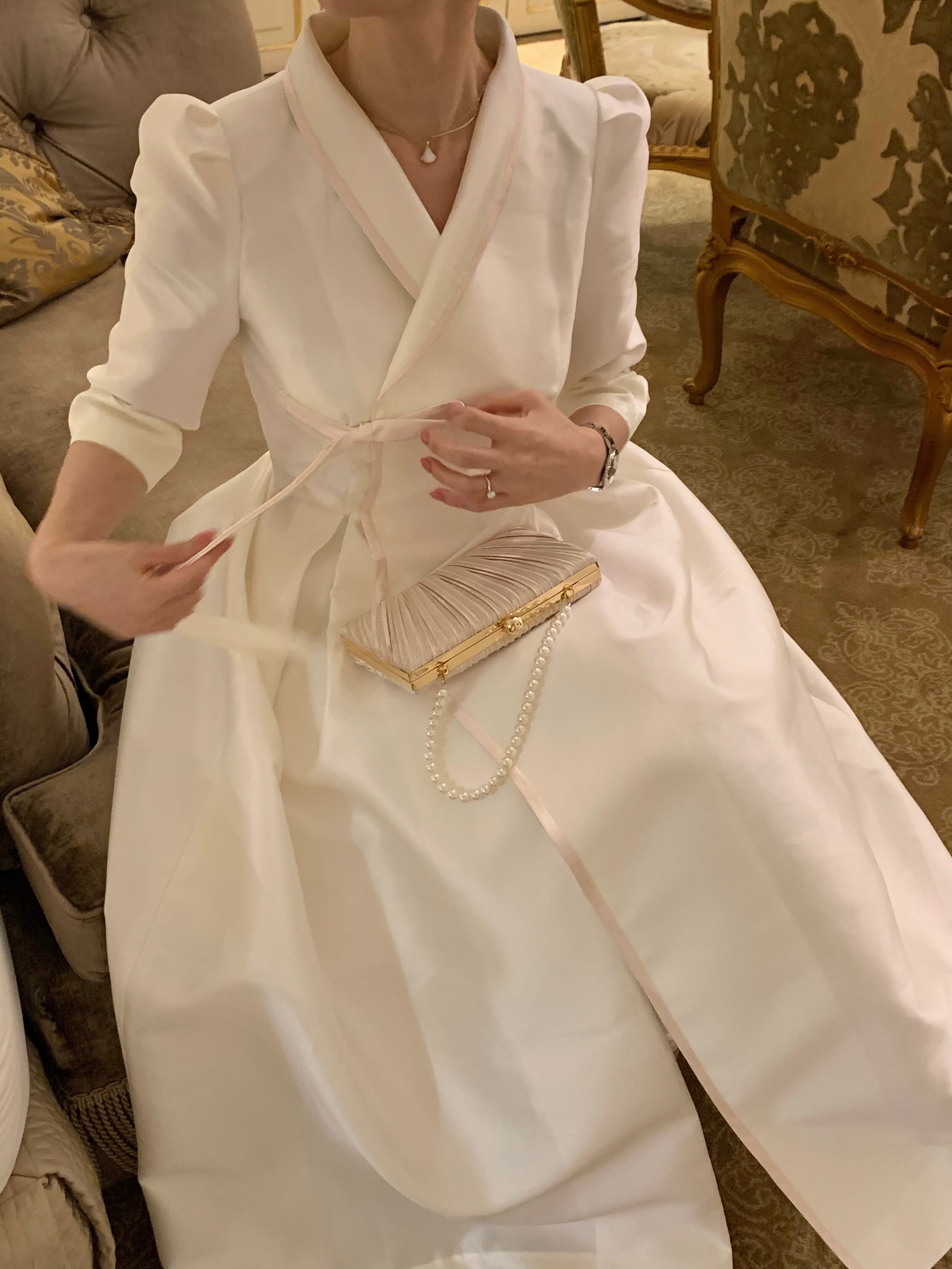 This dress blends the subtle sheen of Italian silk with the luxurious texture of traditional Korean brocade, creating an elegant mood reminiscent of royal styles from both East and West. Designed to be more convenient to wear than a traditional hanbok, it is perfect for weddings or other special occasions, and is highly recommended for those seeking a distinctive, graceful look with a Korean touch.