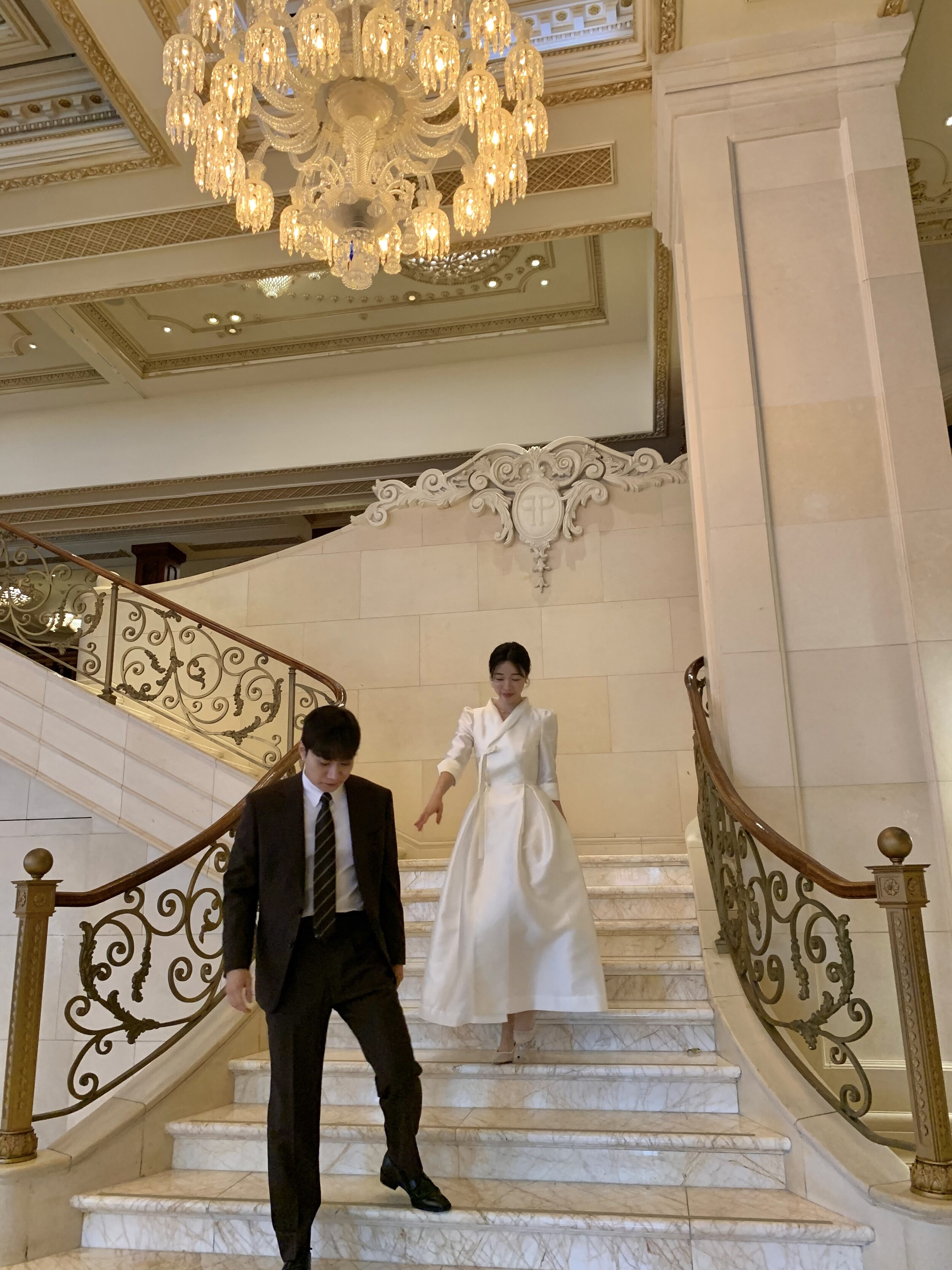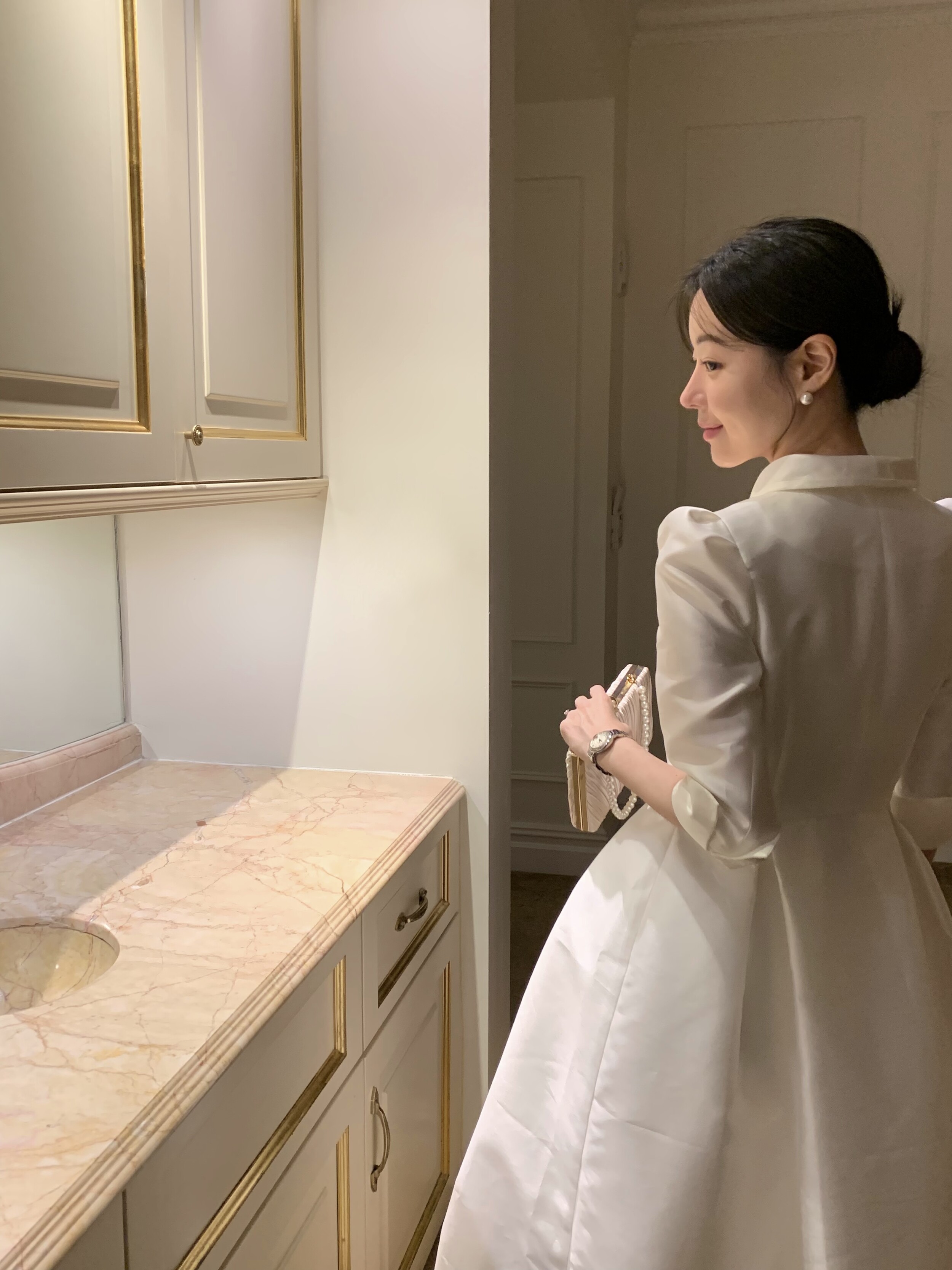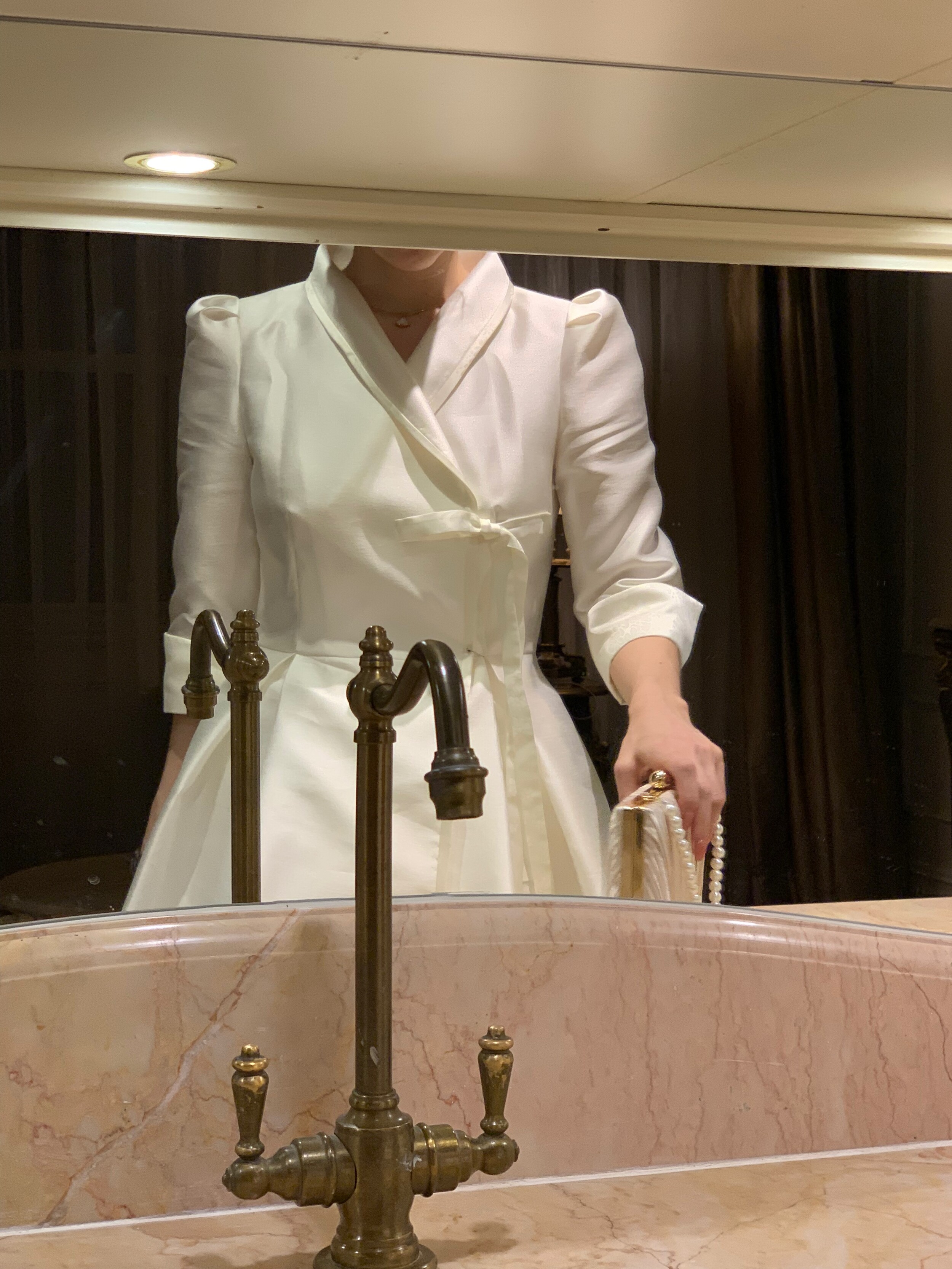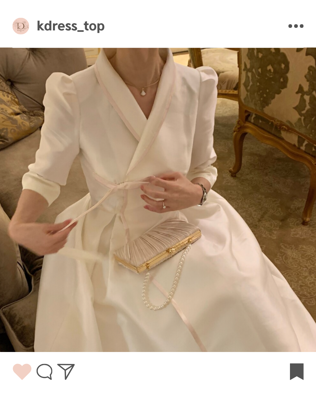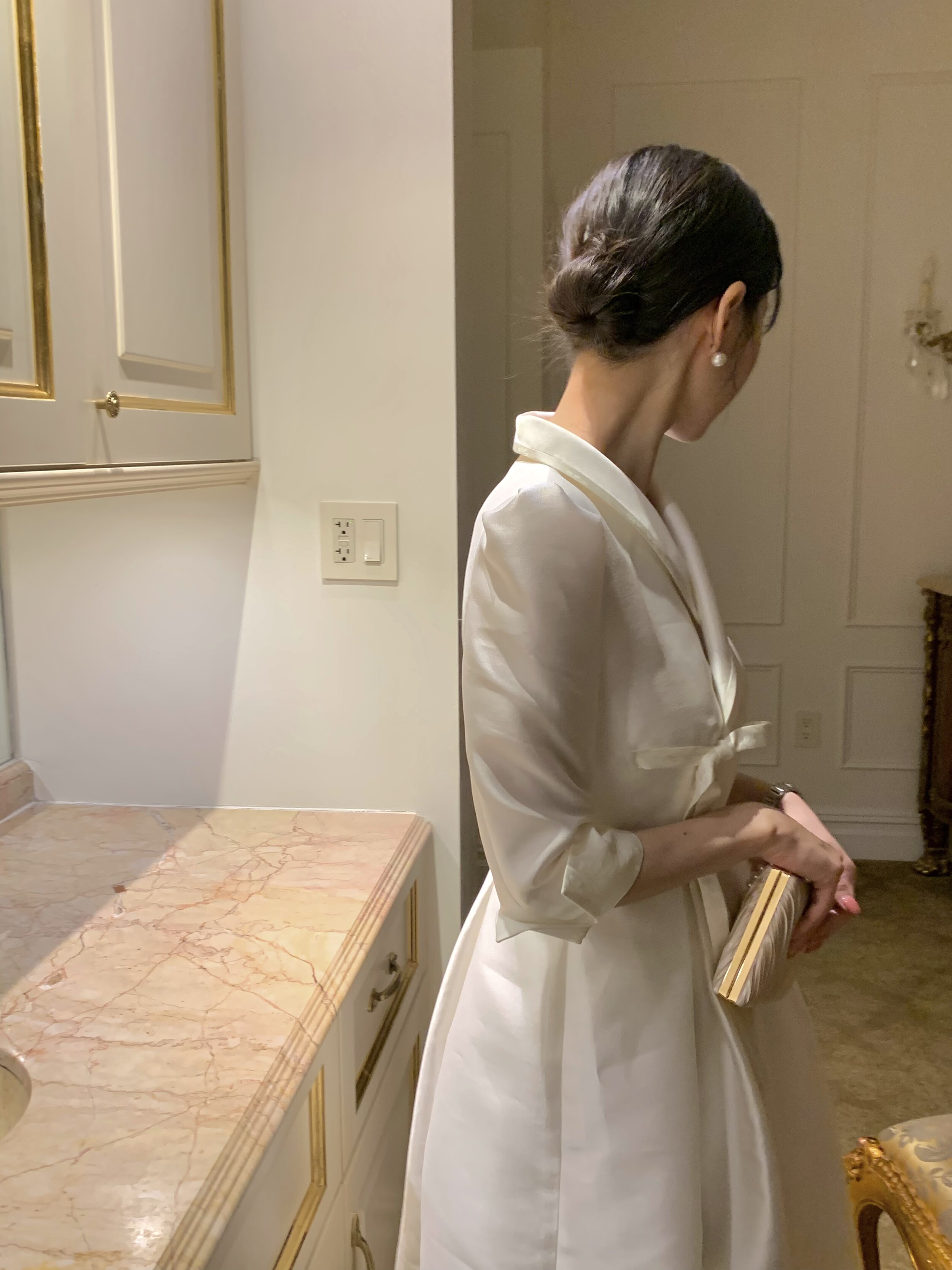 This dress blends the subtle sheen of Italian silk with the luxurious texture of traditional Korean brocade, creating an elegant mood reminiscent of royal styles from both East and West. Designed to be more convenient to wear than a traditional hanbok, it is perfect for weddings or other special occasions, and is highly recommended for those seeking a distinctive, graceful look with a Korean touch.