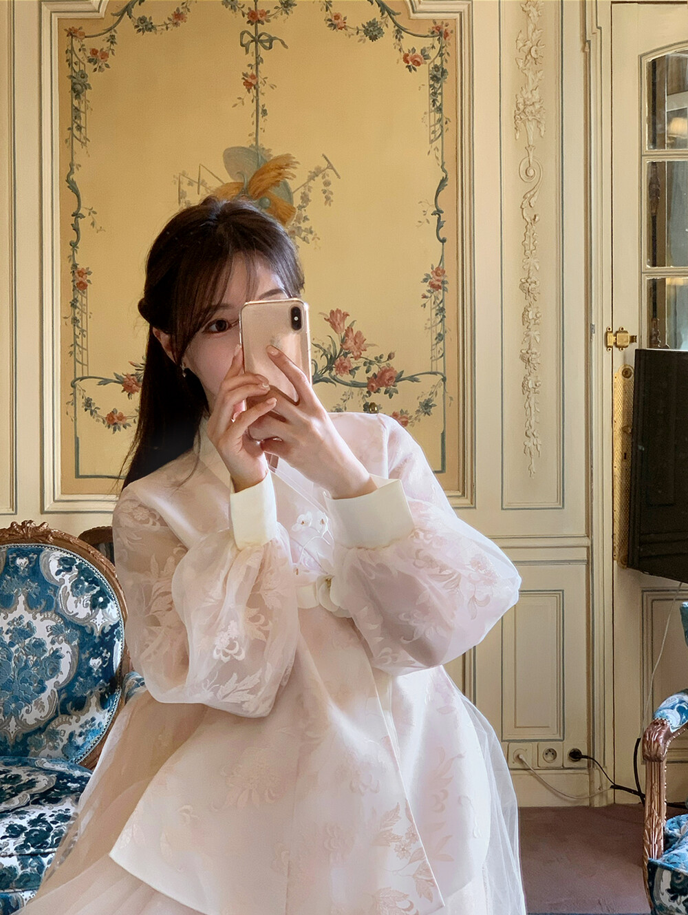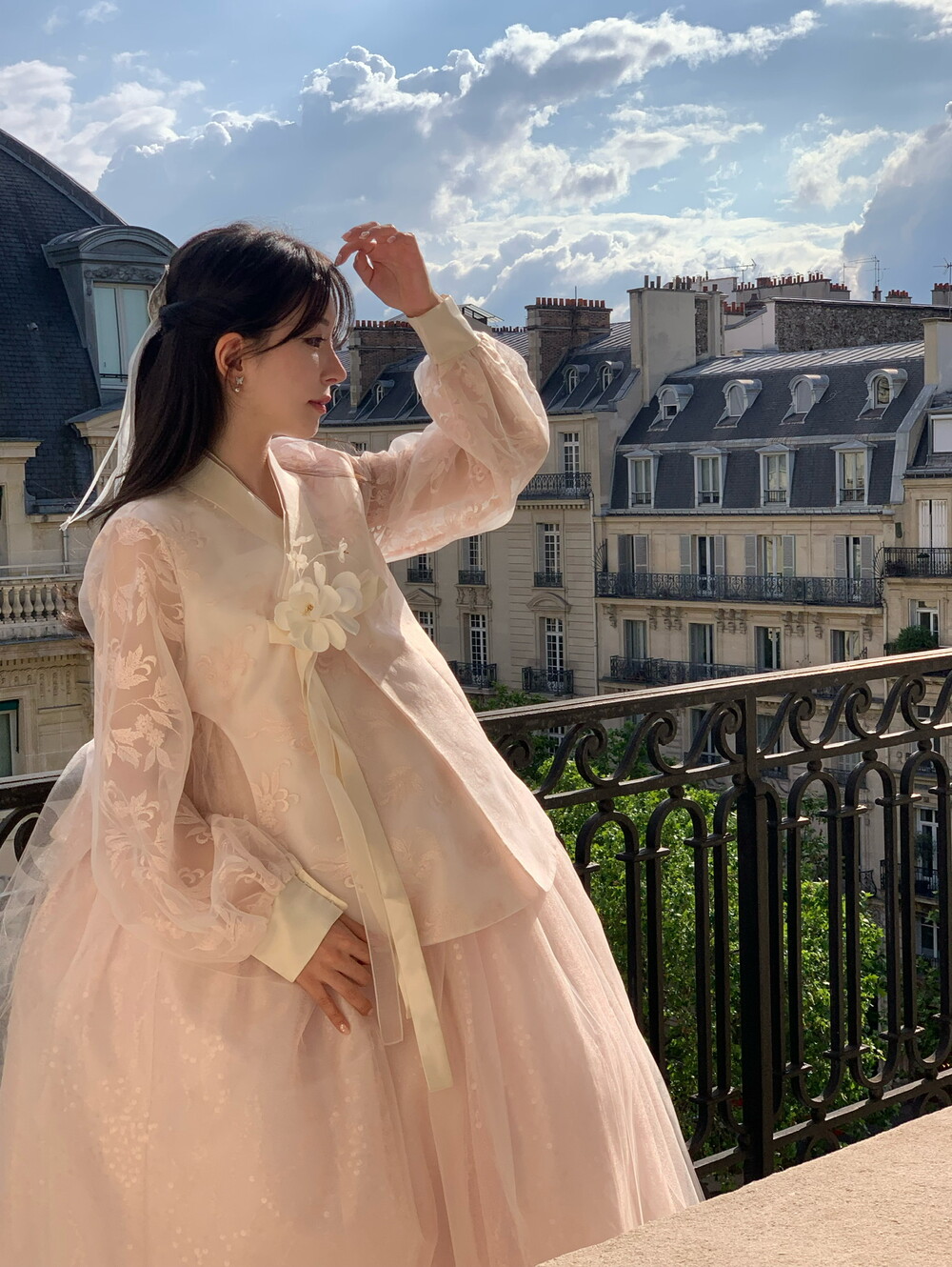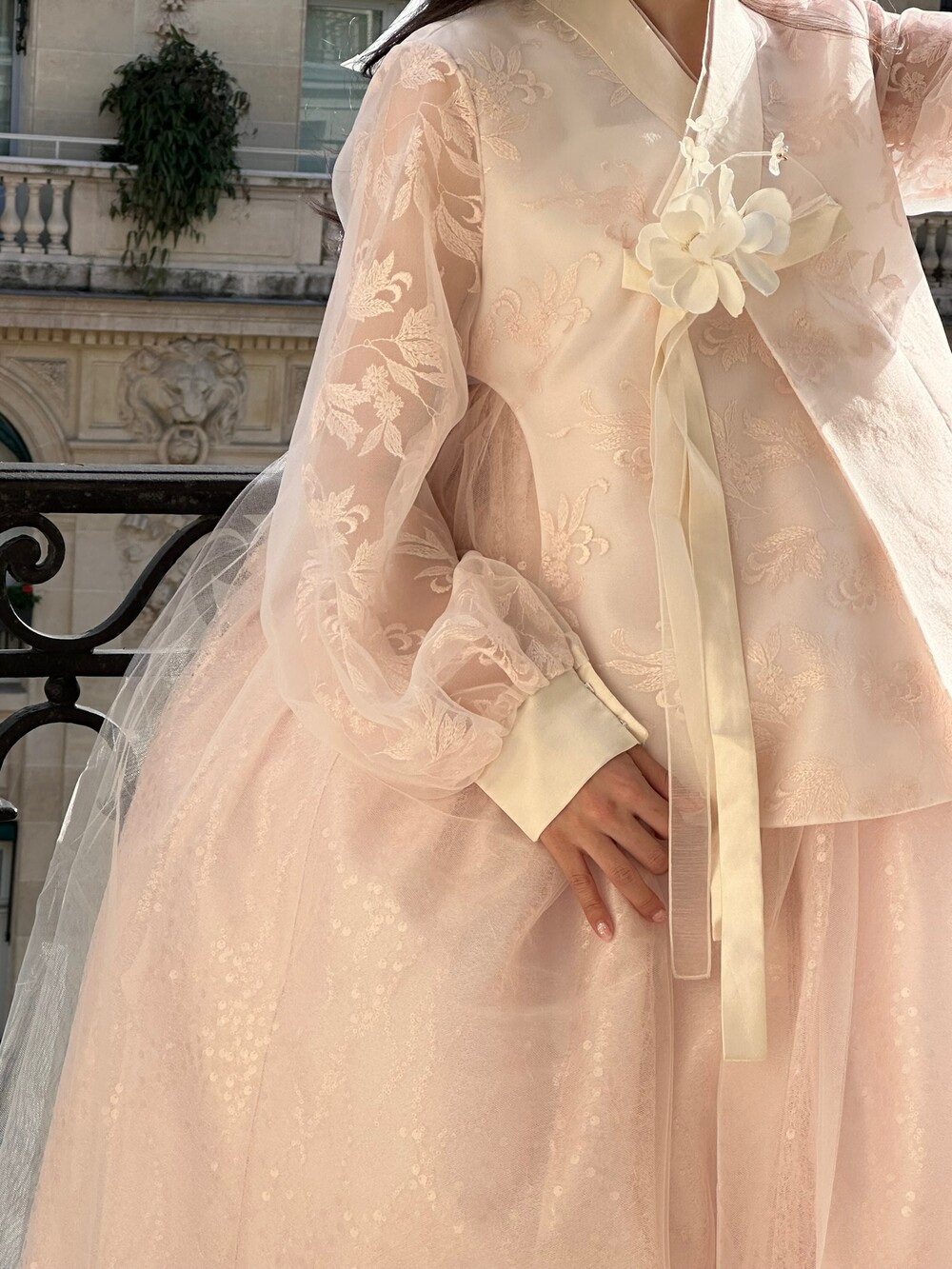 The soft light pink dangui is crafted from sheer fabric adorned with delicate floral patterns, and finished with puffed sleeves that add a lovely, romantic touch. The voluminous skirt gently flares out, shimmering with subtle patterns and scattered sequins that catch the light. Altogether, the piece blends the graceful elegance of traditional hanbok with refined materials and delicate details, creating a look that is both graceful and romantic.