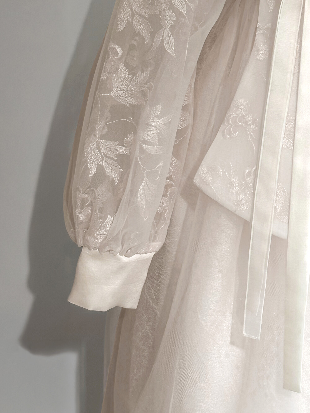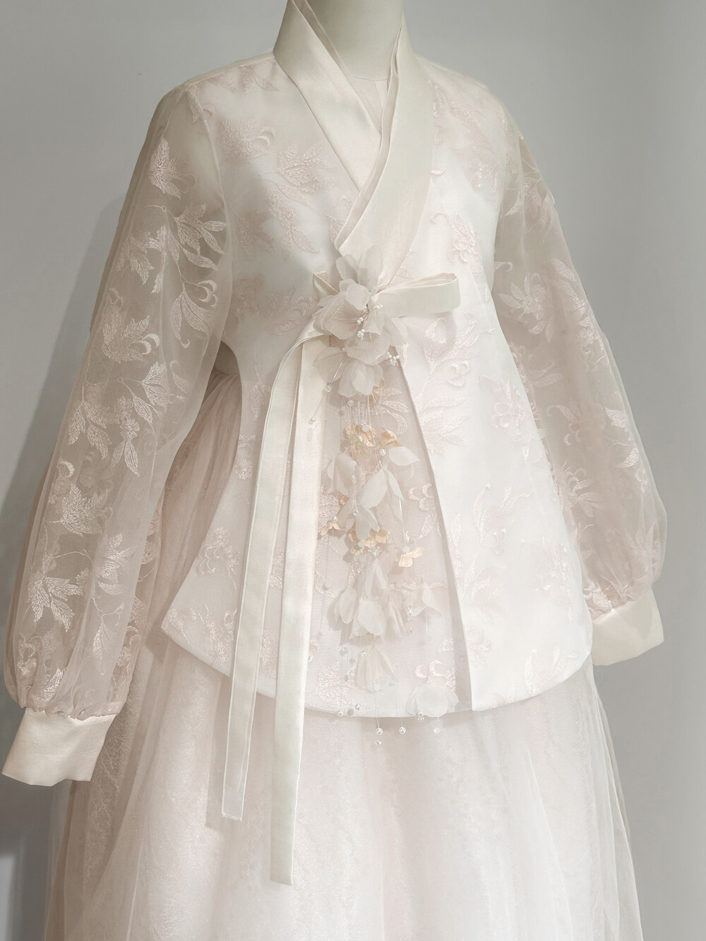 고운 연핑크빛 당의는 섬세한 플라워 패턴이 더해진 시스루 원단으로 제작되었으며, 끝단이 퍼프 형태로 마감된 소매가 사랑스러움을 추가했습니다. 풍성하게 퍼지는 스커트는 부드러운 색감 위에 은은한 패턴과 곳곳에 박힌 스팽글이 어우러져 은은하게 반짝입니다. 전체적으로 단아한 한복의 분위기 위에 소재와 디테일로 우아함과 로맨틱함을 더했습니다.