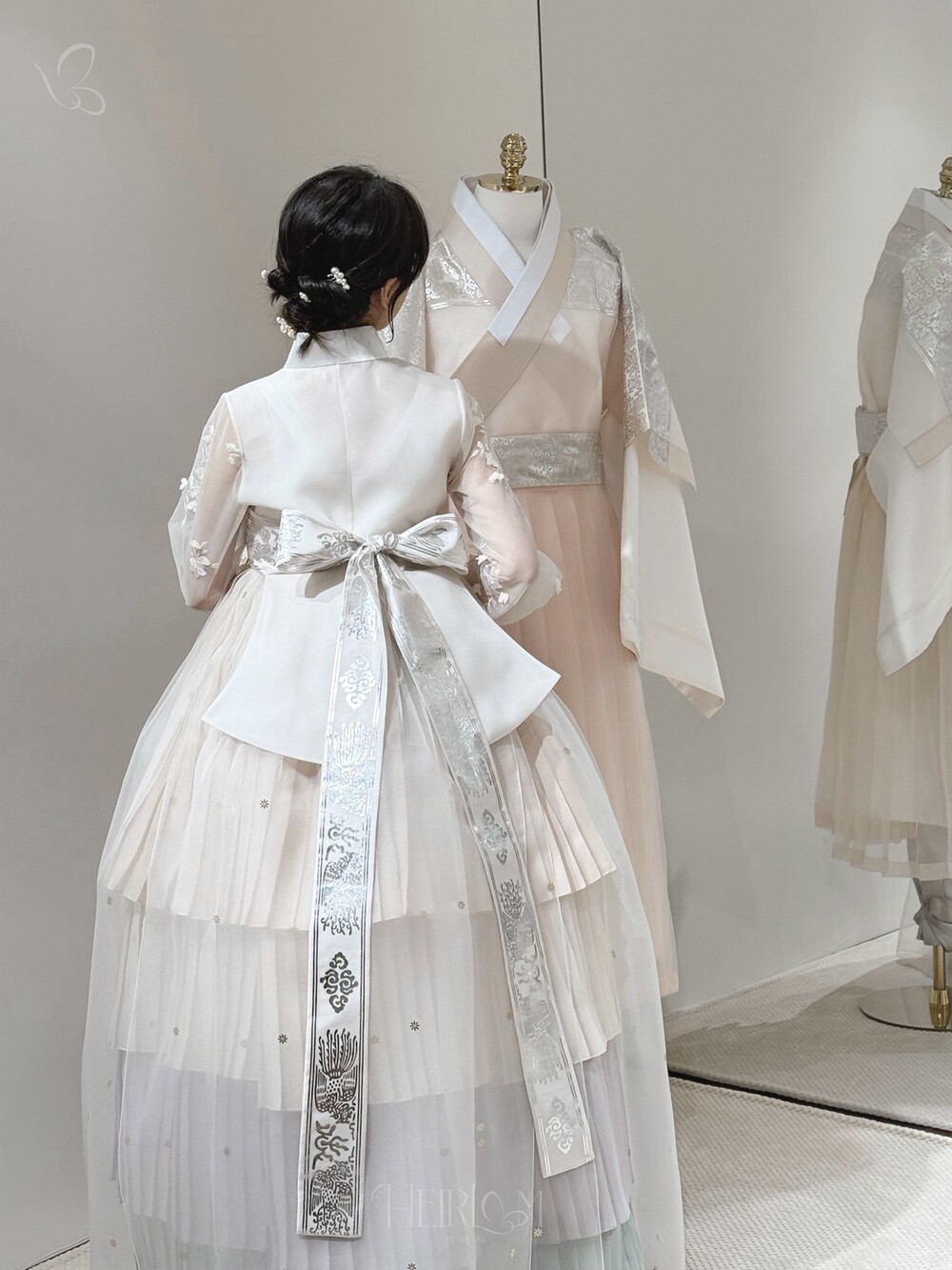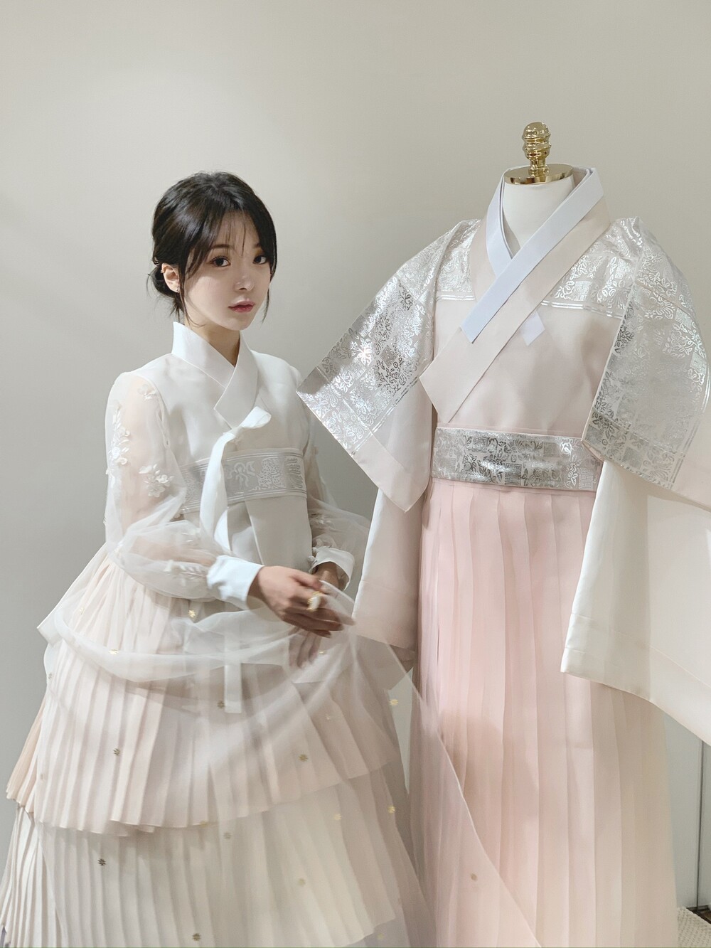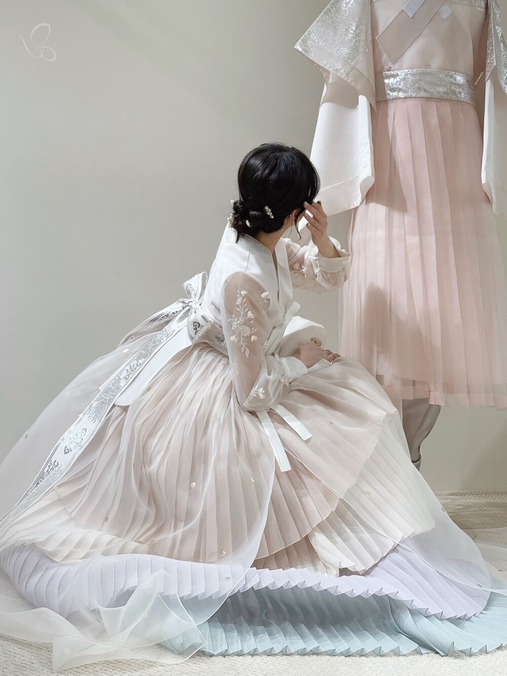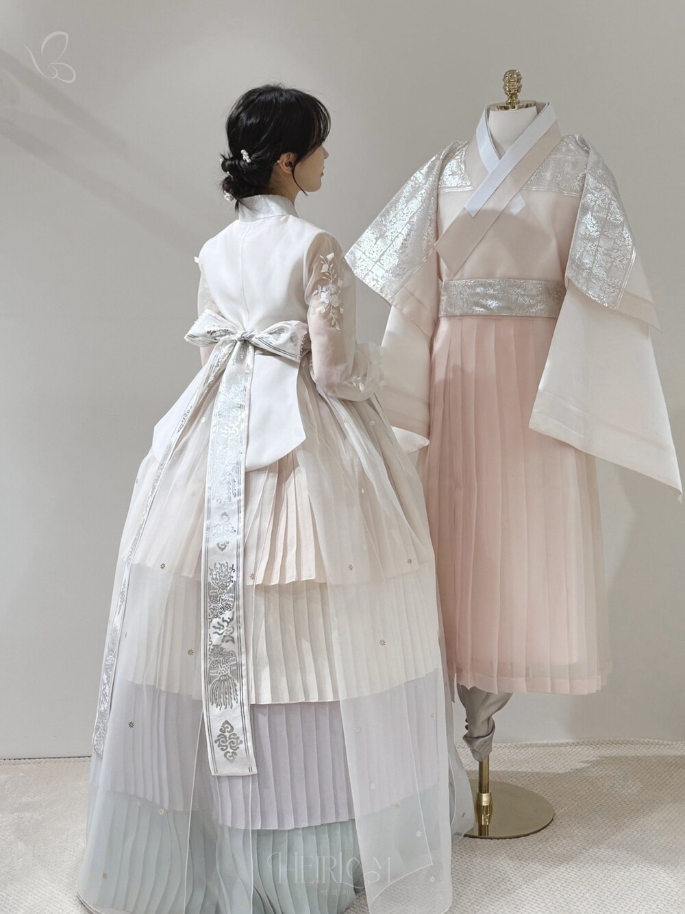 This hanbok exudes a graceful yet lovely mood, featuring a skirt made of layered pleated fabrics in toned-down pastel hues.The top, designed in the traditional dang-ui style, has sheer sleeves adorned with floral patterns that add a touch of delicate femininity.A silver foil trim along the front seam enhances its sense of luxury.With its unique design, this piece captures a rare harmony of elegance and sweetness within a refined silhouette.
