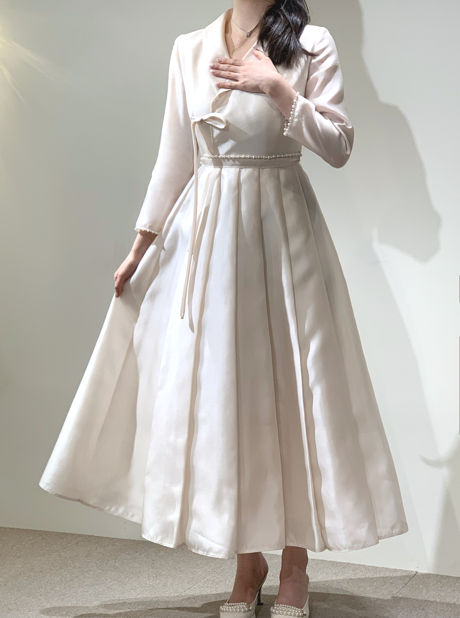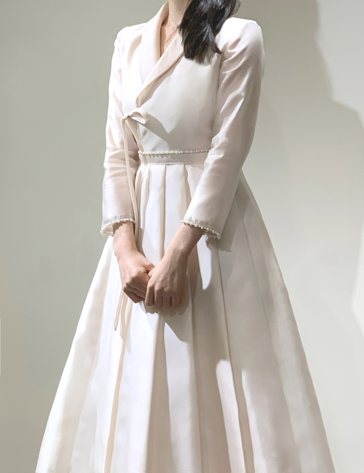 고운 광택이 감도는 차분한 핑크빛 원단를 사용하여 절제된 우아함이 있는 드레스입니다. 소매 끝과 허리 벨트에는 진주로 장식을 더해 세련된 포인트를 주었습니다. 풍성하게 퍼지는 플리츠 스커트 라인이 단정한 고급스러움을 연출하며, 전체적으로 단아하고 기품 있는 무드를 담았습니다. 고전적인 한복 실루엣을 현대적으로 해석한 드레스로 2부용 의상이나, 혼주용으로도 적합합니다.