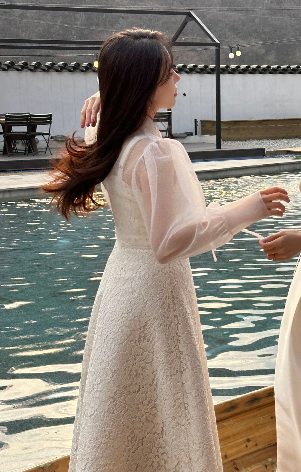 일상에서도 부담 없이 착용할 수 있는 레이스 드레스로, 전체에 부드럽고 섬세한 이태리산 레이스를 사용하고, 안감까지 고급 미카도 실크를 더해 오직 우수한 소재만으로 완성했습니다. 저고리 없이 단독 원피스로도 손색없는 디자인으로, 여성스러움과 더불어 A라인 실루엣을 통해 날씬해 보이도록 수차례의 수정과 핏 조정을 거쳤습니다.