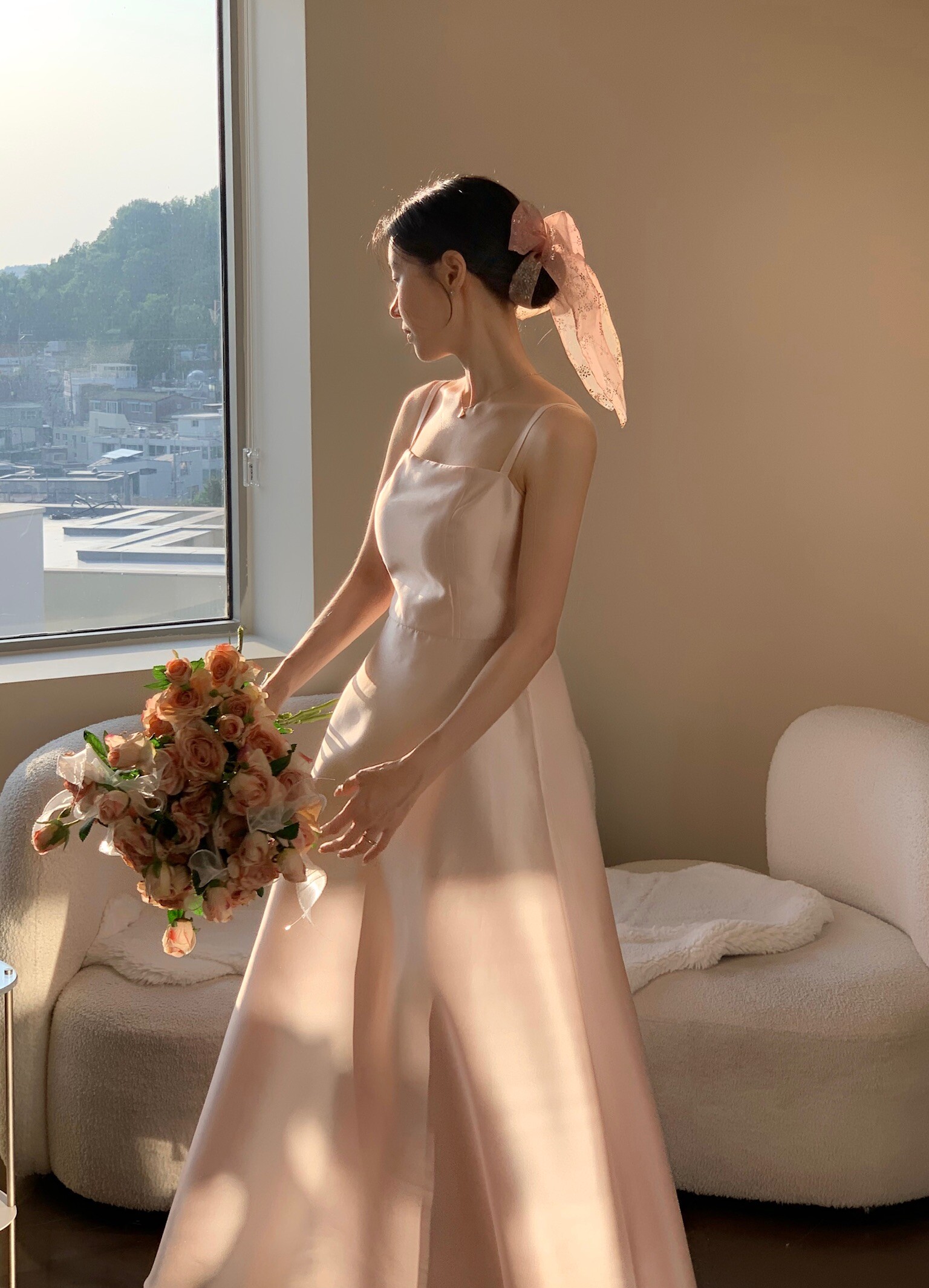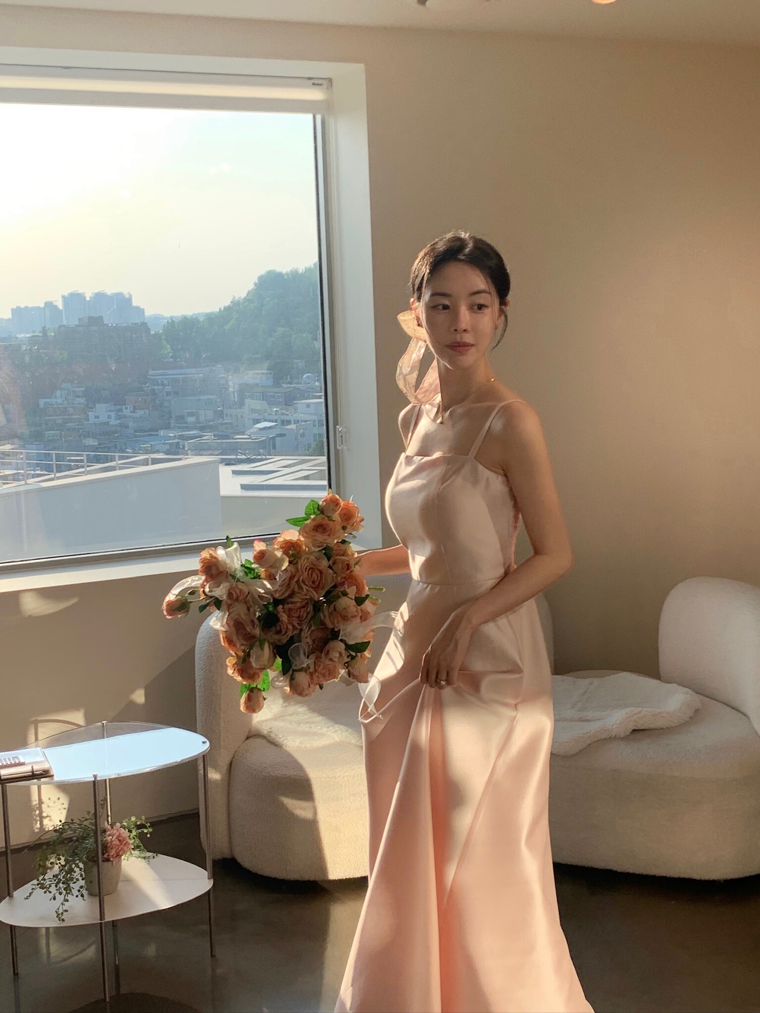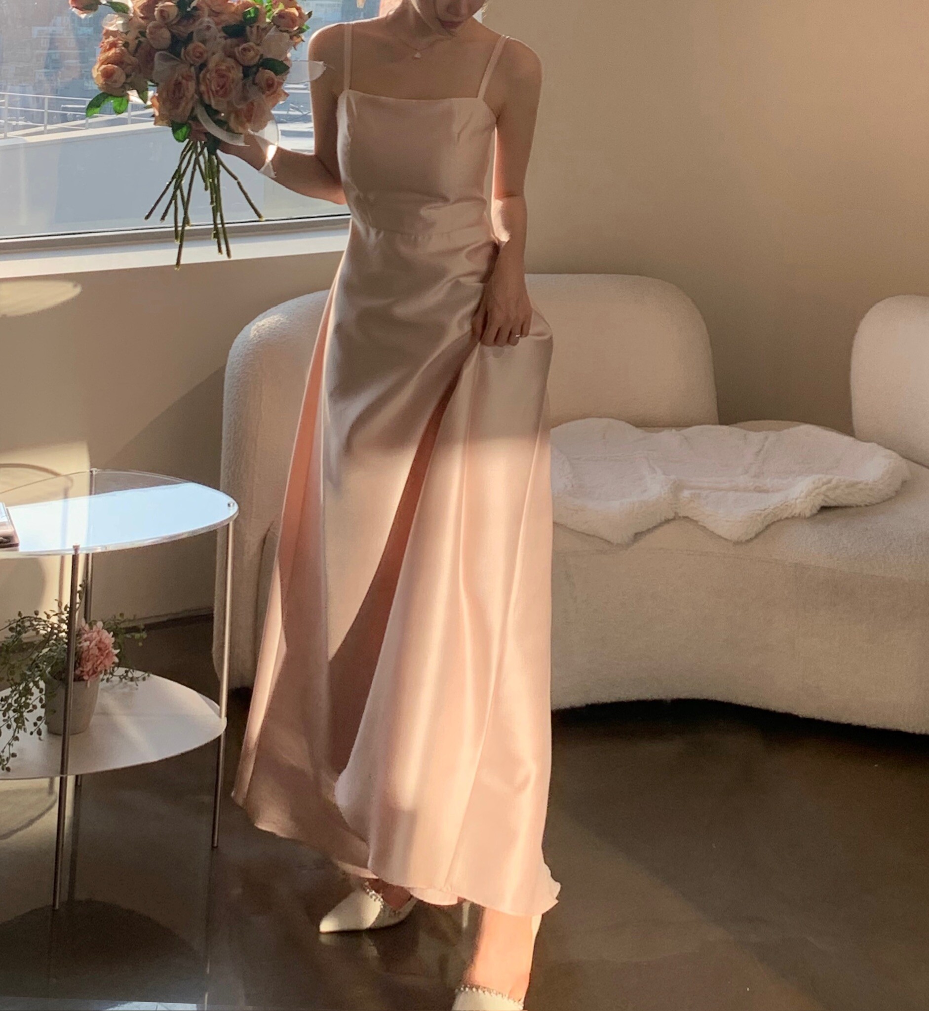Made from silk with a subtle sheen, this dress flows gracefully with movement, creating an elegant silhouette. Its simple design carries a sense of refined beauty, making it perfect to wear on its own or styled with a hanbok-inspired blouse or overskirt for a more traditional touch.