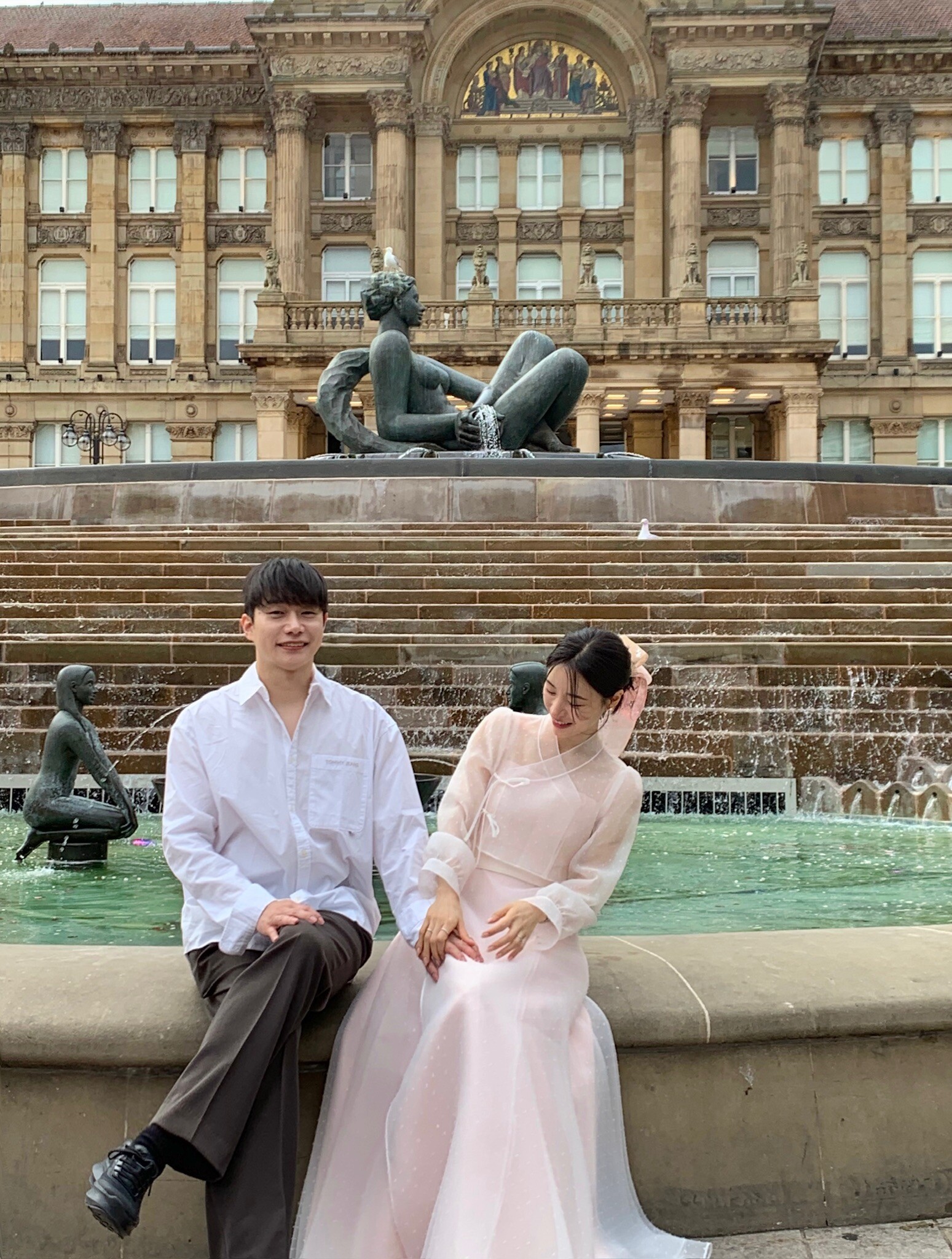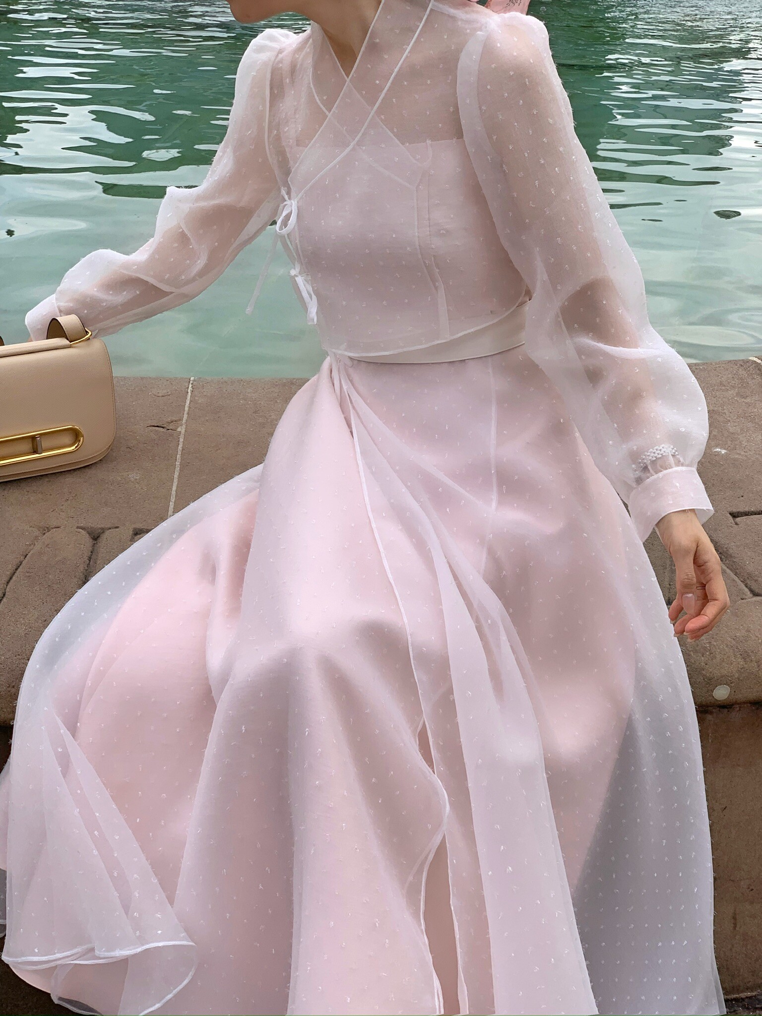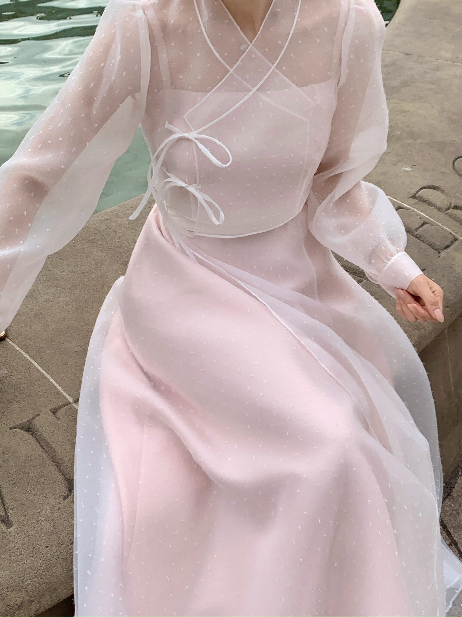 This dress is crafted from subtly lustrous silk fabric, creating an elegant silhouette that flows beautifully with every movement.Its simple yet graceful design is paired with a blouse that reinterprets the silhouette of a traditional Korean jeogori through the lens of a modern Western-style blouse.Made from a sheer fabric with a soft drape, the blouse evokes a delicate and feminine mood, while the subtle dot detailing adds a refined and luxurious touch to the overall look.