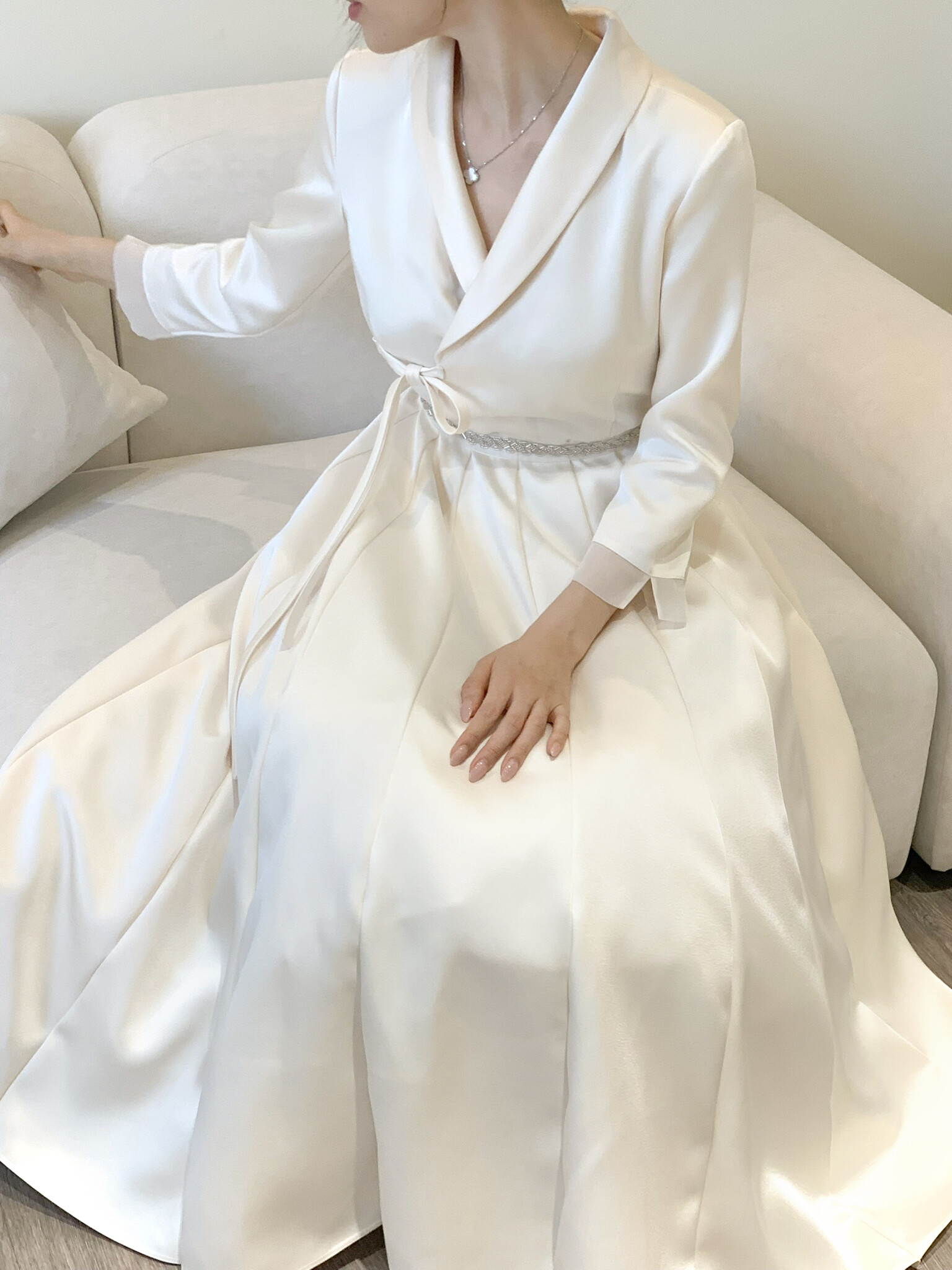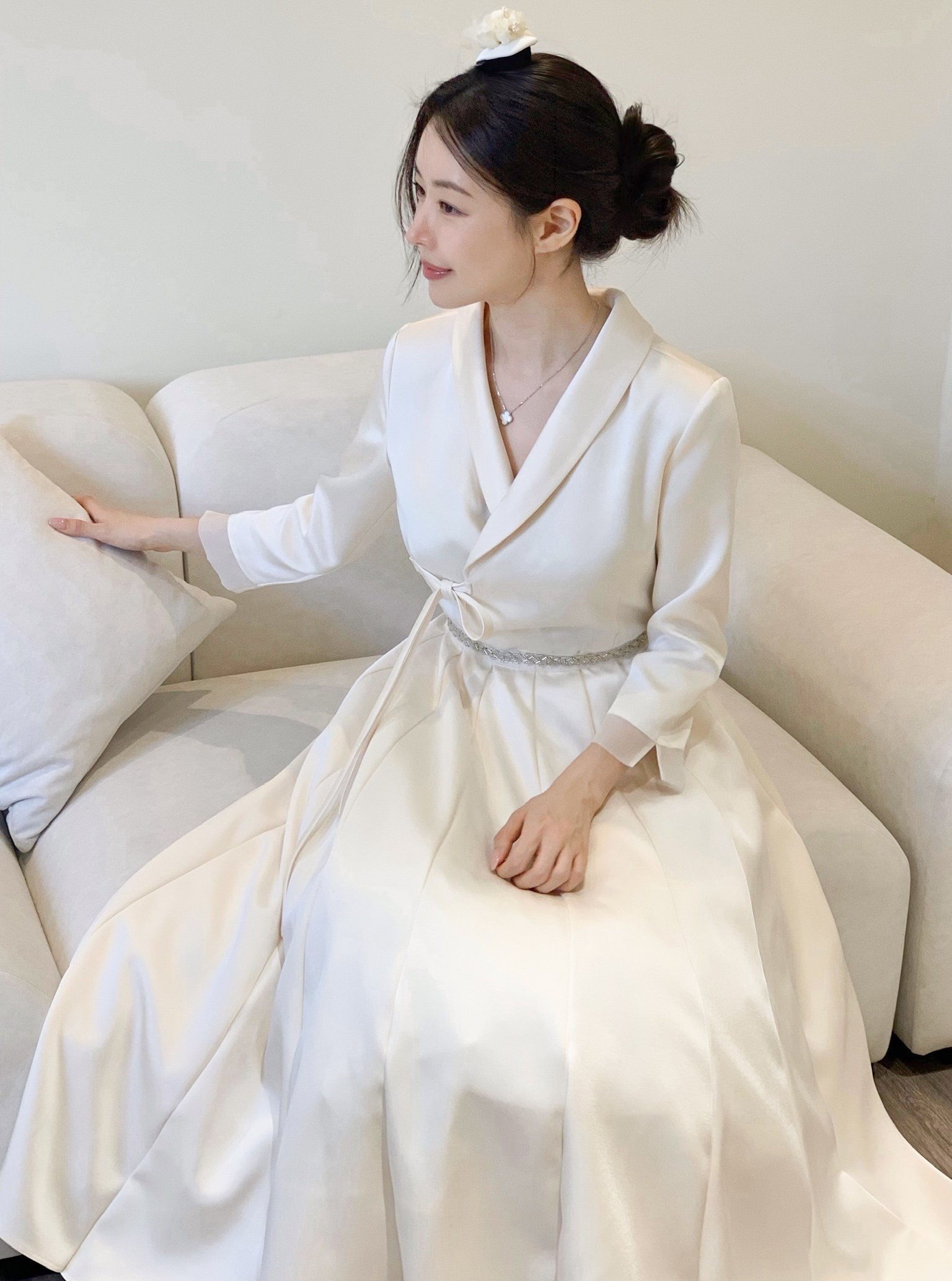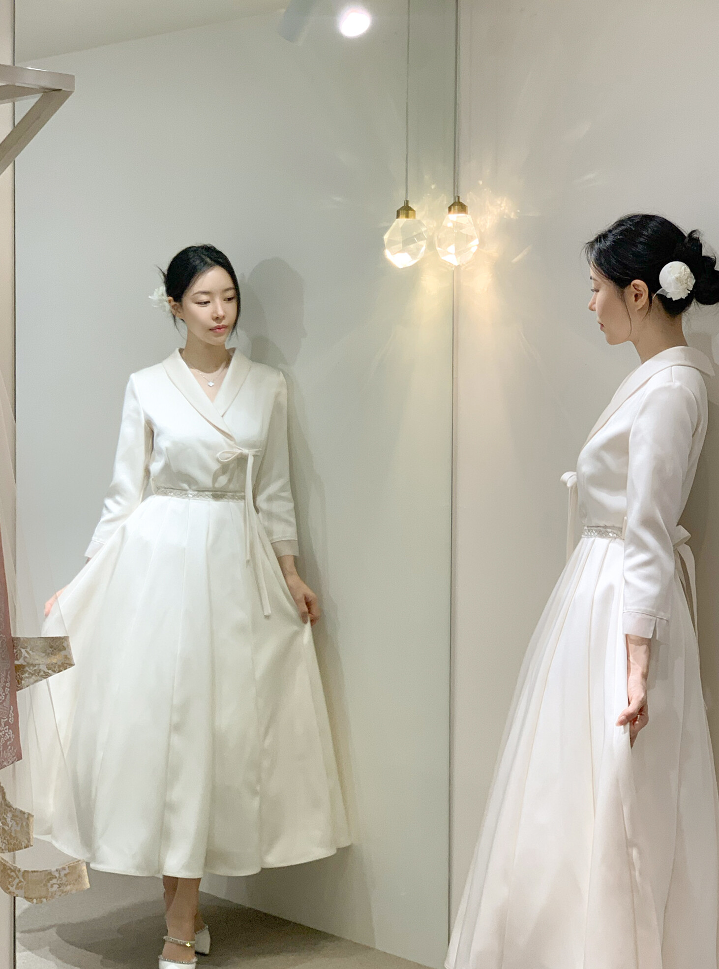 고전적인 한복 실루엣을 현대적으로 해석한 디자인으로, 2부 드레스는 물론 혼주용으로도 우아하게 어울립니다.