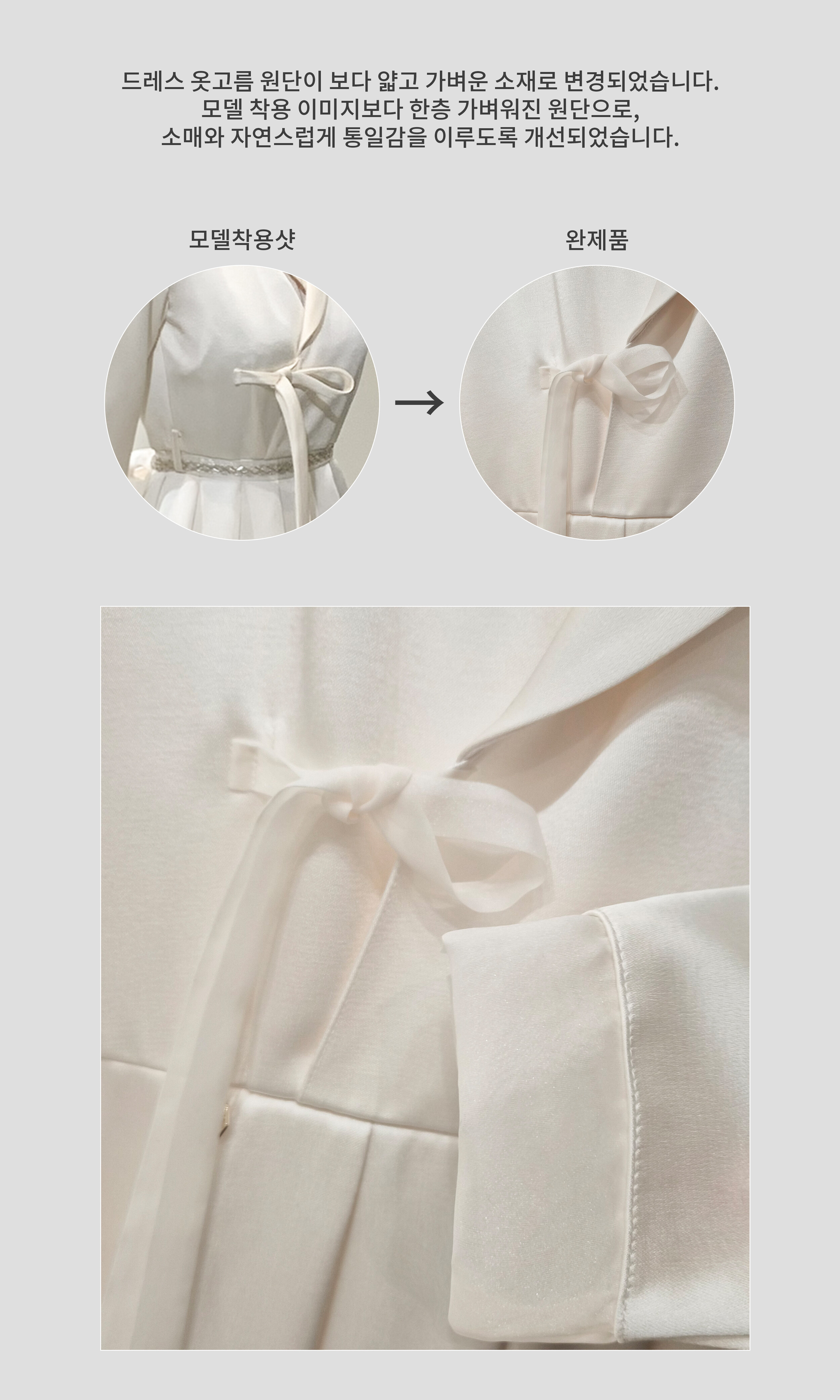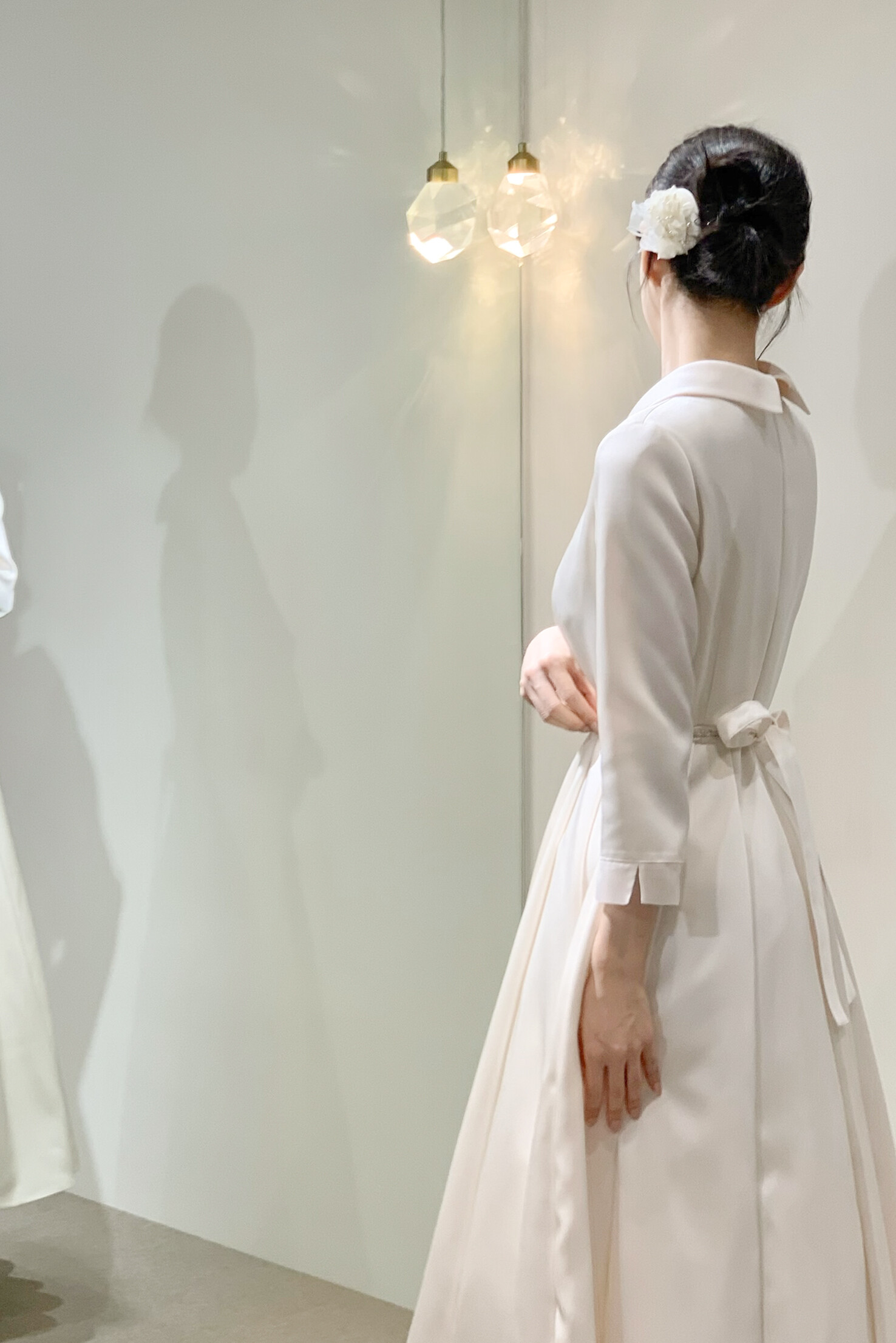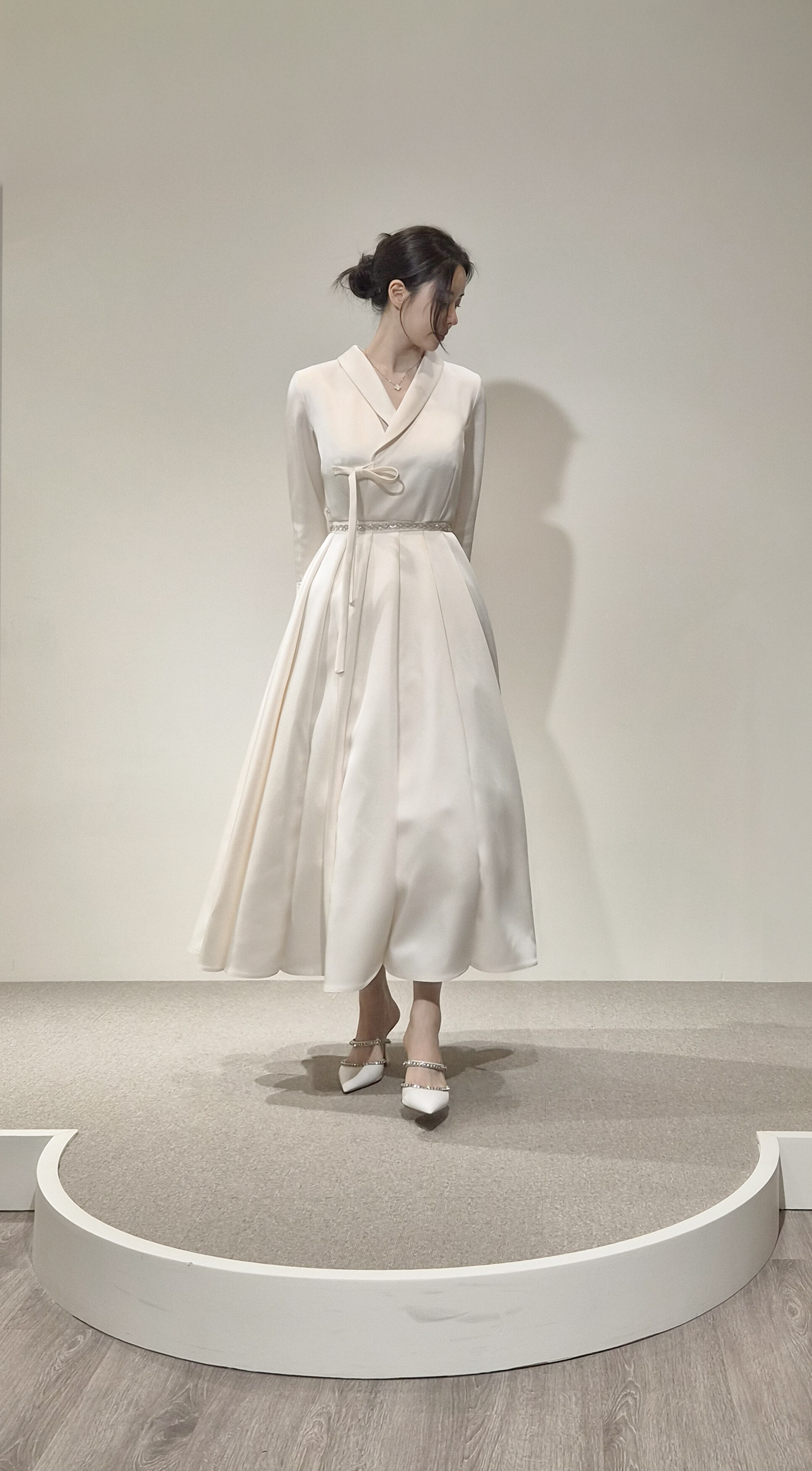 풍성하게 퍼지는 스커트 라인과 크리미한 컬러로 보다 차분하고 절제되어 정숙한 기품이 느껴집니다.