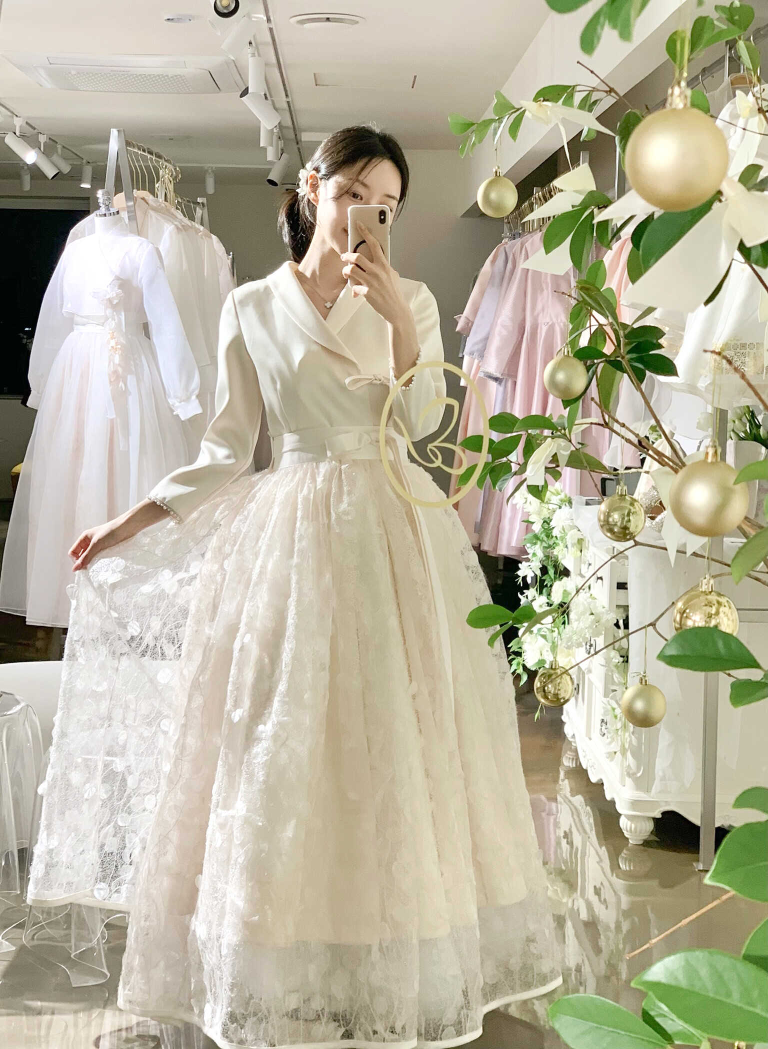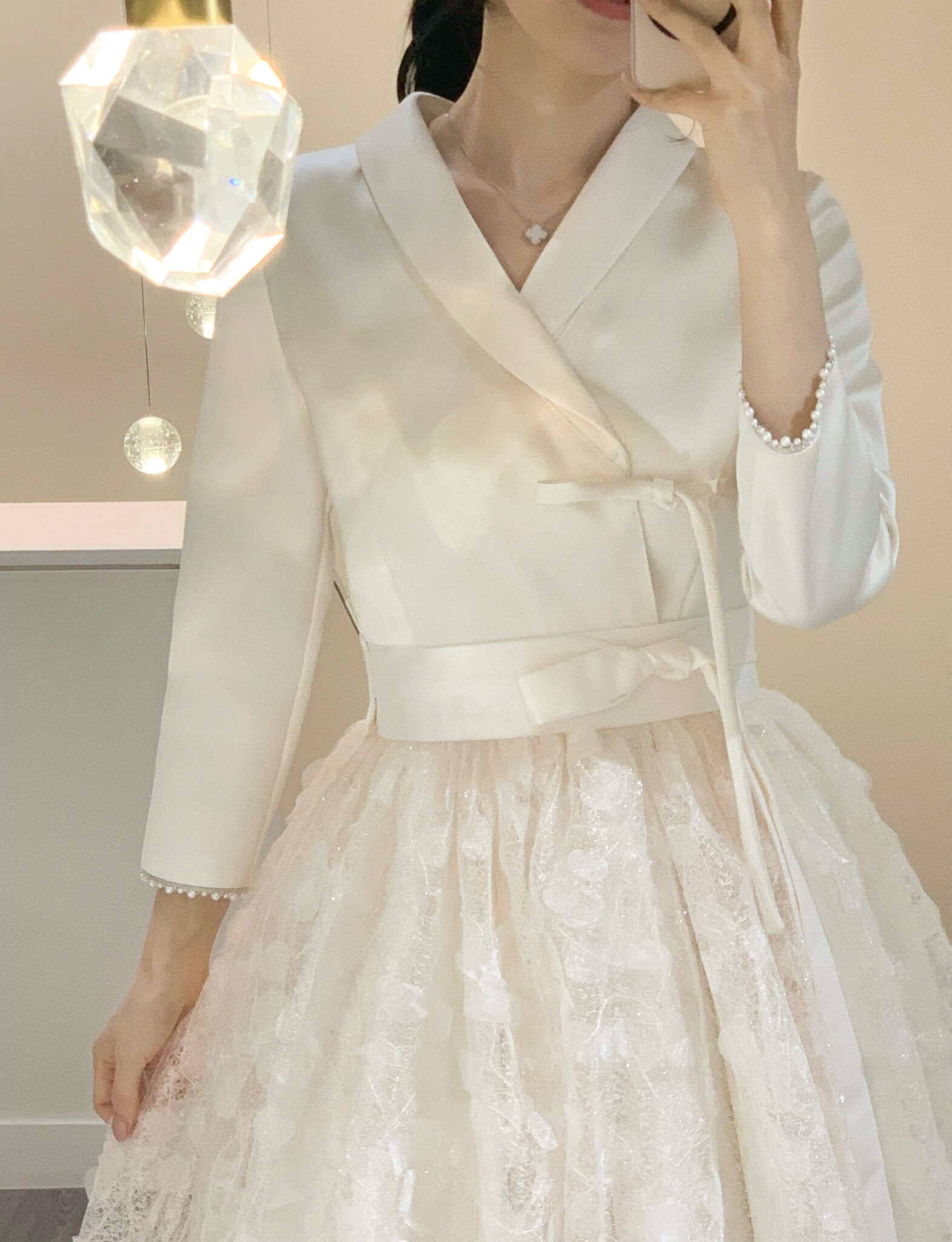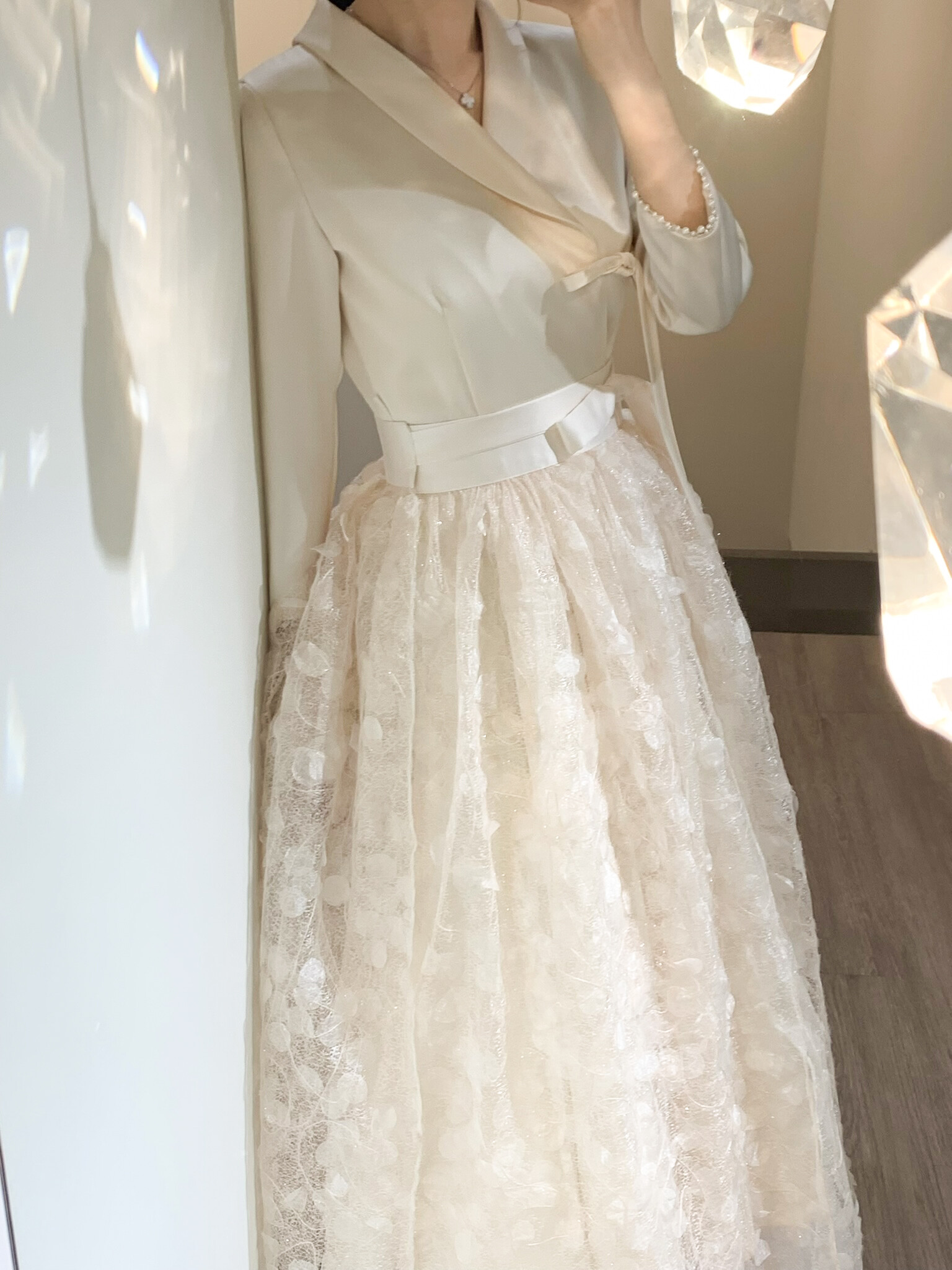 은은하게 빛나는 텍스처가 겹겹이 레이어드되어 깊이감 있는 실루엣을 완성하며, 케이드레스와 함께 착용 시 더욱 풍성하고 우아한 라인을 연출합니다.
