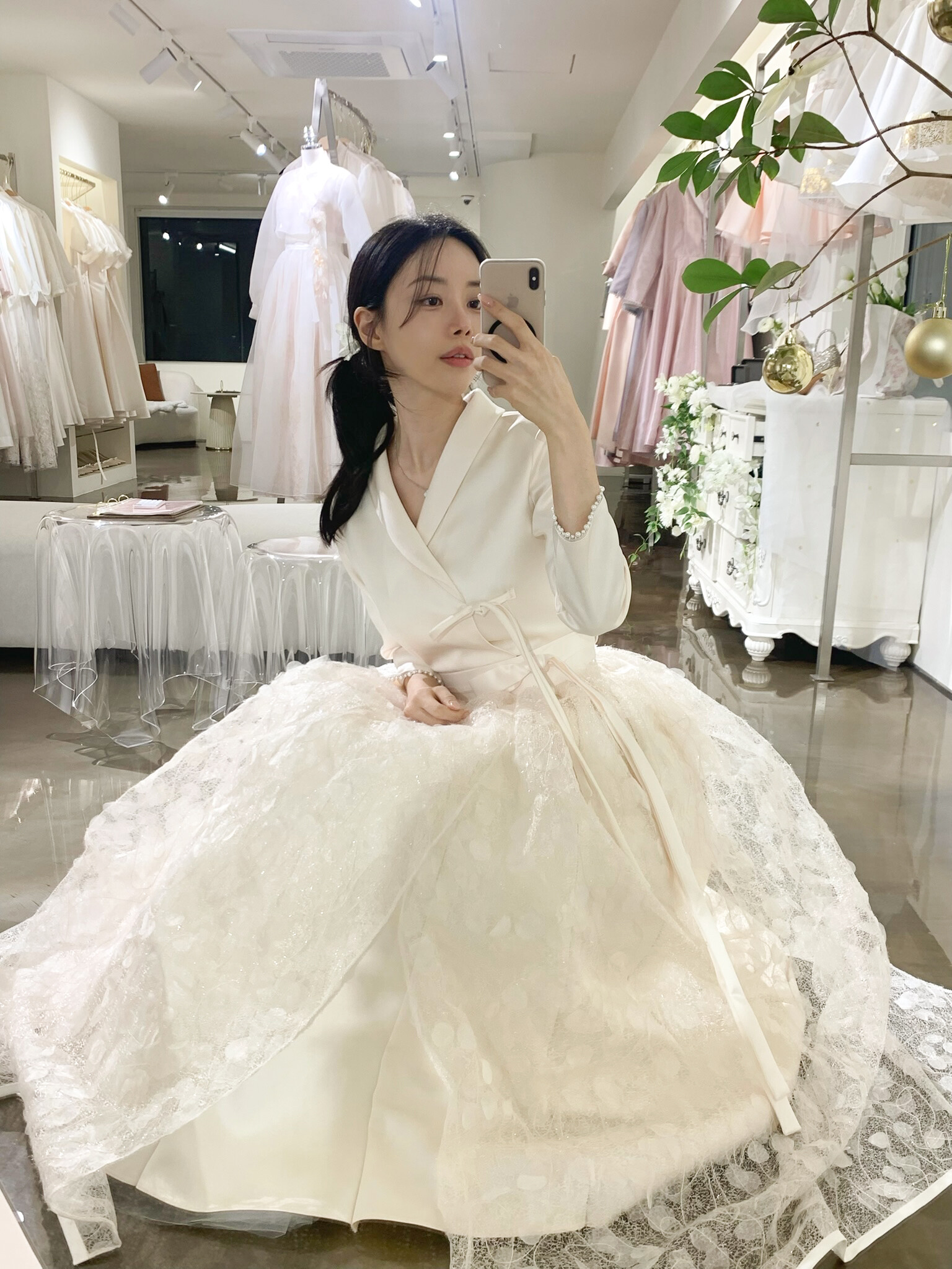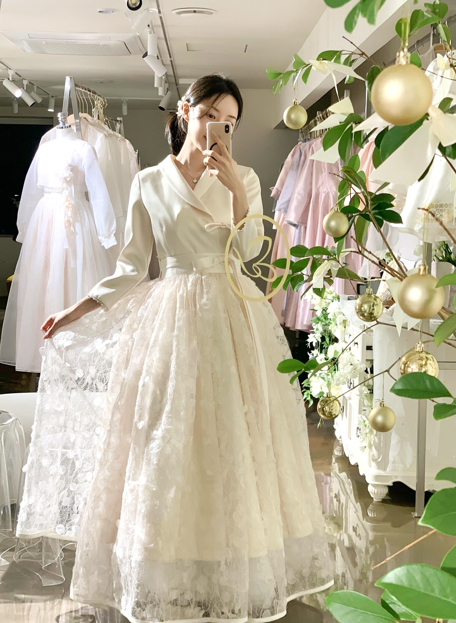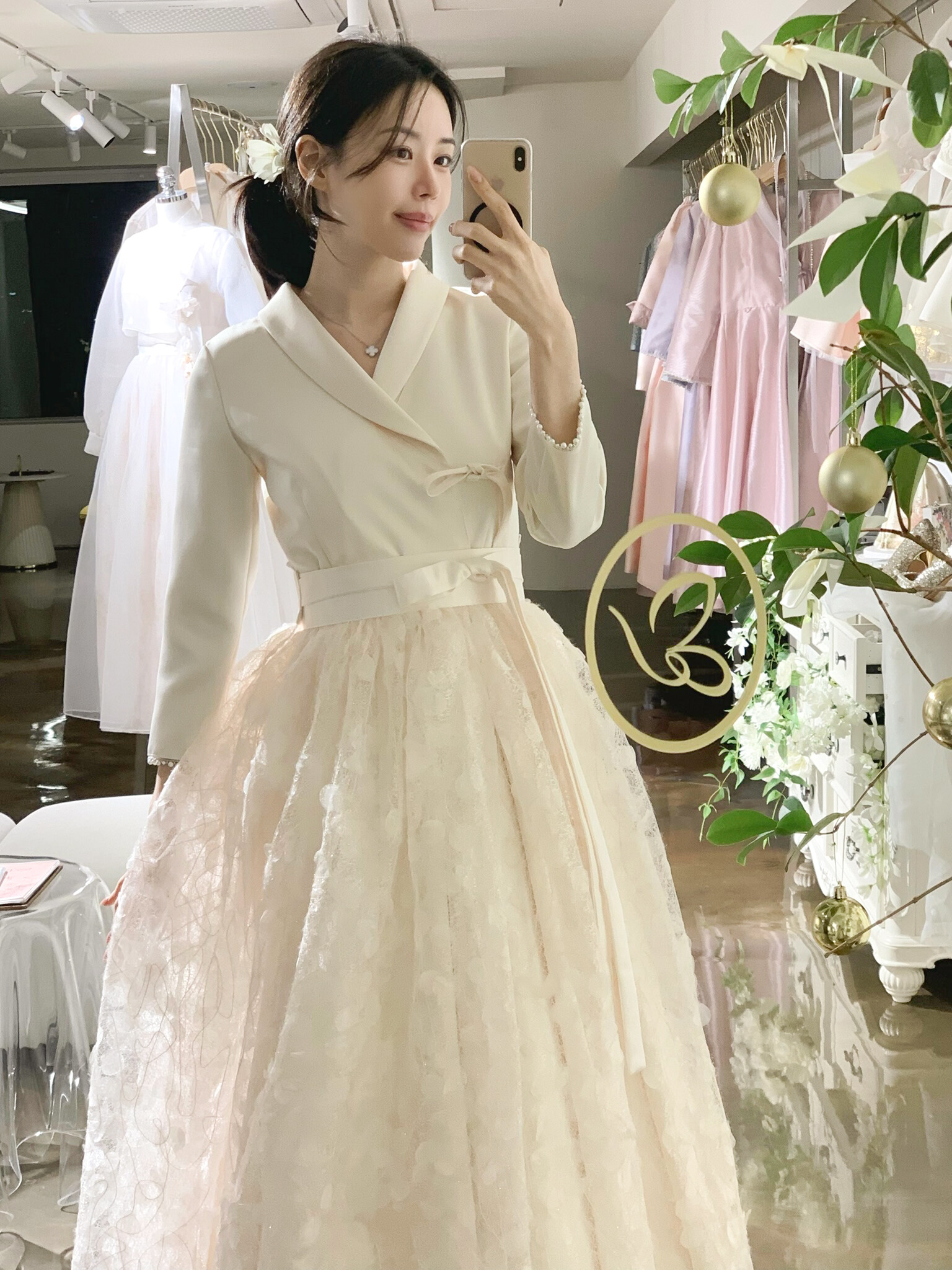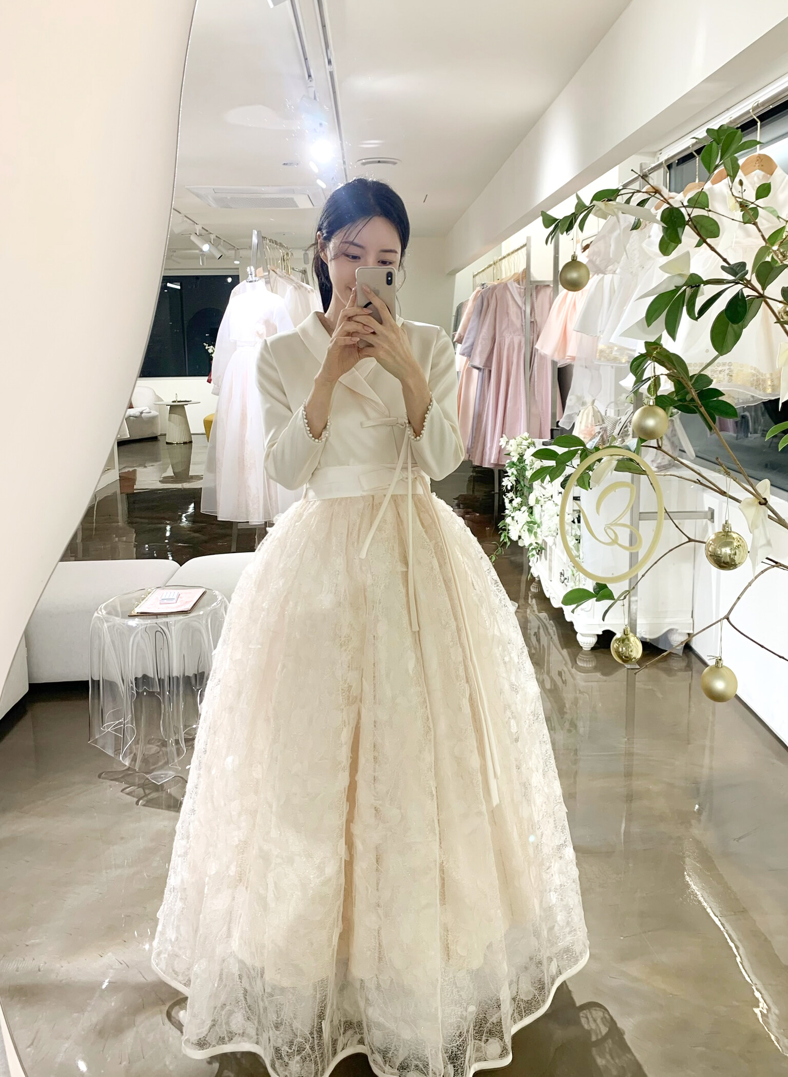 은은하게 빛나는 텍스처가 겹겹이 레이어드되어 깊이감 있는 실루엣을 완성하며, 케이드레스와 함께 착용 시 더욱 풍성하고 우아한 라인을 연출합니다.