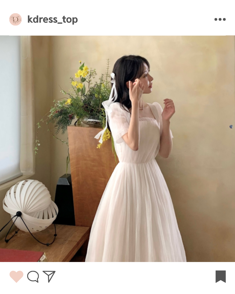 스퀘어넥과 가볍게 퍼지는 퍼프 소매가 여리여리한 실루엣을 강조하는 드레스입니다. 은은한 펄이 감도는 원단으로 제작되어, 발랄하고도 우아한 분위기를 동시에 자아냅니다.