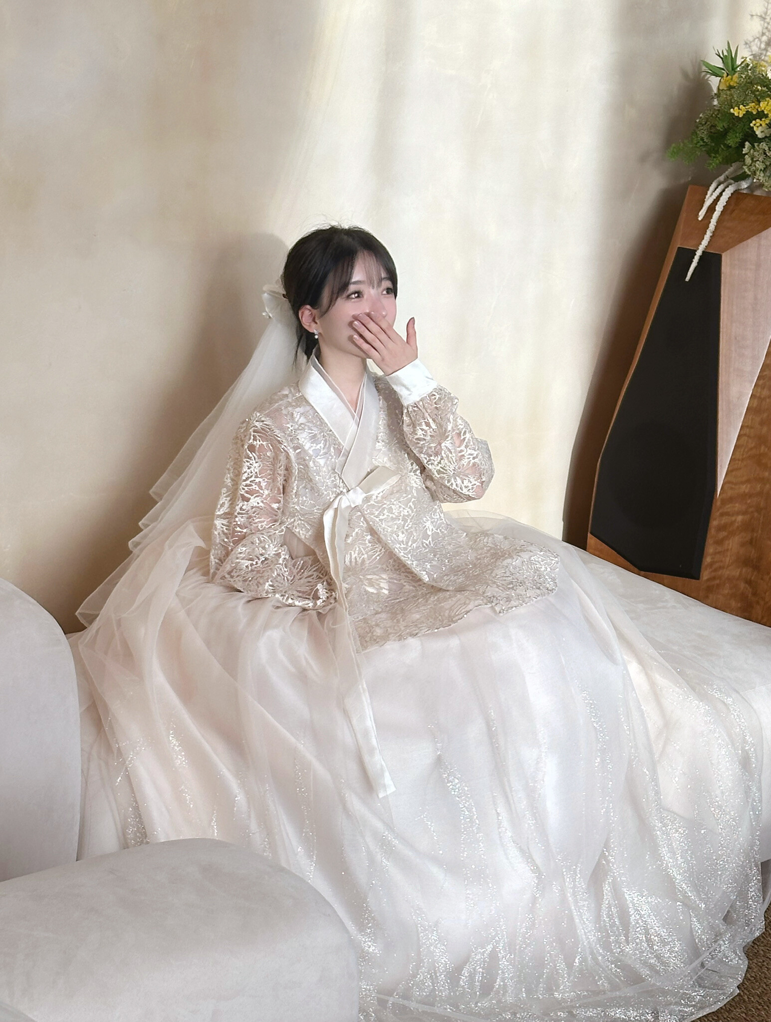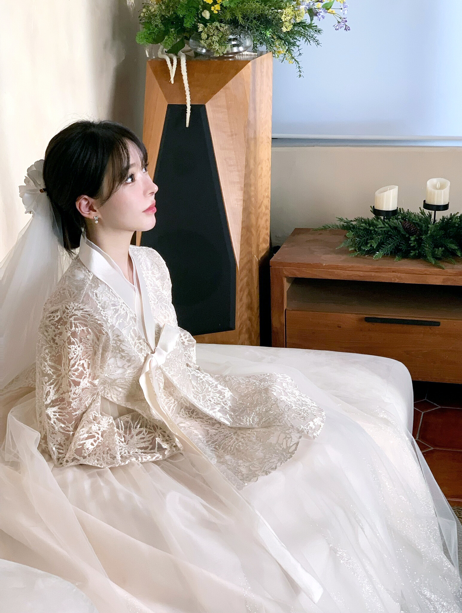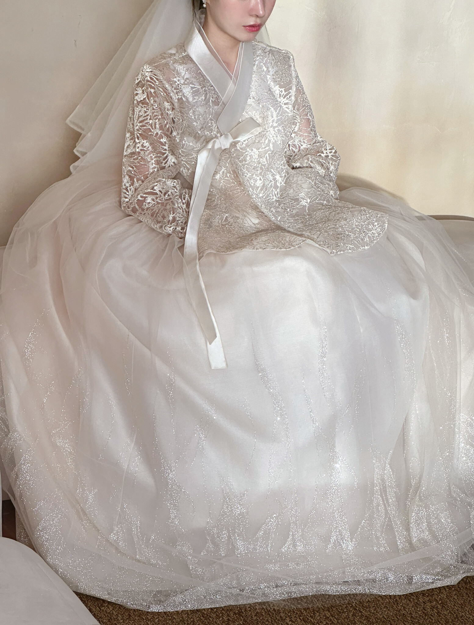 Crafted from delicate lace see-through fabric with a subtle floral pattern, the top exudes a soft glow, creating an elegant and refined impression. Paired with a voluminous skirt that gently sparkles with an aurora-like shimmer, the look strikes a beautiful balance. Infused with the grace of traditional hanbok, this piece is both poised and romantic—making it a perfect choice even for a wedding ceremony.