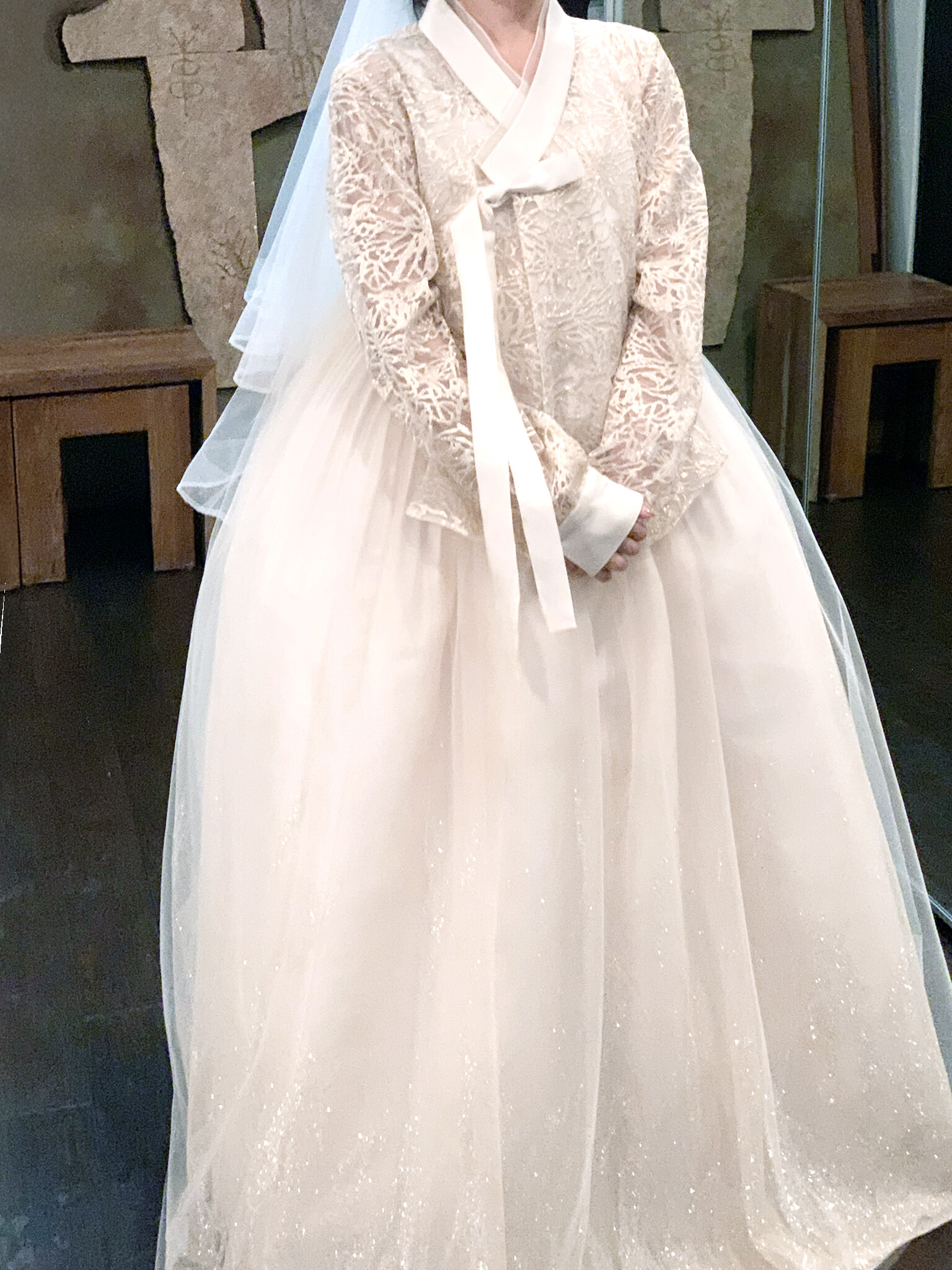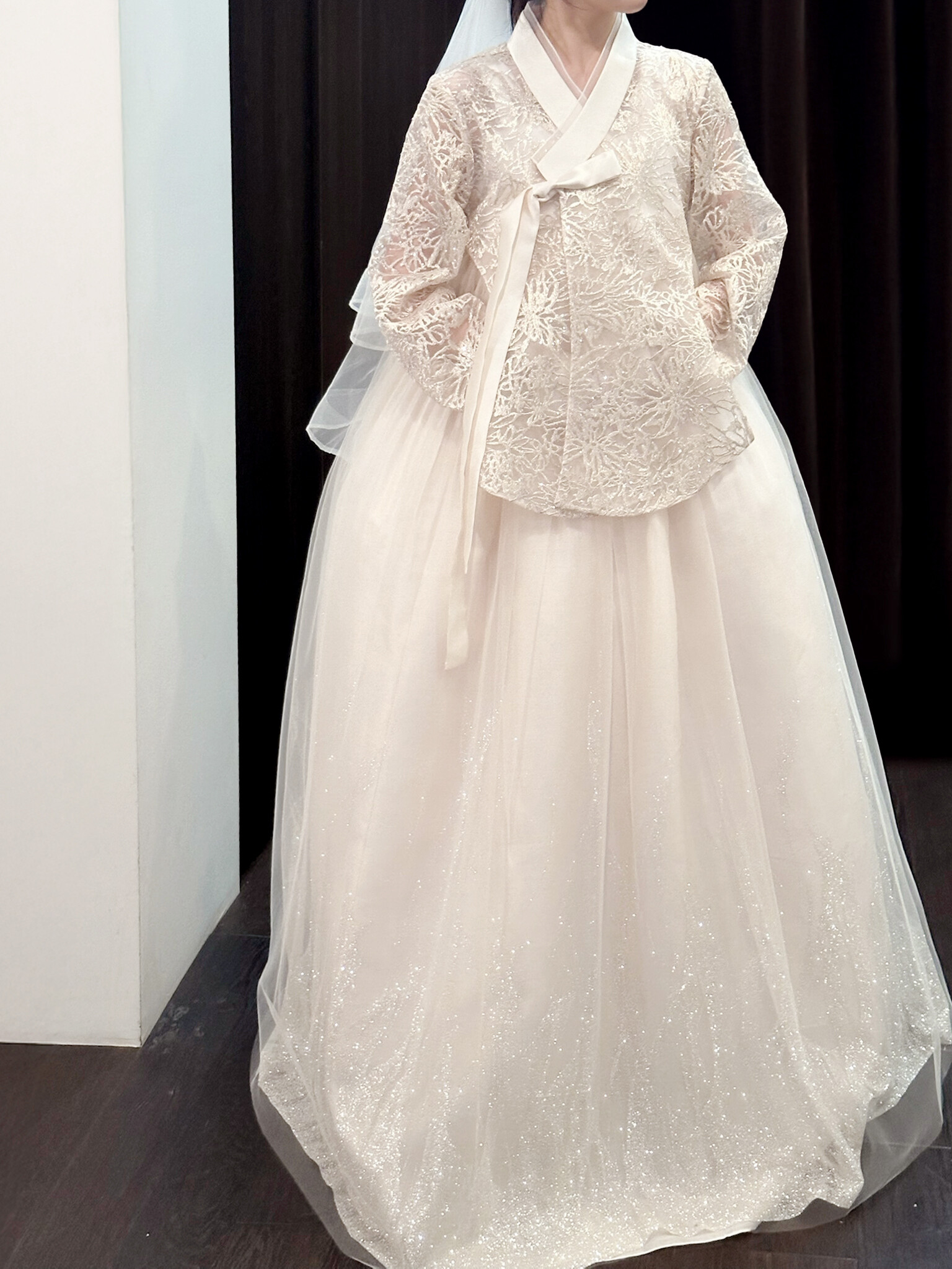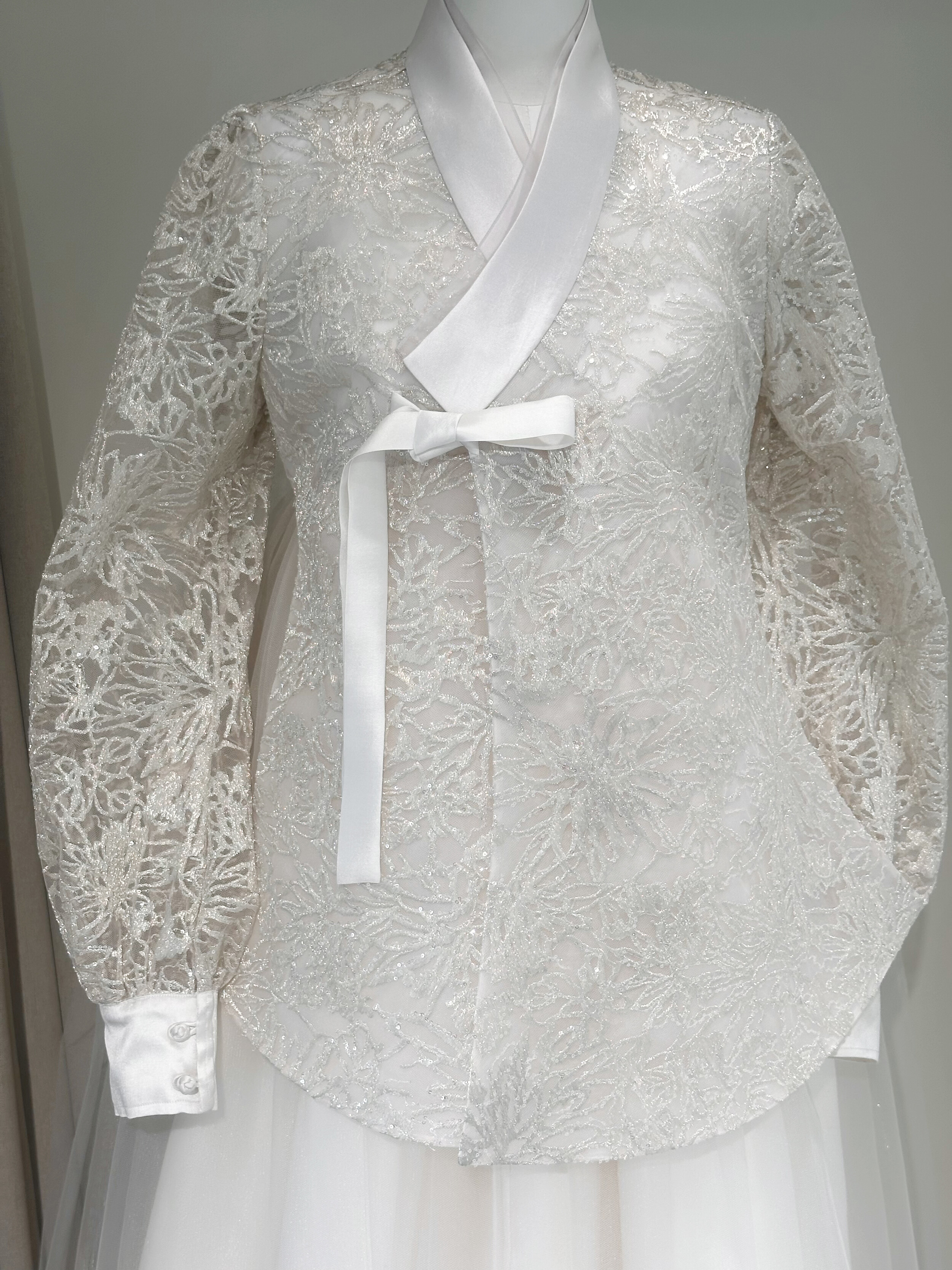 은은하고 섬세한 플라워 패턴의 레이스 시스루 원단으로 제작되어 부드러운 빛을 머금은 듯한 고운 분위기의 당의와, 풍성하게 퍼지는 실루엣에 잔잔한 펄감이 더해져 오로라처럼 반짝이는 치마가 조화를 이룹니다. 한복의 느낌을 담아 단아하며, 본식 드레스로도 손색없는 존재감과 로맨틱함을 지녔습니다.