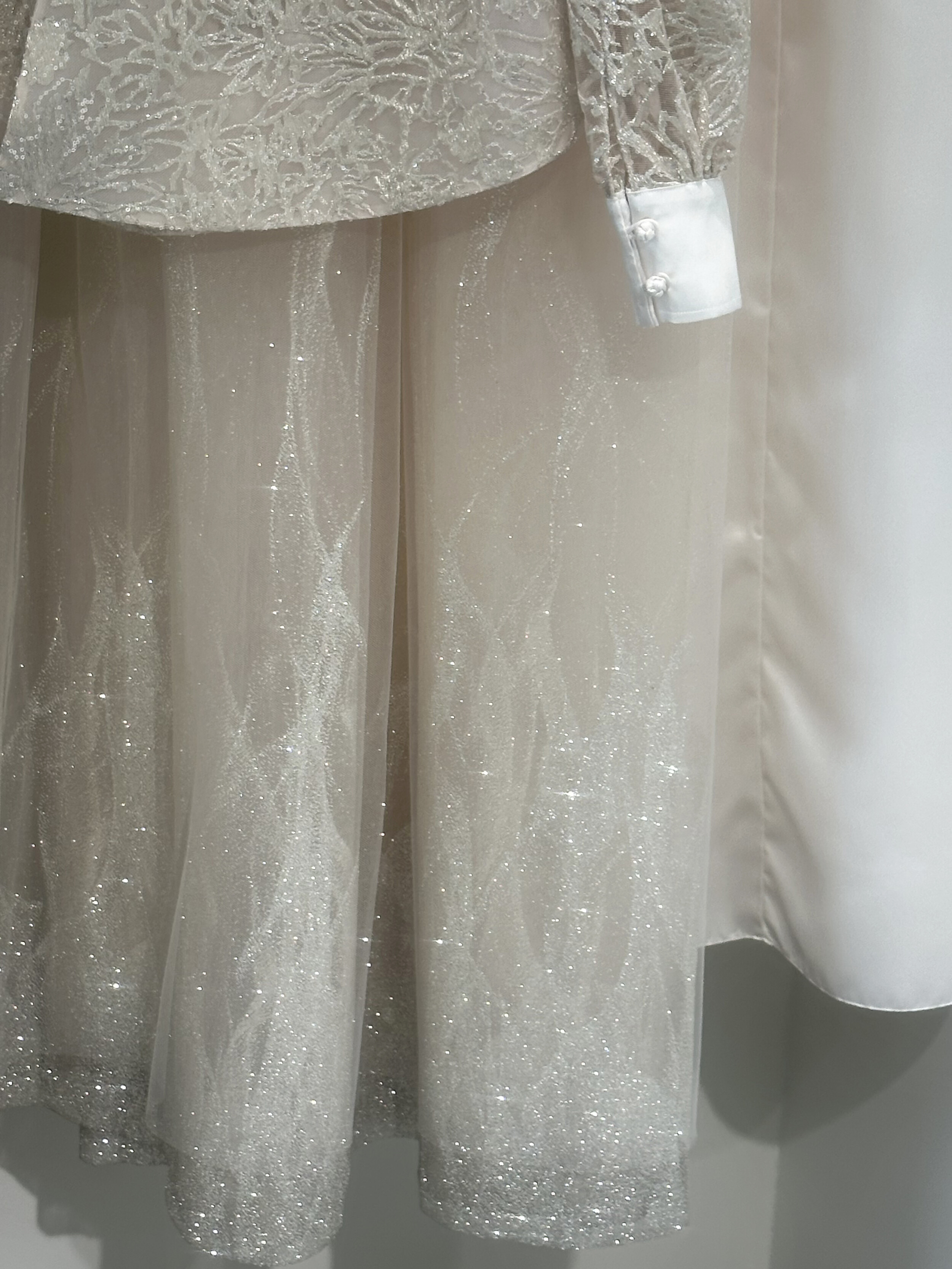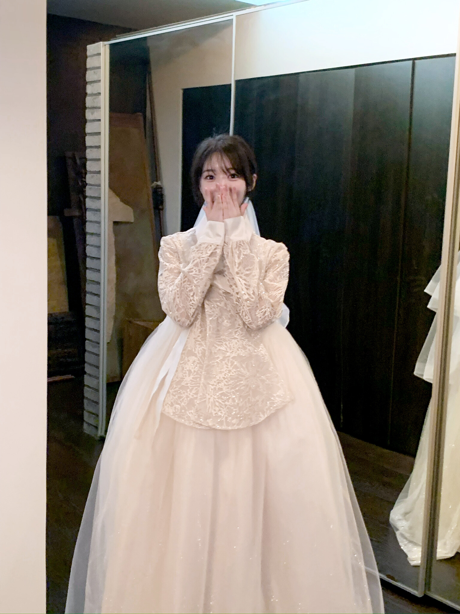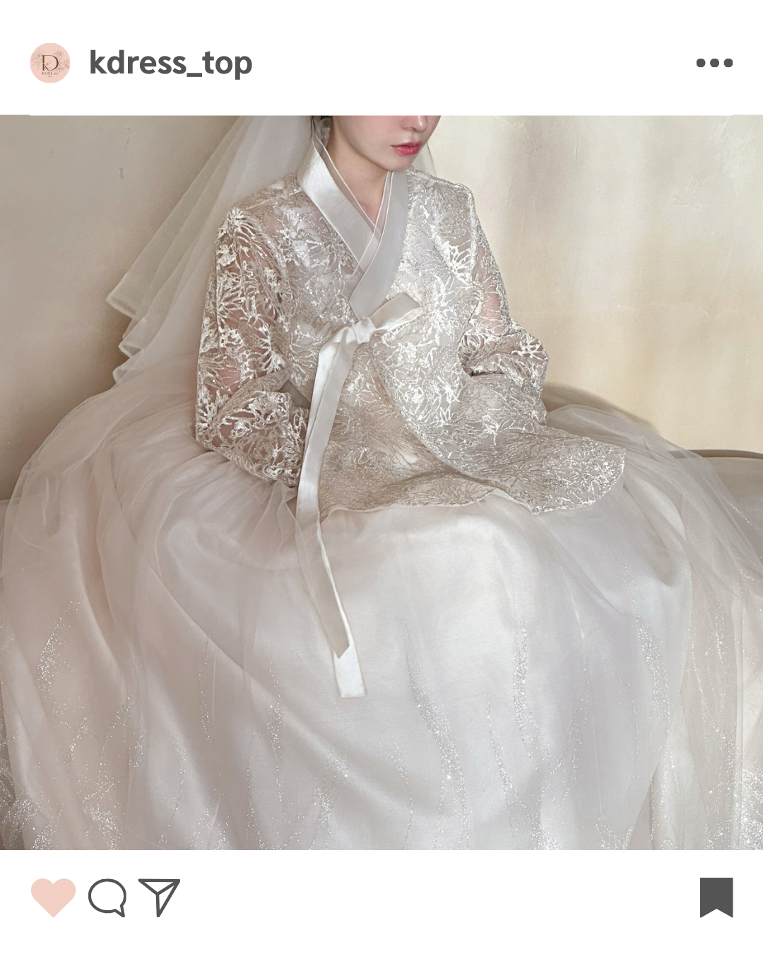 은은하고 섬세한 플라워 패턴의 레이스 시스루 원단으로 제작되어 부드러운 빛을 머금은 듯한 고운 분위기의 당의와, 풍성하게 퍼지는 실루엣에 잔잔한 펄감이 더해져 오로라처럼 반짝이는 치마가 조화를 이룹니다. 한복의 느낌을 담아 단아하며, 본식 드레스로도 손색없는 존재감과 로맨틱함을 지녔습니다.