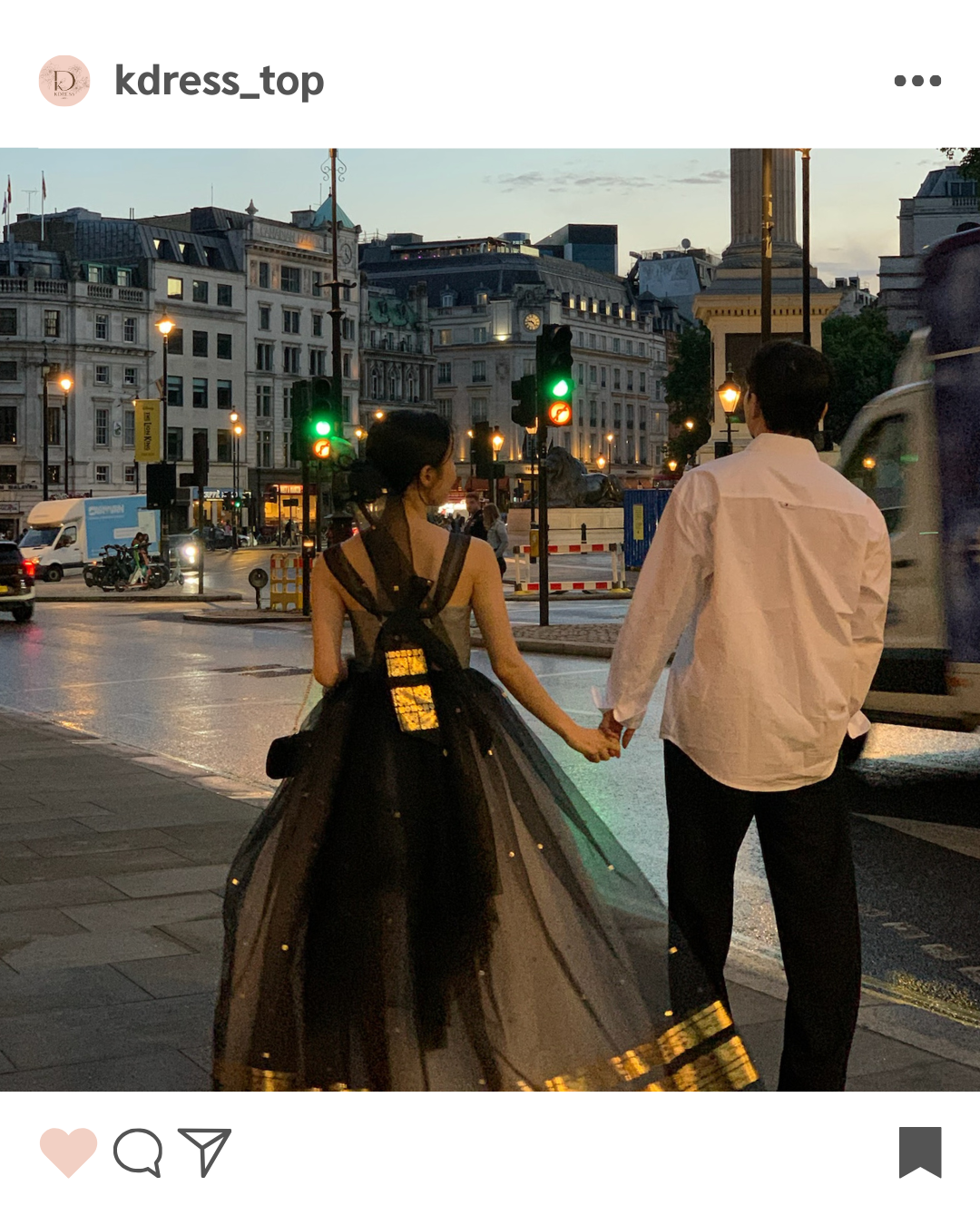 전통 한복의 감성을 우아하게 서양식 실루엣에 녹여냈습니다. 투명한 오간자 소재를 활용하여 로맨틱하고 여리여리한 무드를 자아내며, 자연스럽게 퍼지는 A라인 실루엣으로 풍성함을 더했습니다. 밑단을 따라 섬세하게 더해진 금박 패턴 장식이 은은한 빛을 머금어 전통미와 함께 고급스럽고 화려한 분위기를 완성합니다.