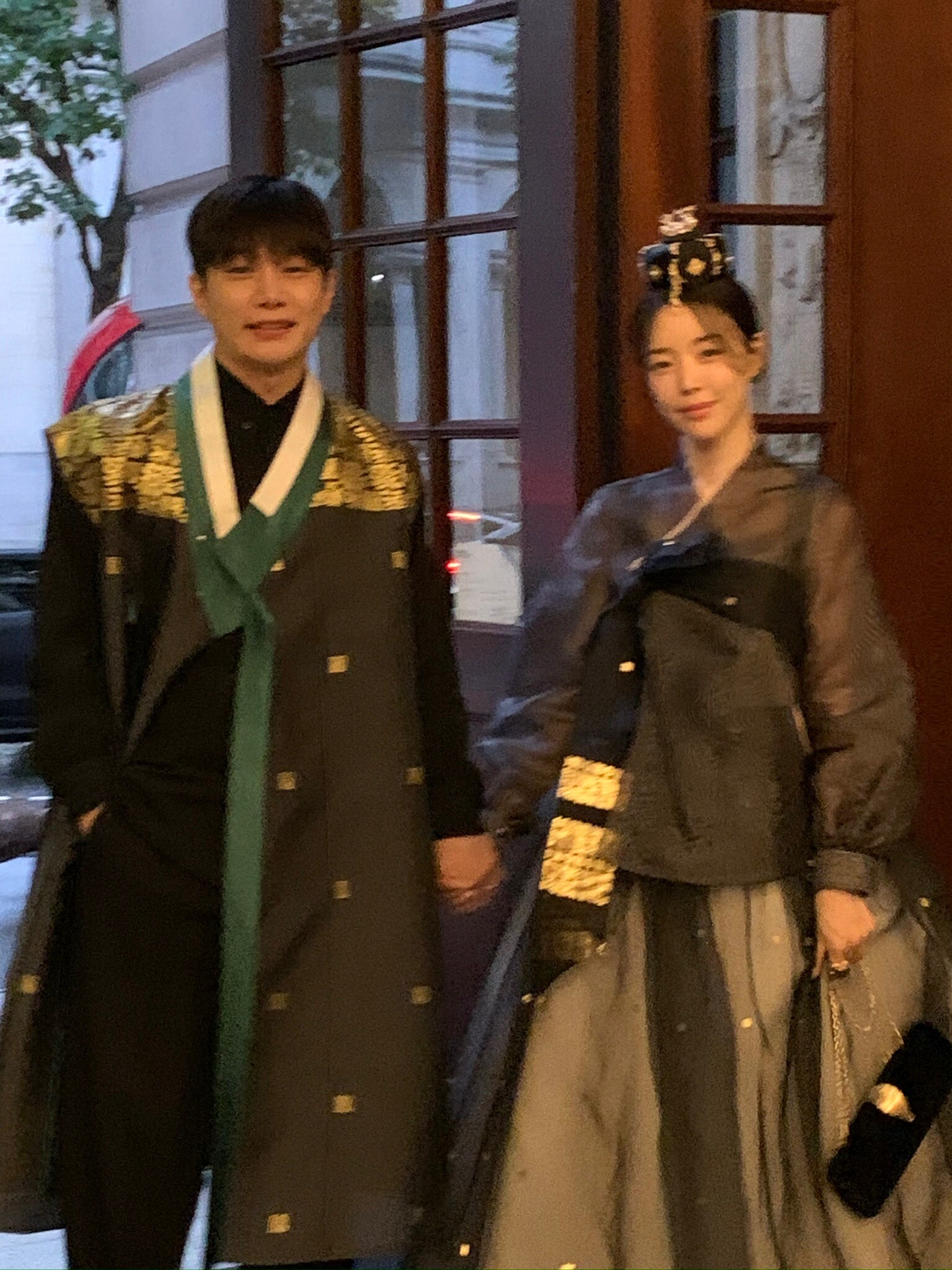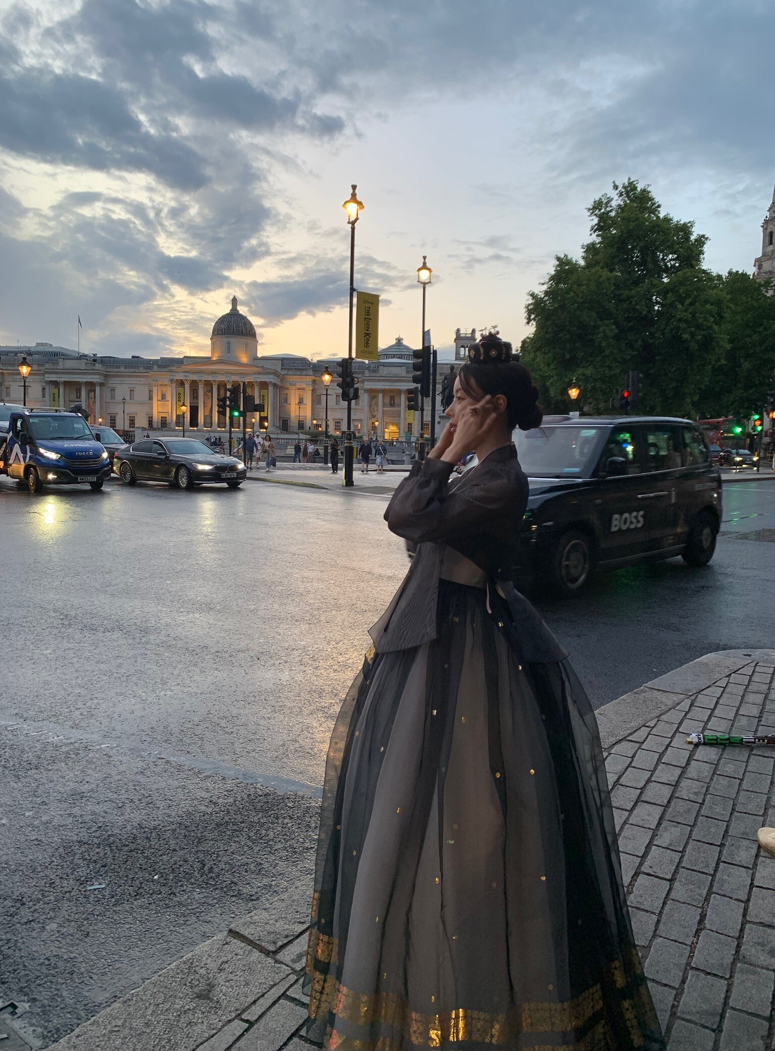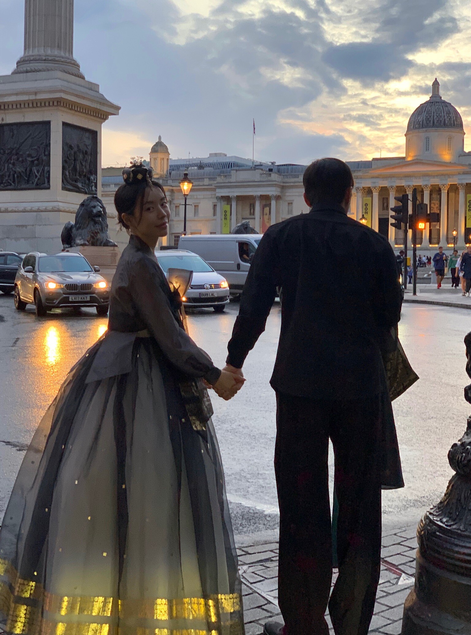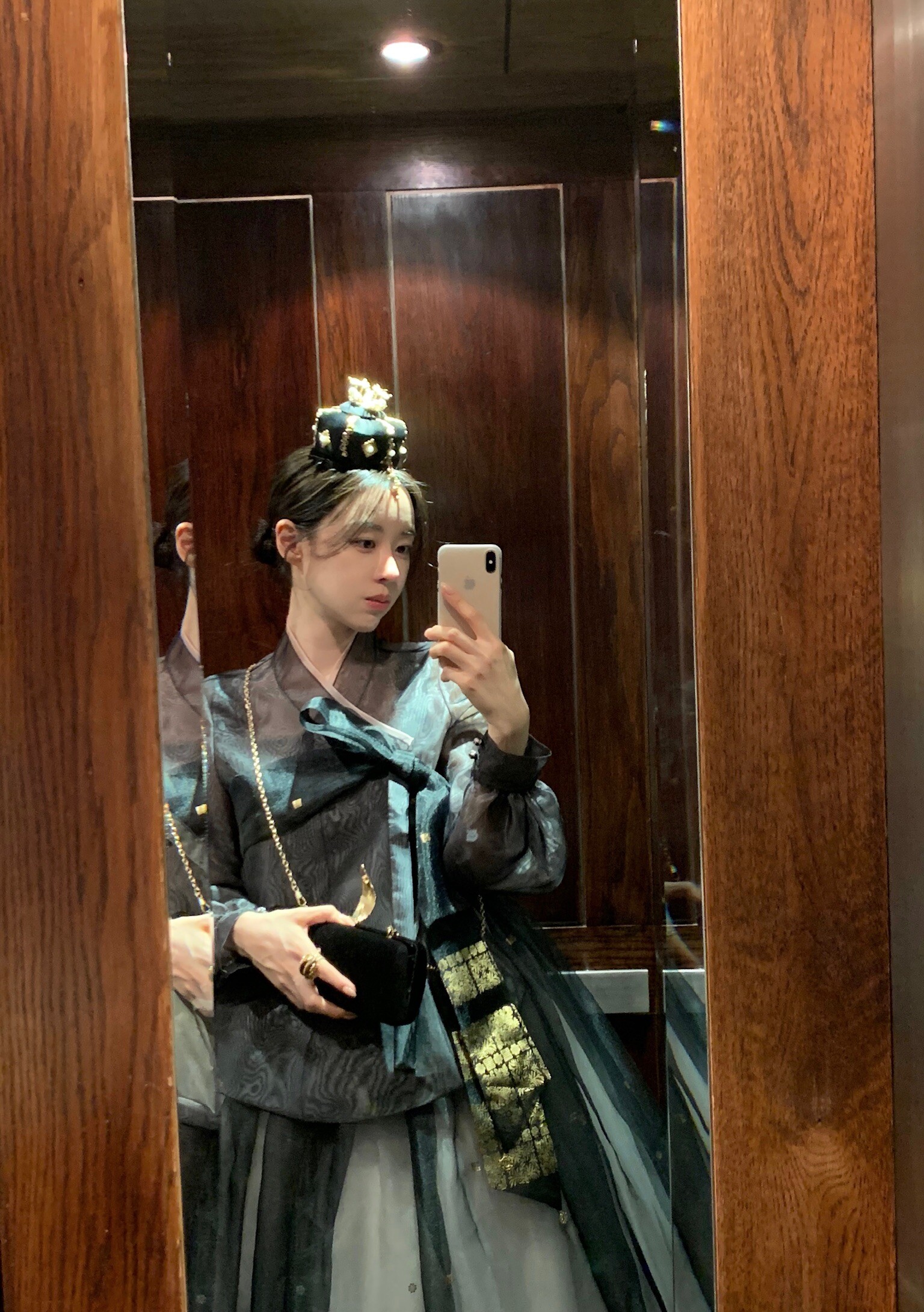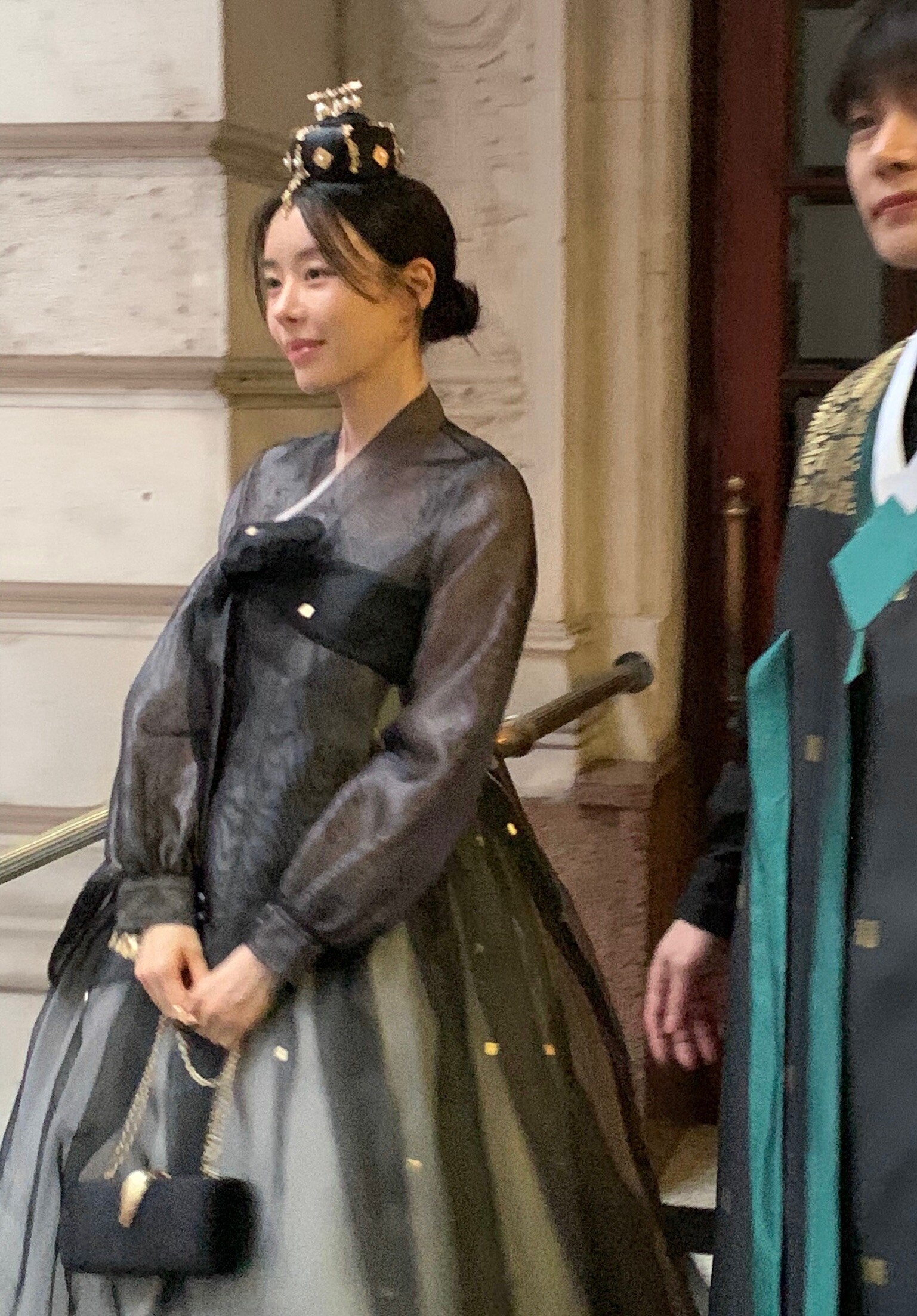 This Organza dress gracefully blends the sentiment of traditional Korean hanbok with a Western silhouette. The sheer, lightweight fabric creates a romantic and delicate mood, while the softly flared A-line shape adds volume and elegance. Intricate gold foil details along the hem subtly catch the light, infusing the look with traditional charm and a touch of luxurious brilliance.