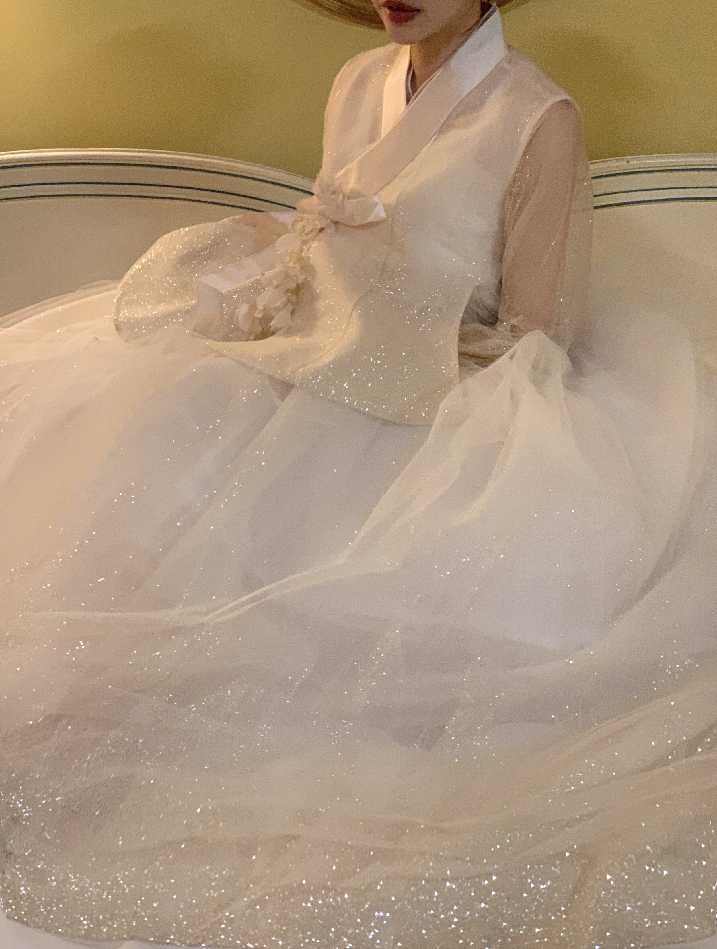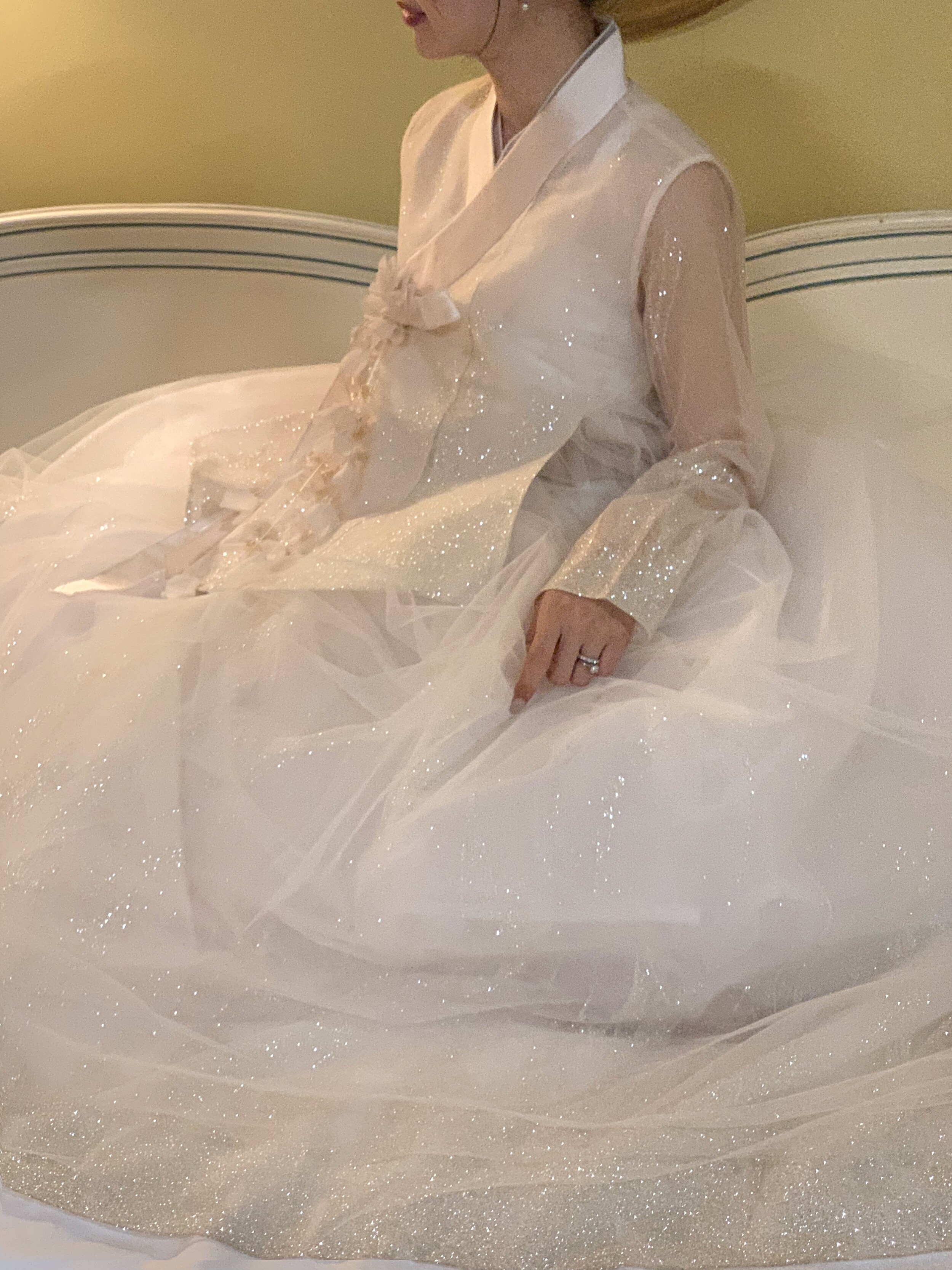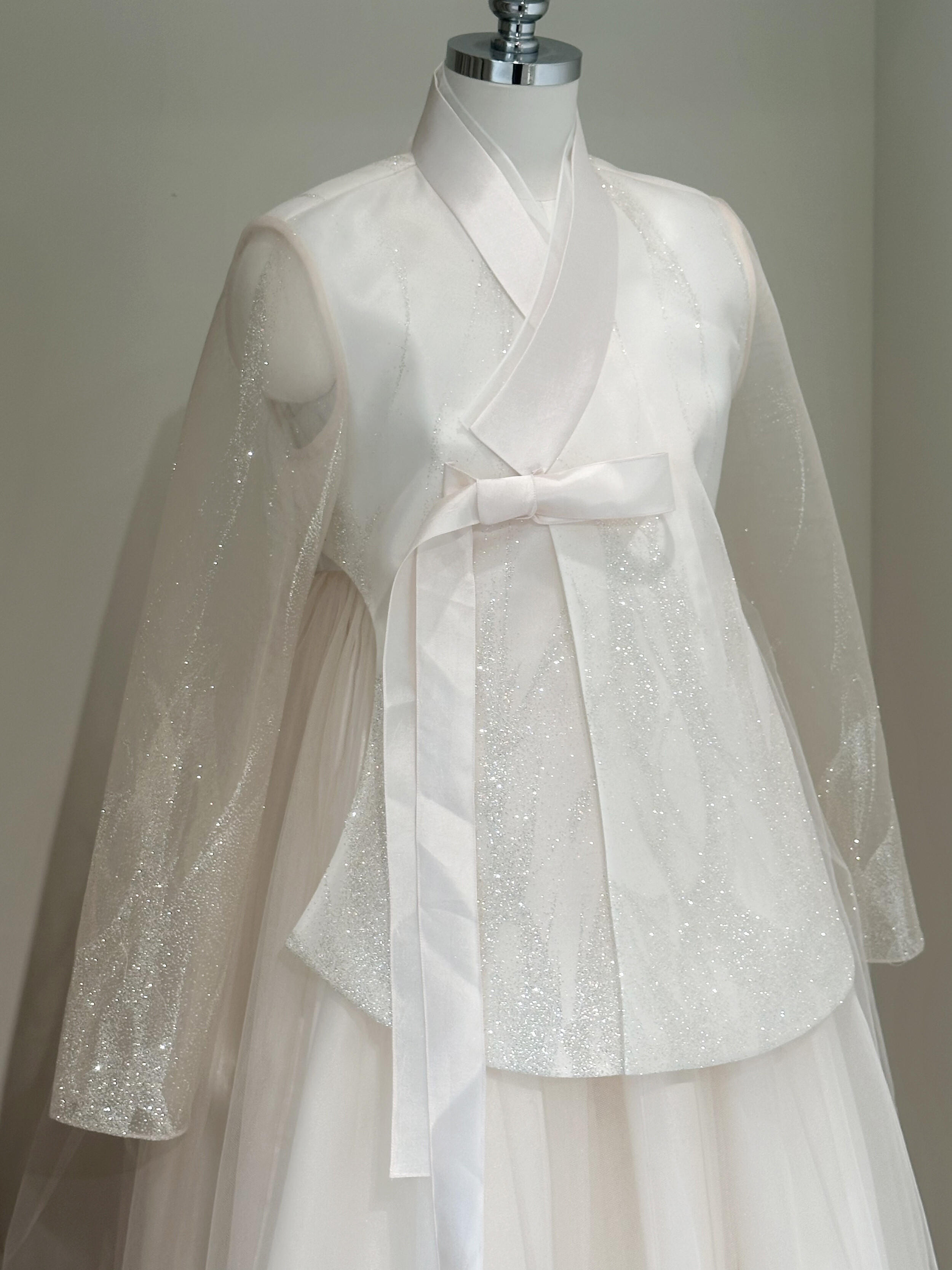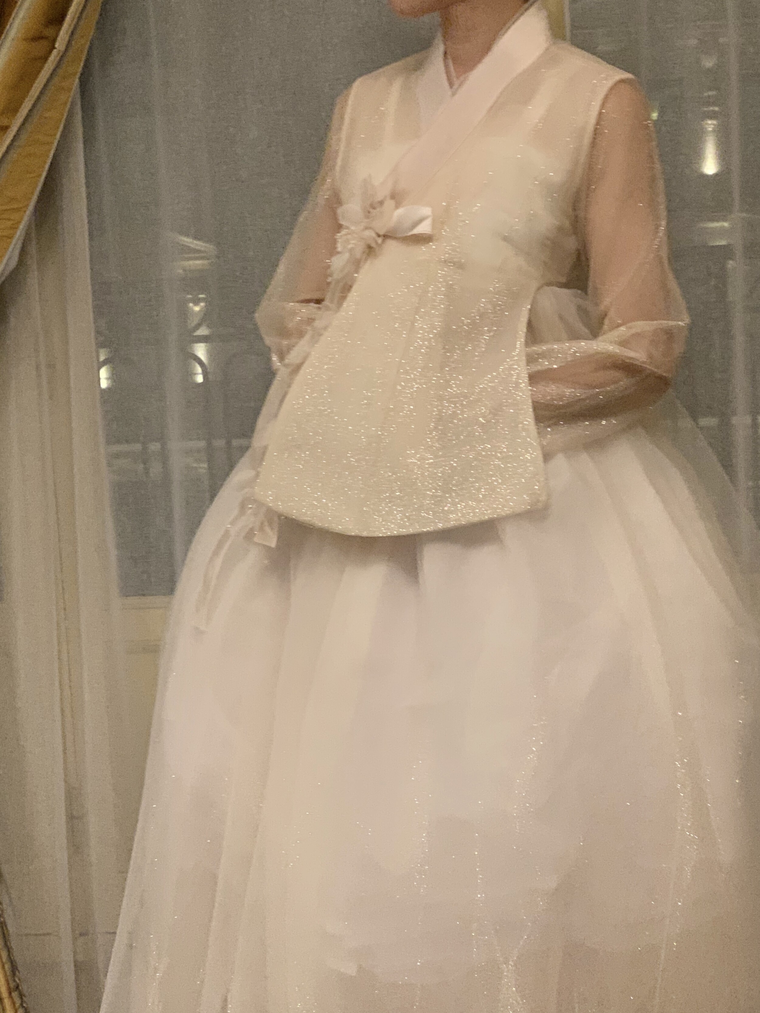 이름처럼 은하수의 반짝임을 닮은 은은한 펄감이 가득해, 빛 아래에서 한층 더 시선을 사로잡습니다. 한복의 감성을 한 스푼 담아 고급스럽고 우아하며, 풍성한 치마 라인 덕분에 본식 웨딩드레스로도 손색이 없습니다.