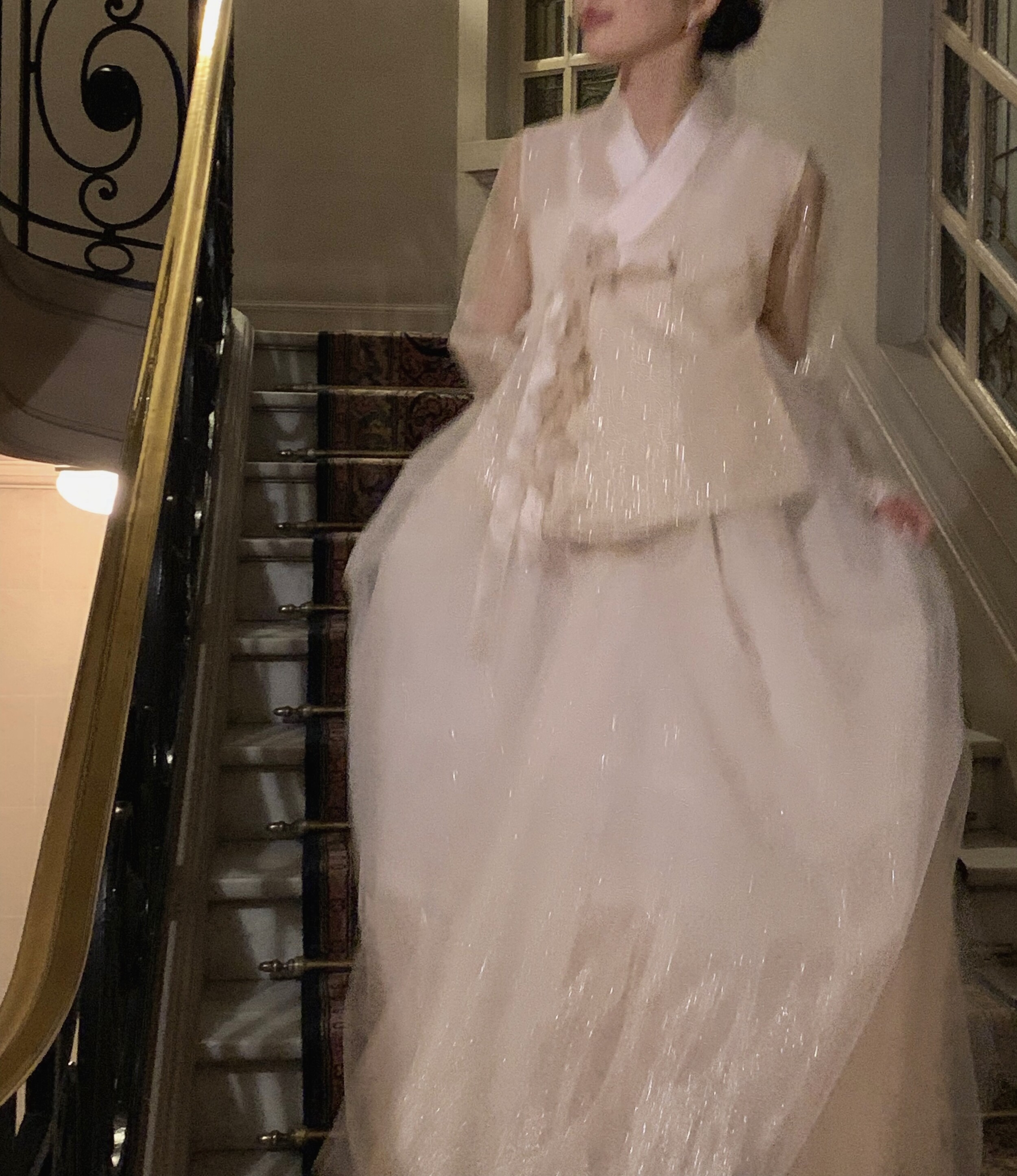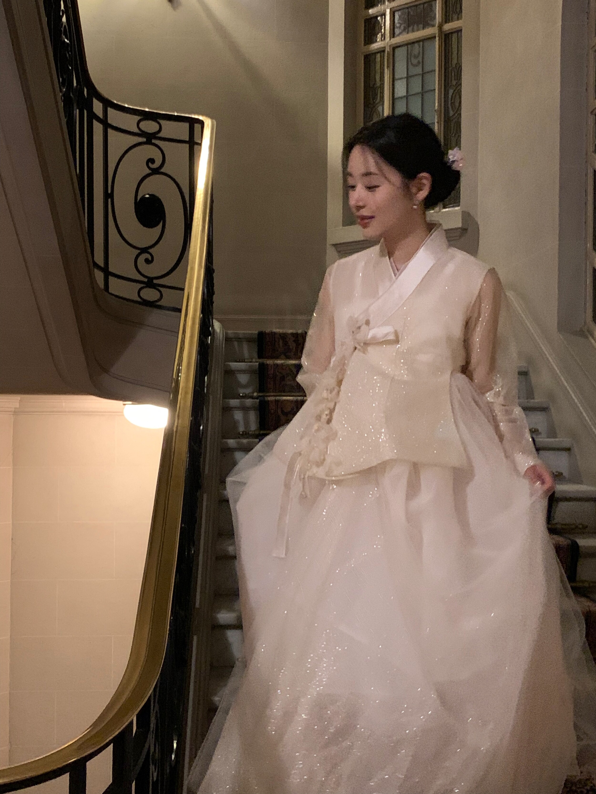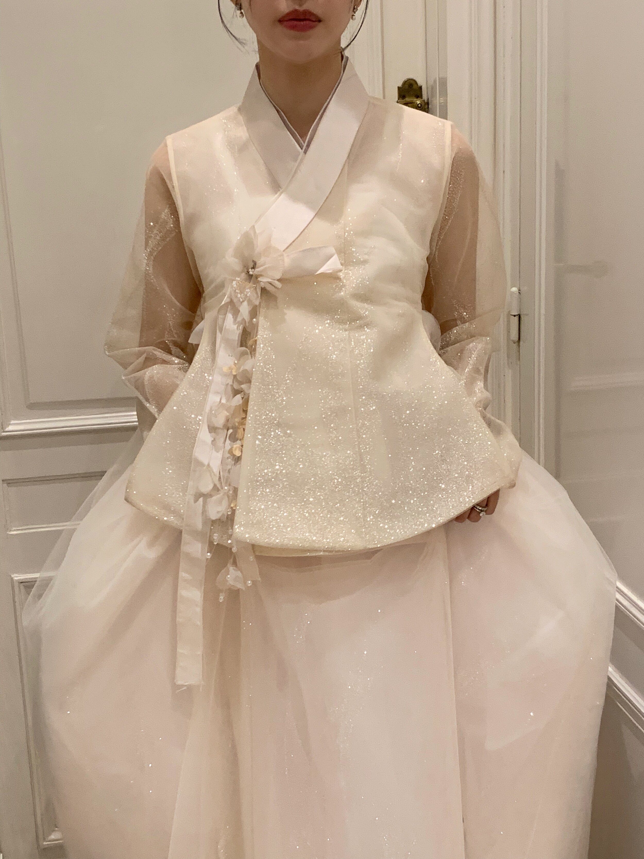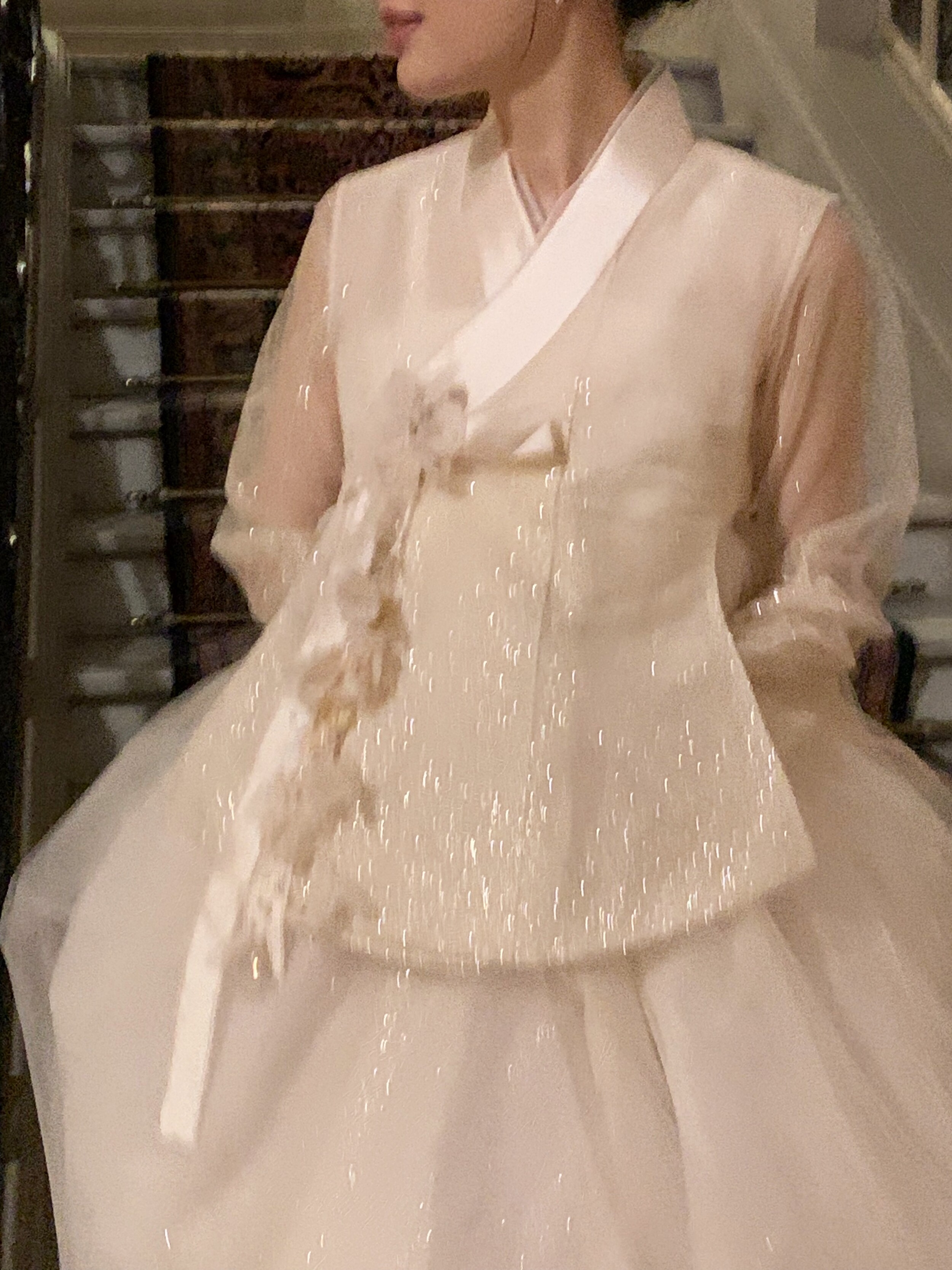 이름처럼 은하수의 반짝임을 닮은 은은한 펄감이 가득해, 빛 아래에서 한층 더 시선을 사로잡습니다. 한복의 감성을 한 스푼 담아 고급스럽고 우아하며, 풍성한 치마 라인 덕분에 본식 웨딩드레스로도 손색이 없습니다.