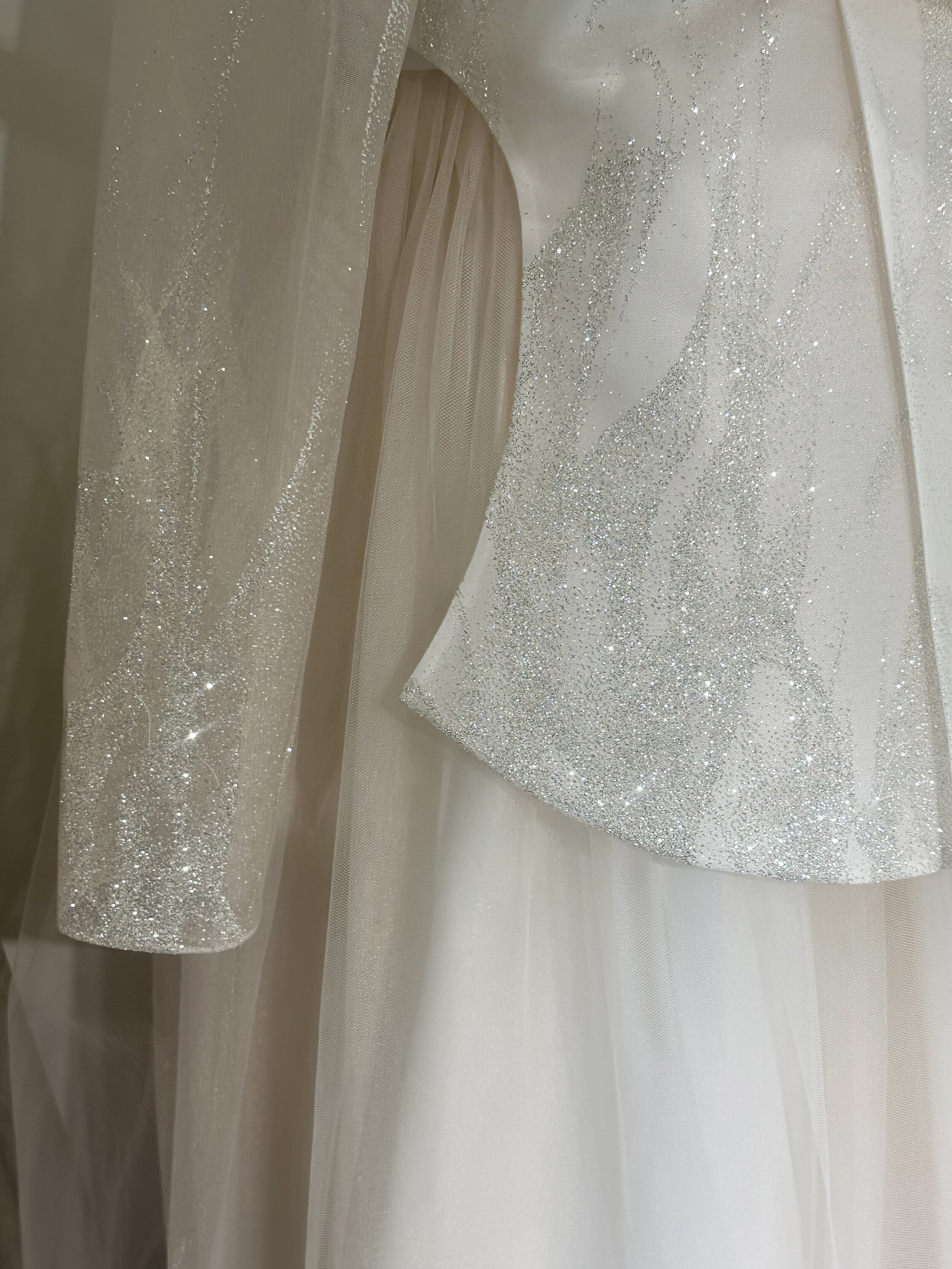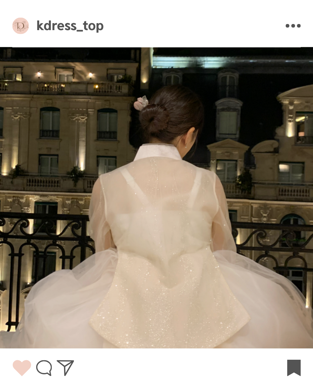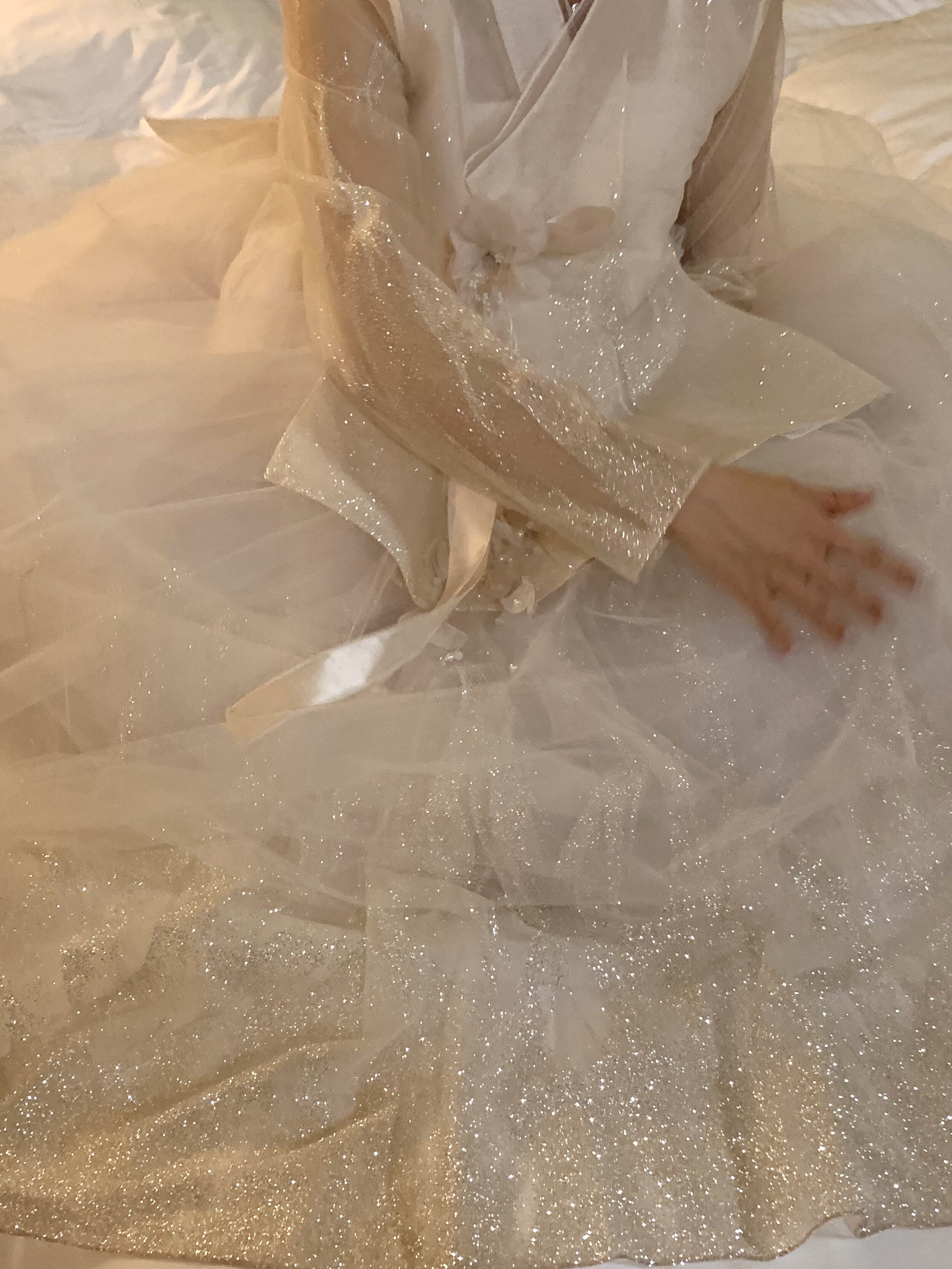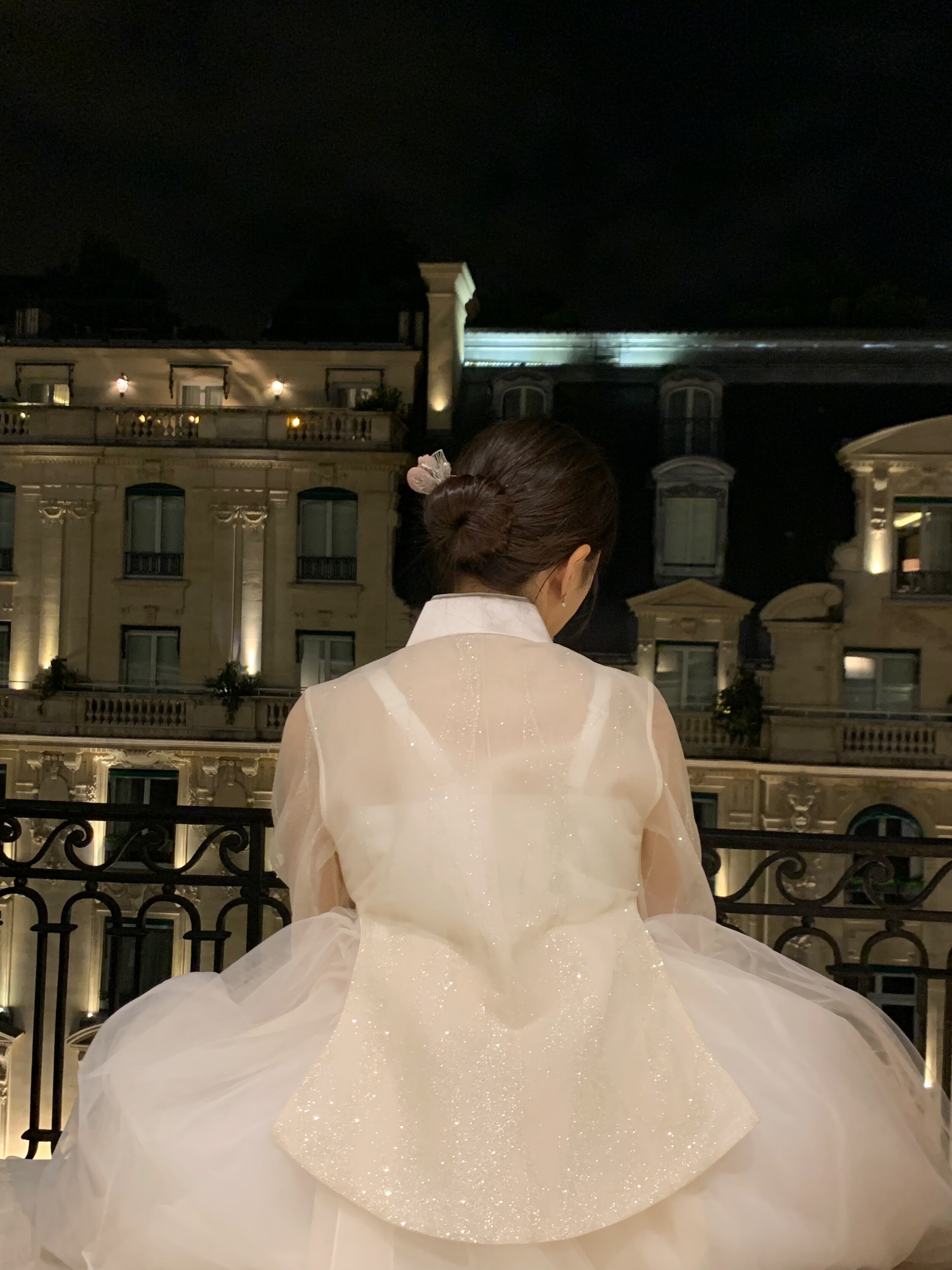 이름처럼 은하수의 반짝임을 닮은 은은한 펄감이 가득해, 빛 아래에서 한층 더 시선을 사로잡습니다. 한복의 감성을 한 스푼 담아 고급스럽고 우아하며, 풍성한 치마 라인 덕분에 본식 웨딩드레스로도 손색이 없습니다.