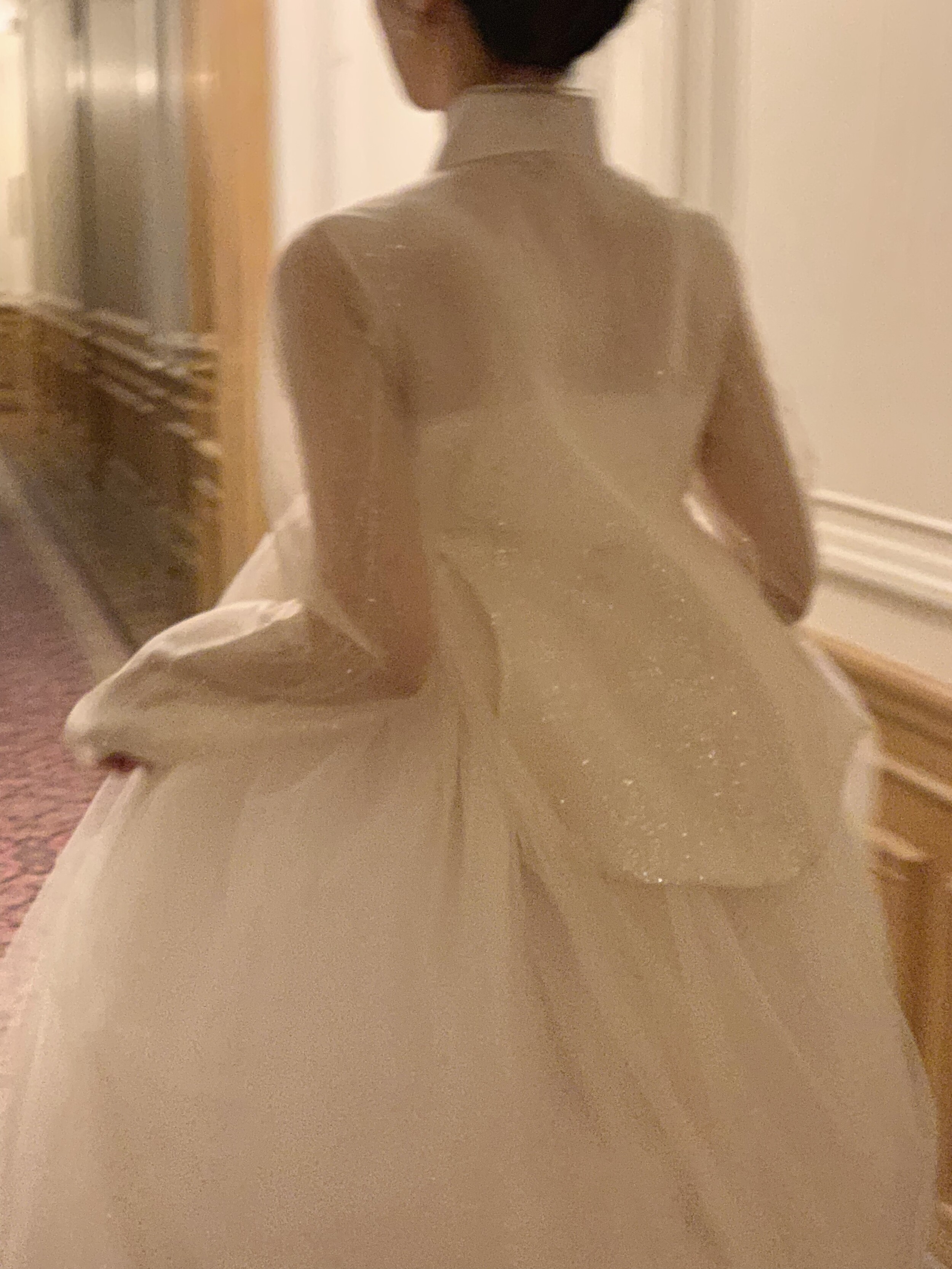 Just like its name, this piece shimmers with subtle pearls reminiscent of the Milky Way, drawing the eye even more under the light. Infused with a touch of hanbok elegance, it exudes both luxury and grace. The voluminous skirt makes it a perfect choice for a main ceremony wedding dress.