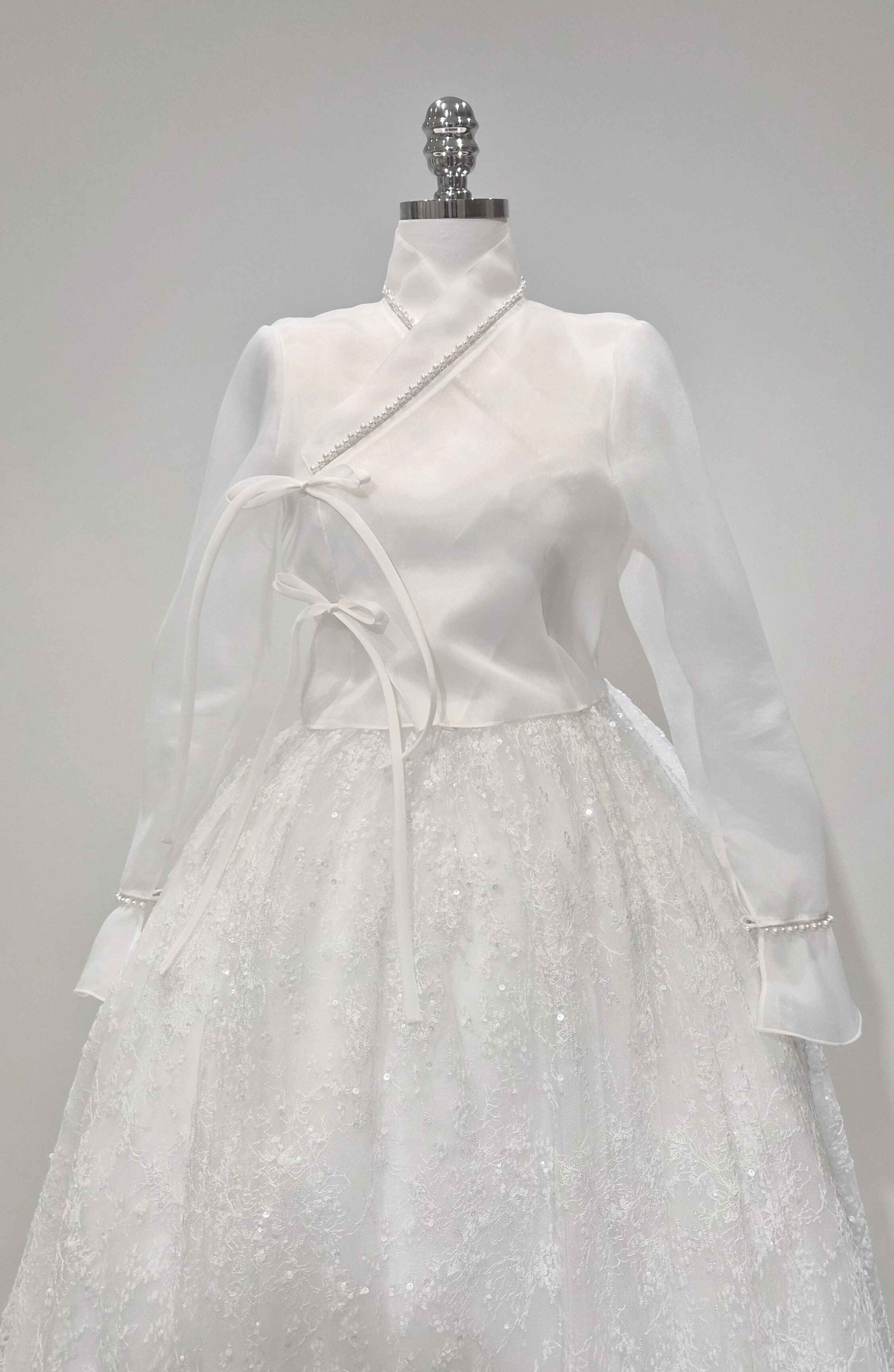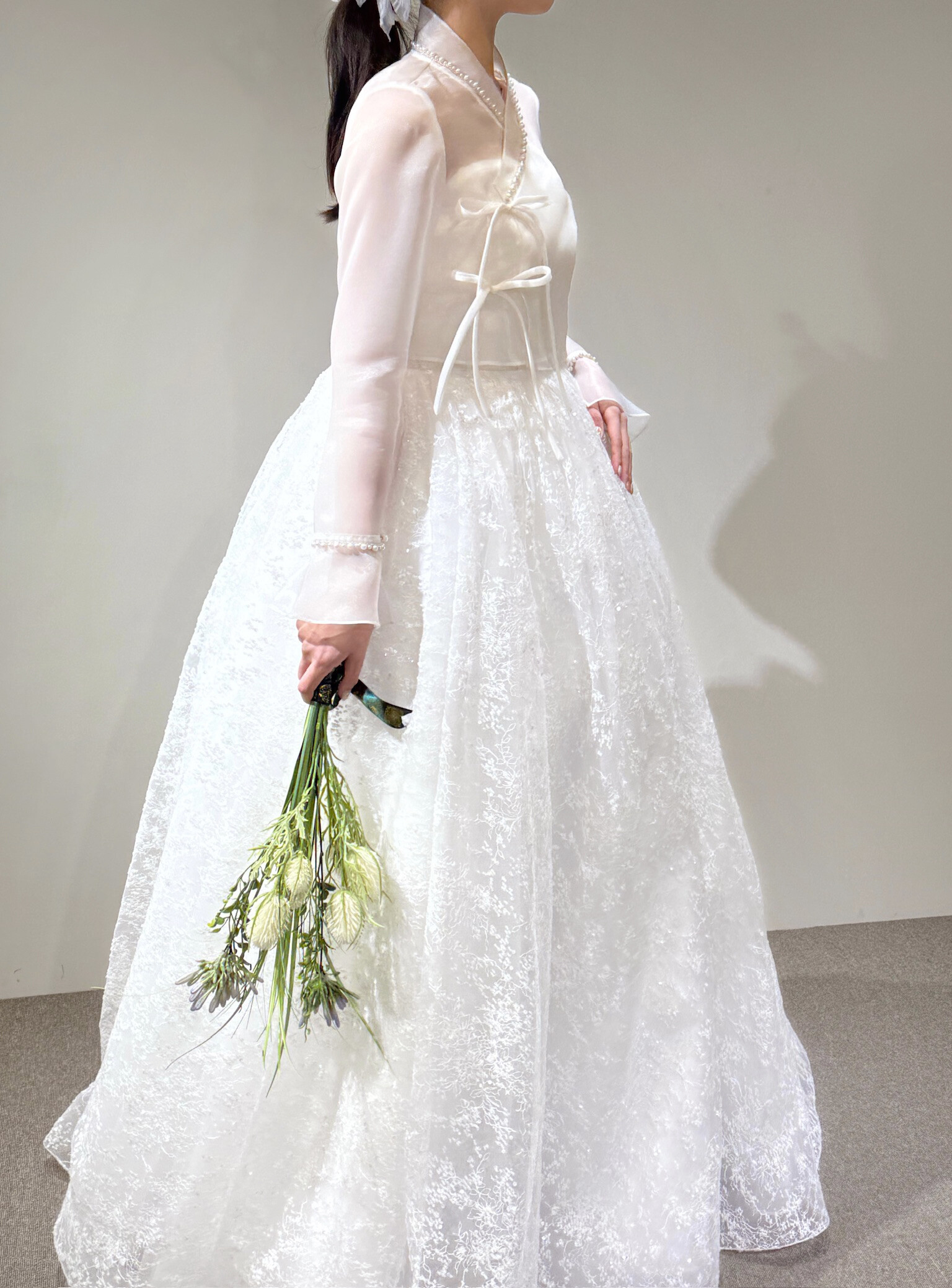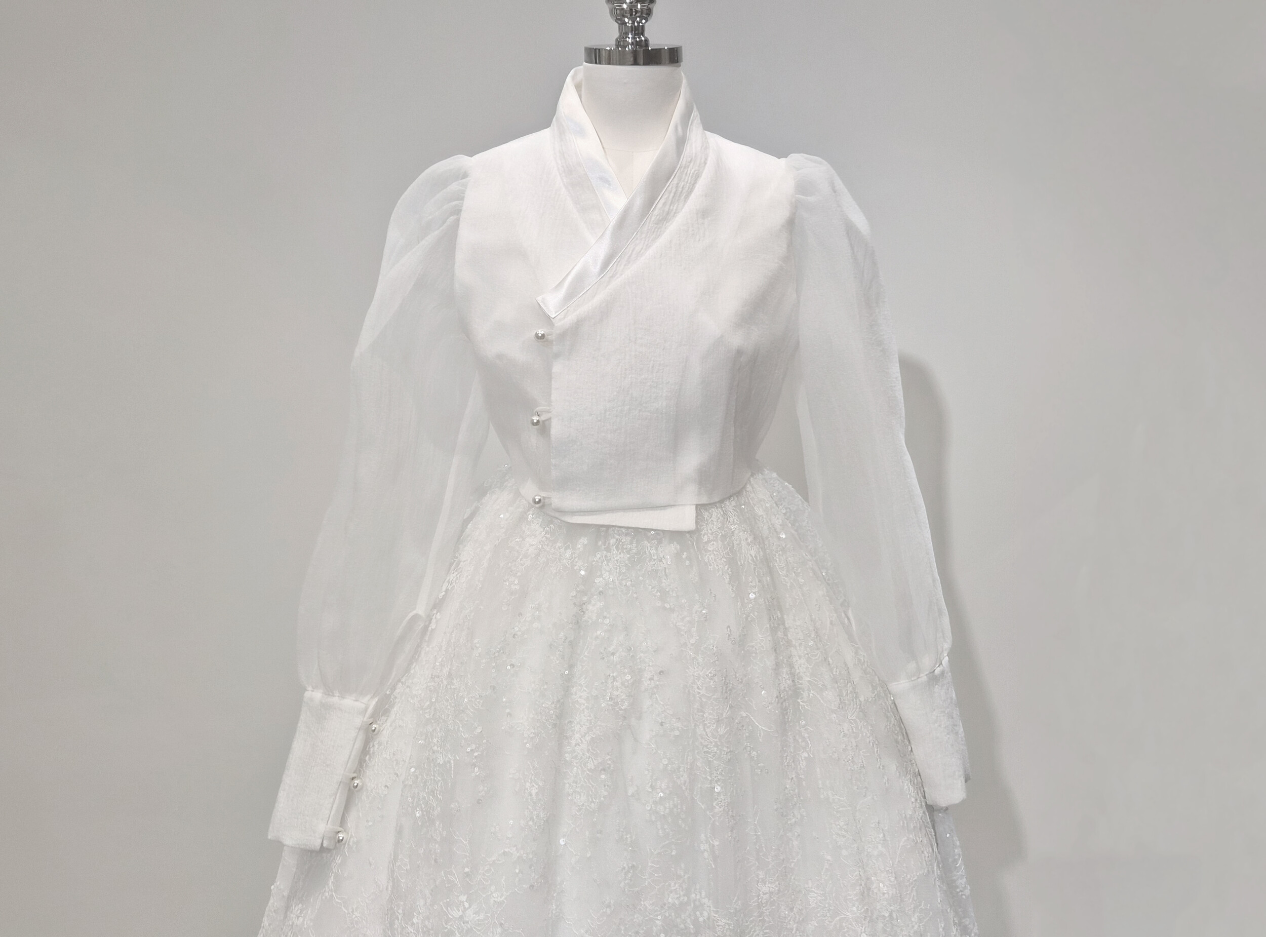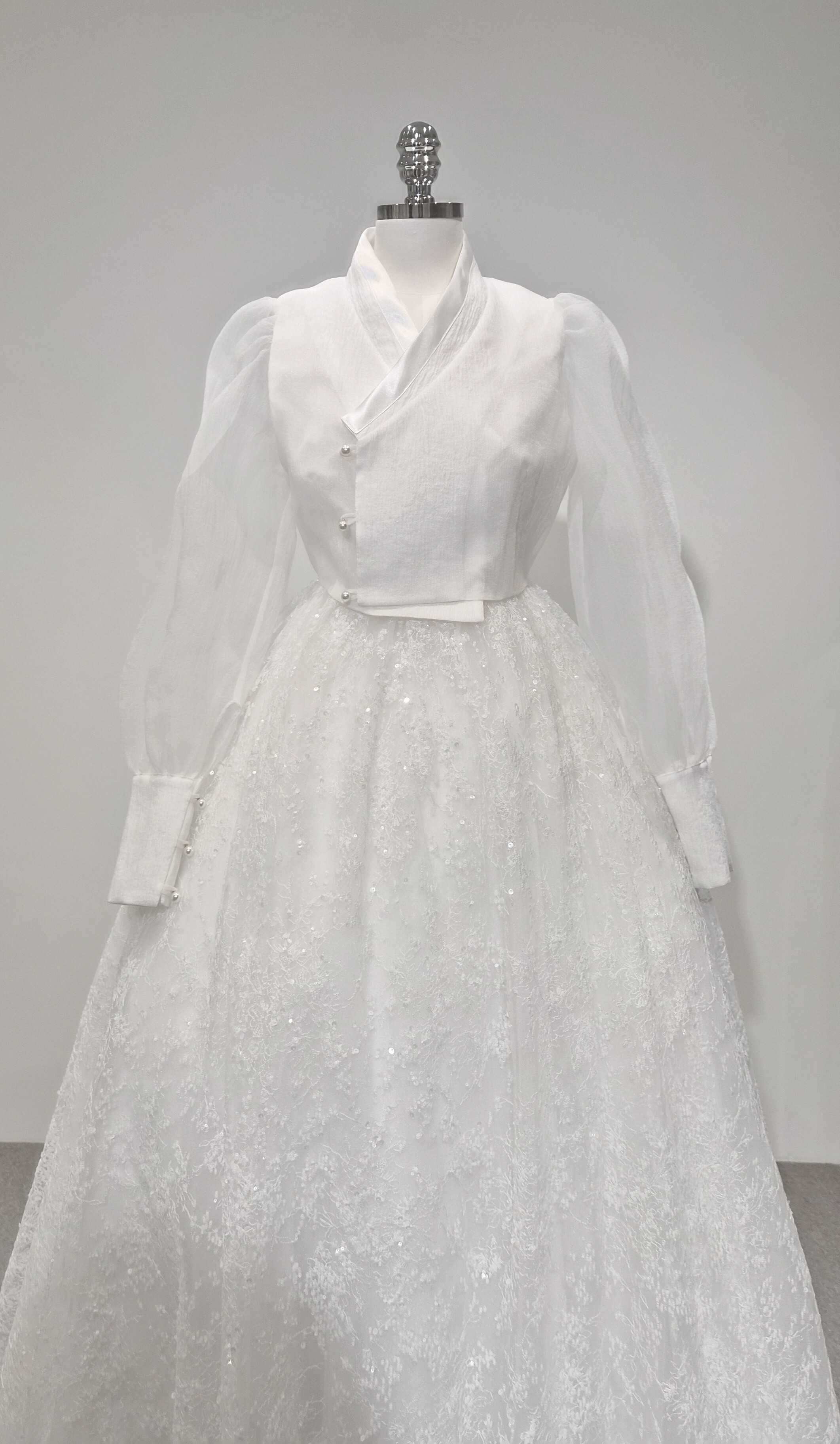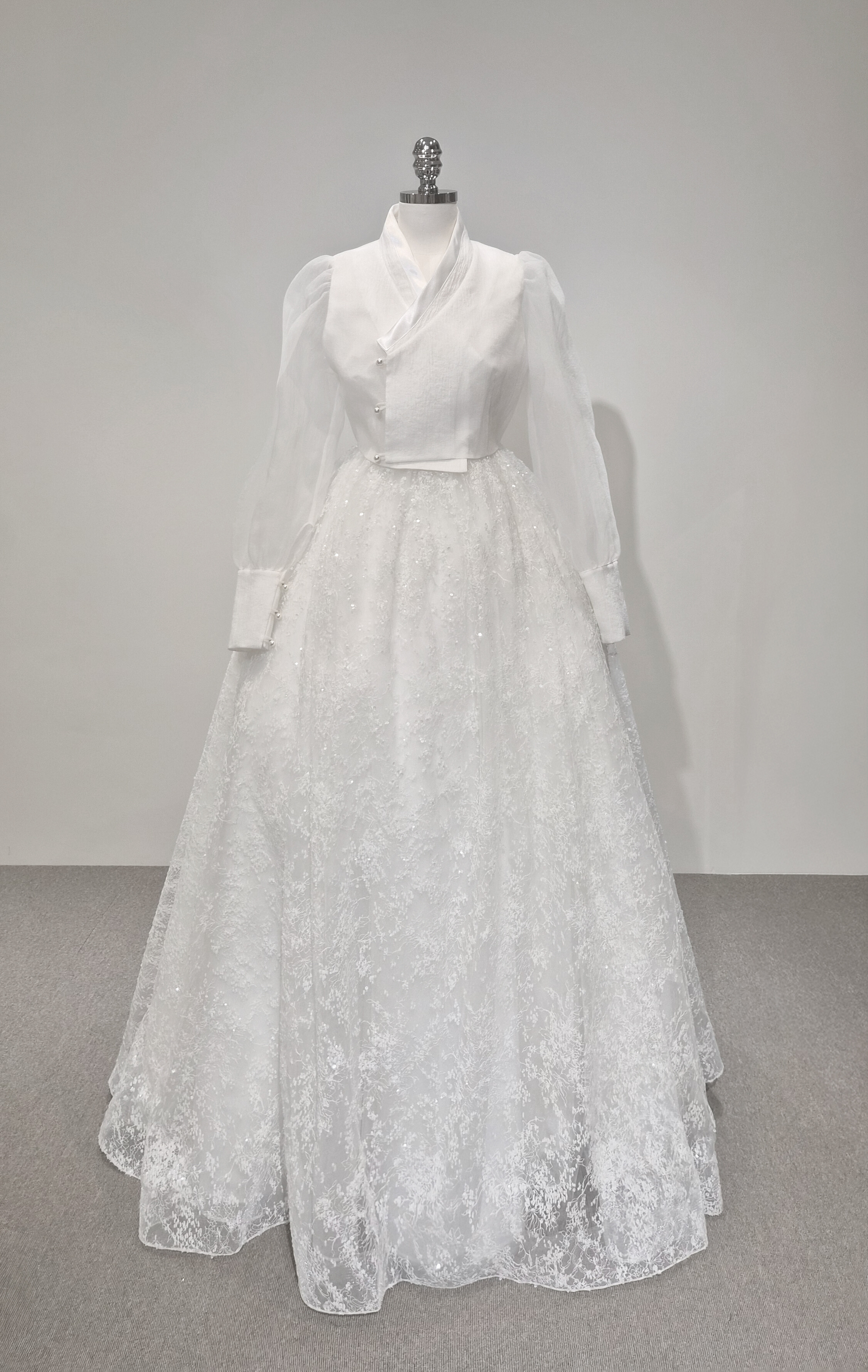 This dress features delicately scattered floral textures and soft silver sequins that catch the light beautifully, creating a subtle shimmer from every angle. Layers of fine embroidered lace add dimension, offering a refined texture that stands out in both natural daylight and indoor lighting.Designed with a full, voluminous silhouette, it provides an effortlessly graceful shape when worn. It pairs seamlessly with K-Dress blouses or traditional hanbok jeogori tops, elevating the entire look with an added touch of sophistication.