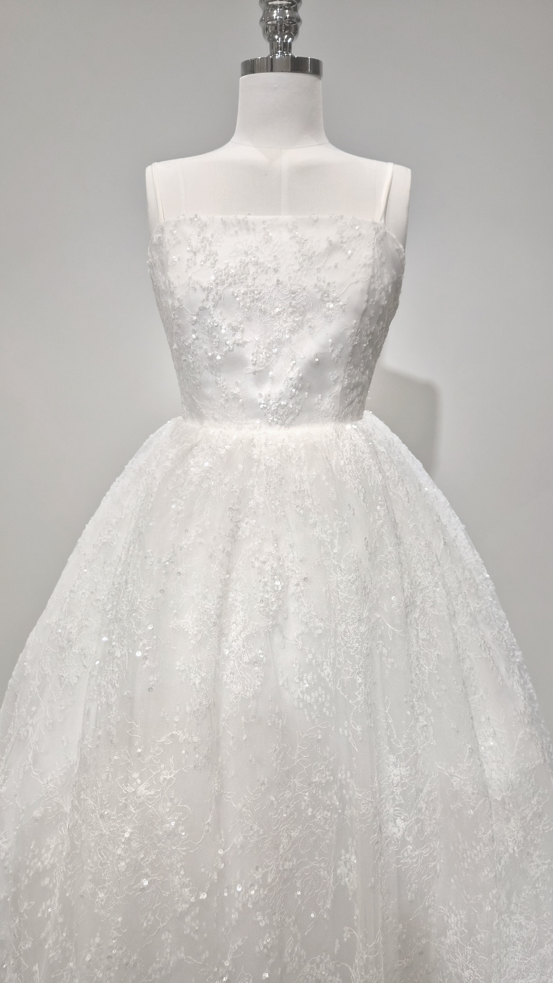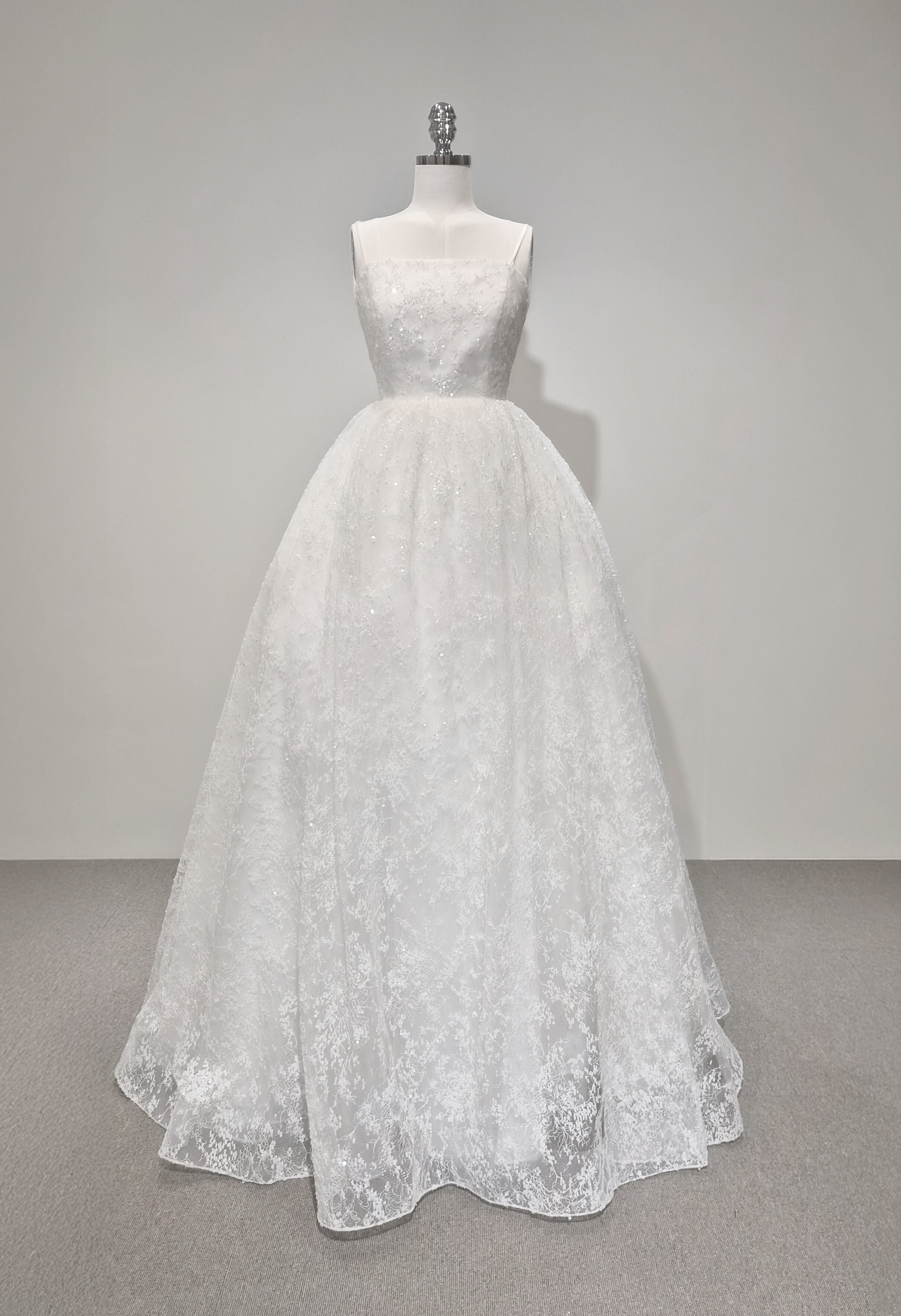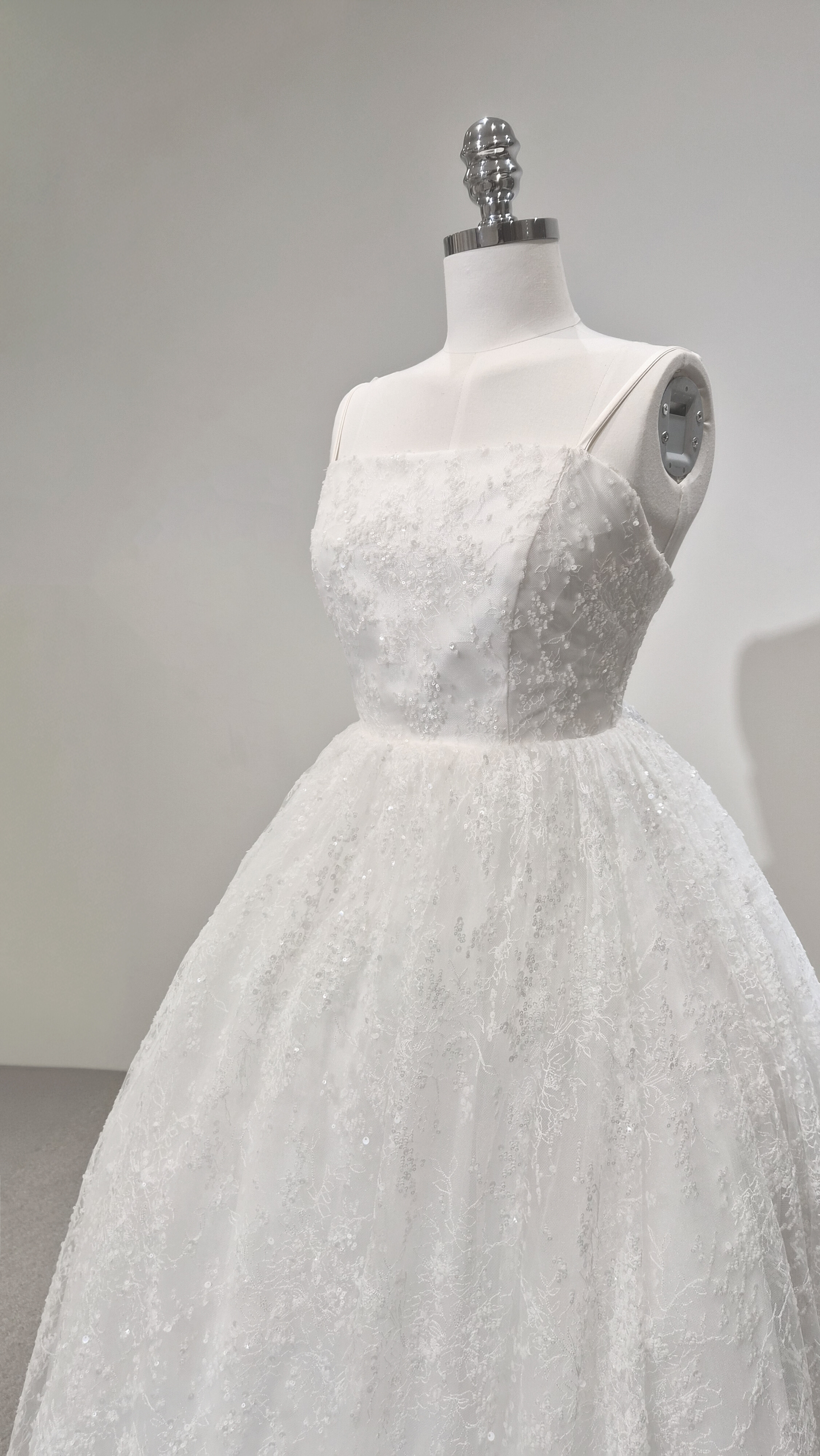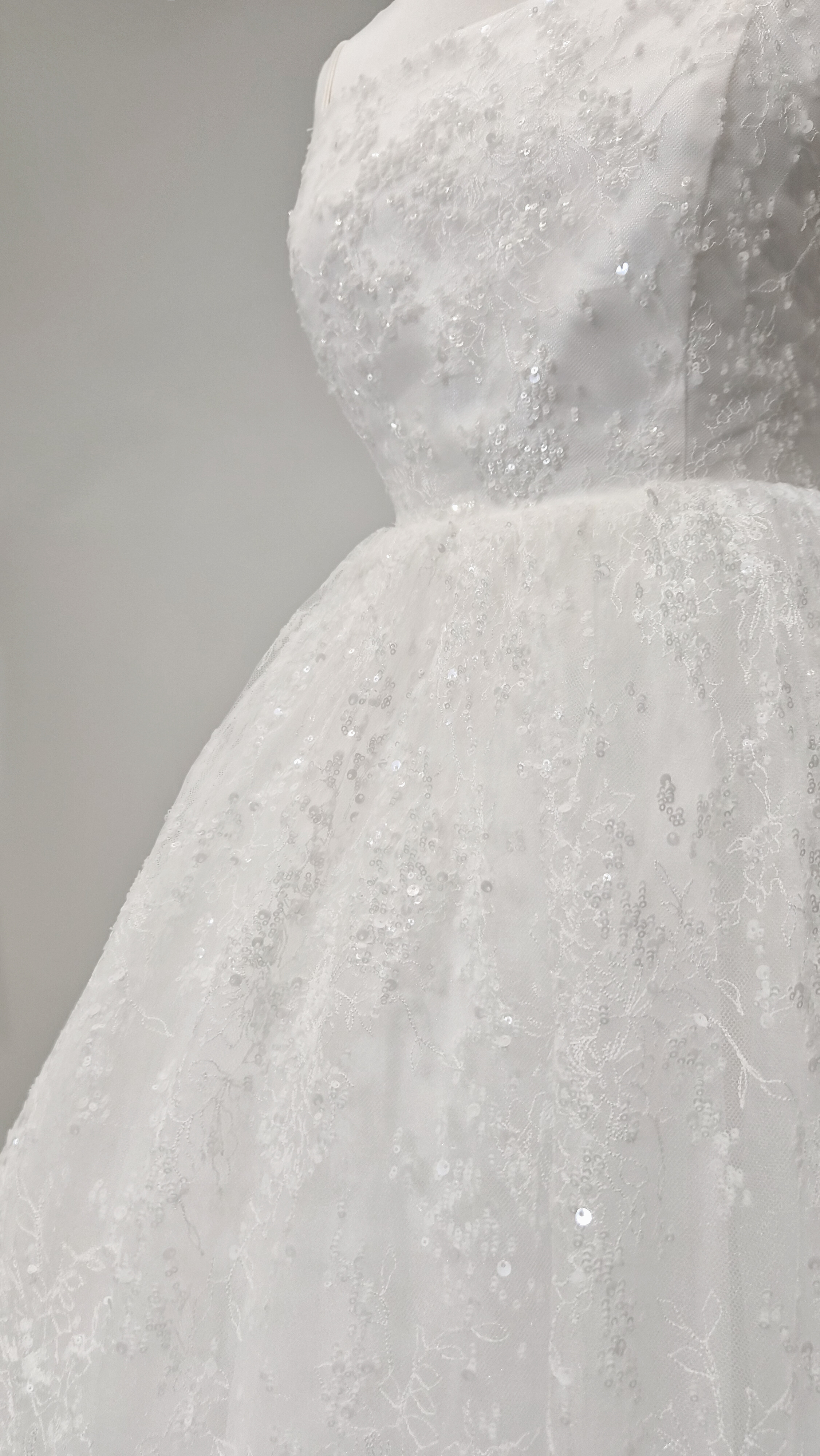 섬세하게 흩뿌린 듯한 미세 플라워 텍스처와 실버 스팽글이 은은하게 얹혀 있어, 보는 각도마다 잔잔한 반짝임이 살아납니다. 얇은 자수 레이스 조직이 층을 이루며, 자연광과 실내 조명에서 모두 고급스러운 질감을 보여줍니다.