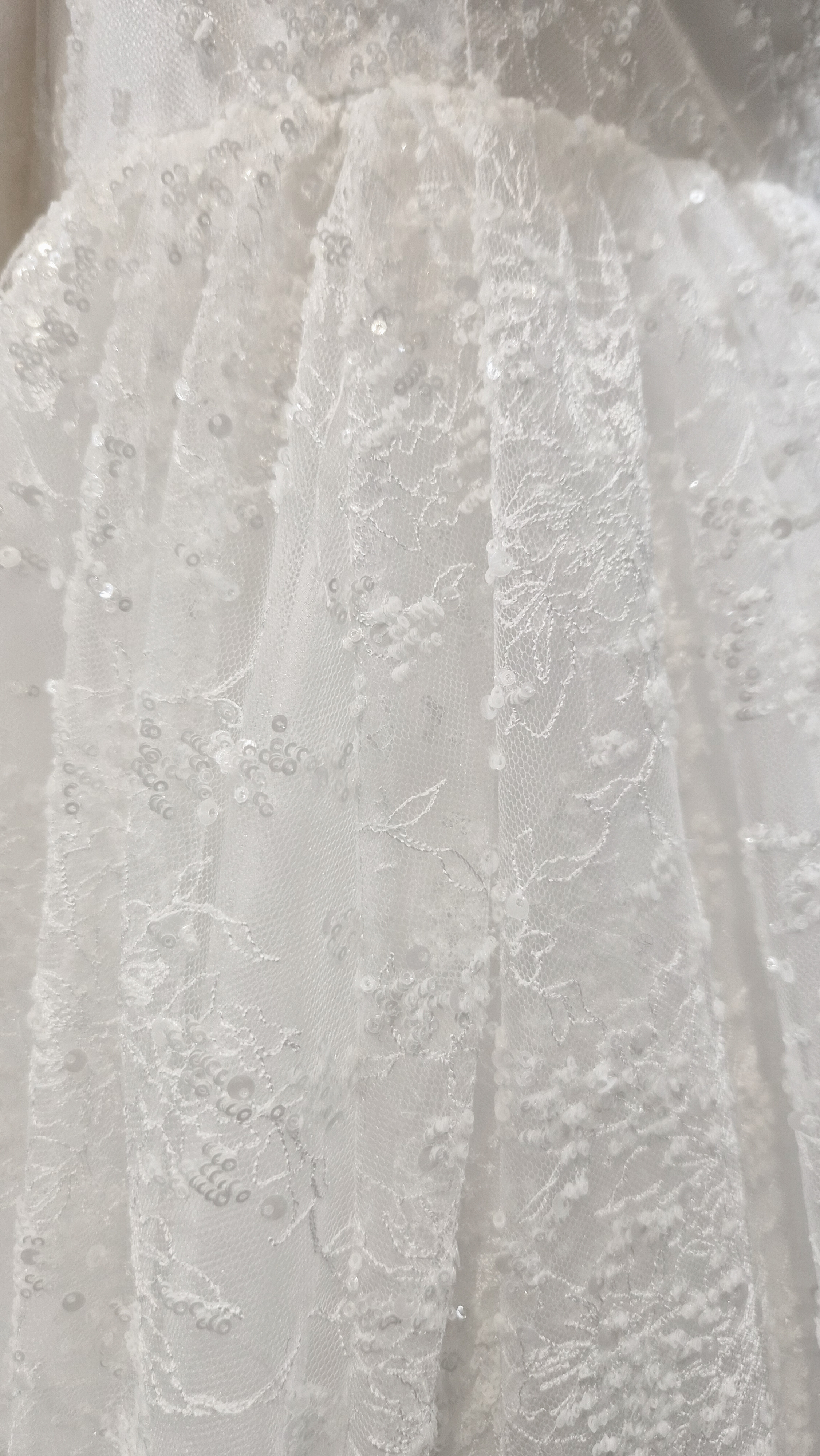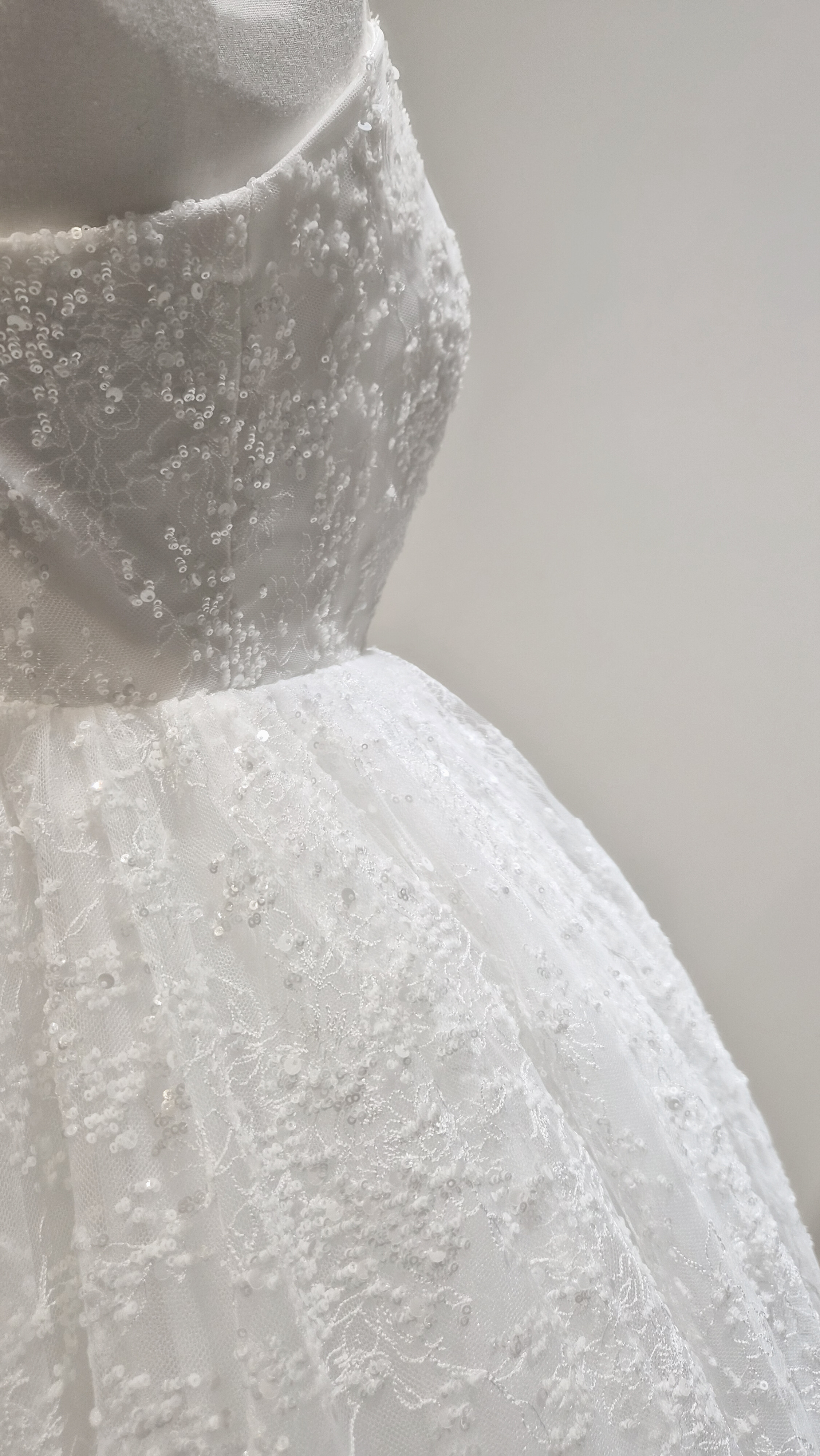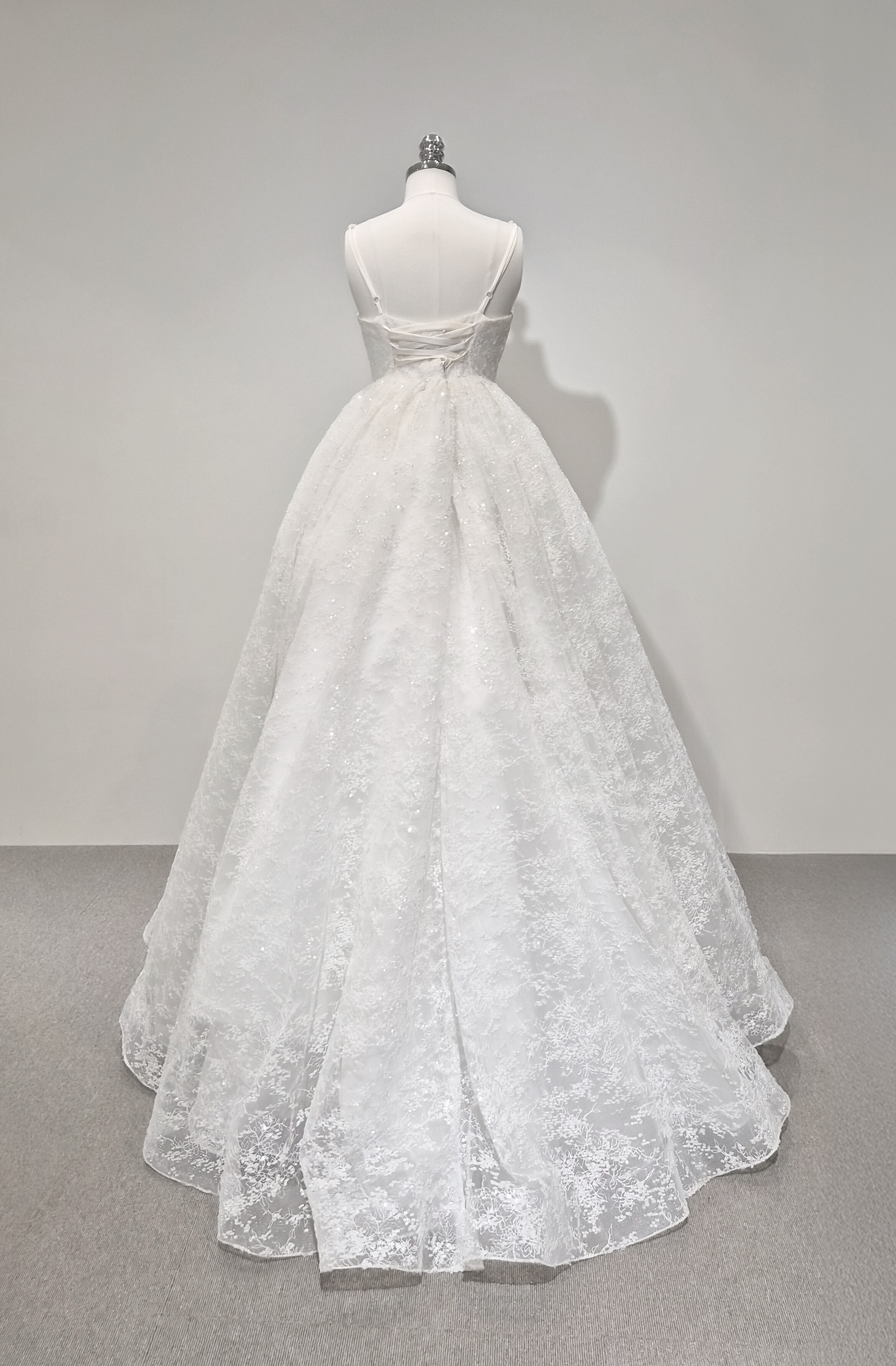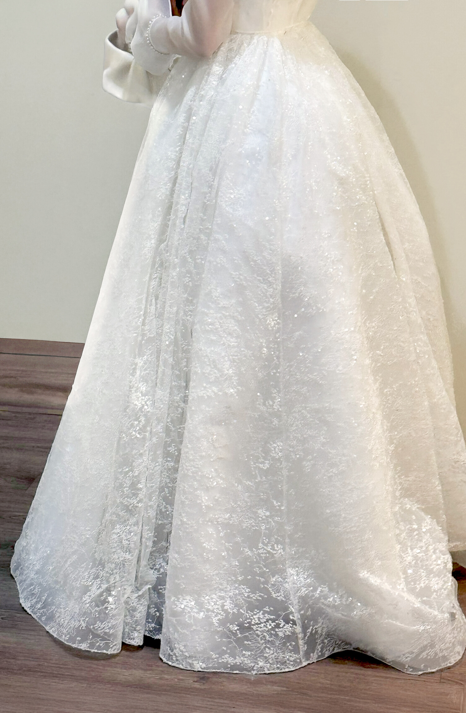 섬세하게 흩뿌린 듯한 미세 플라워 텍스처와 실버 스팽글이 은은하게 얹혀 있어, 보는 각도마다 잔잔한 반짝임이 살아납니다. 얇은 자수 레이스 조직이 층을 이루며, 자연광과 실내 조명에서 모두 고급스러운 질감을 보여줍니다.