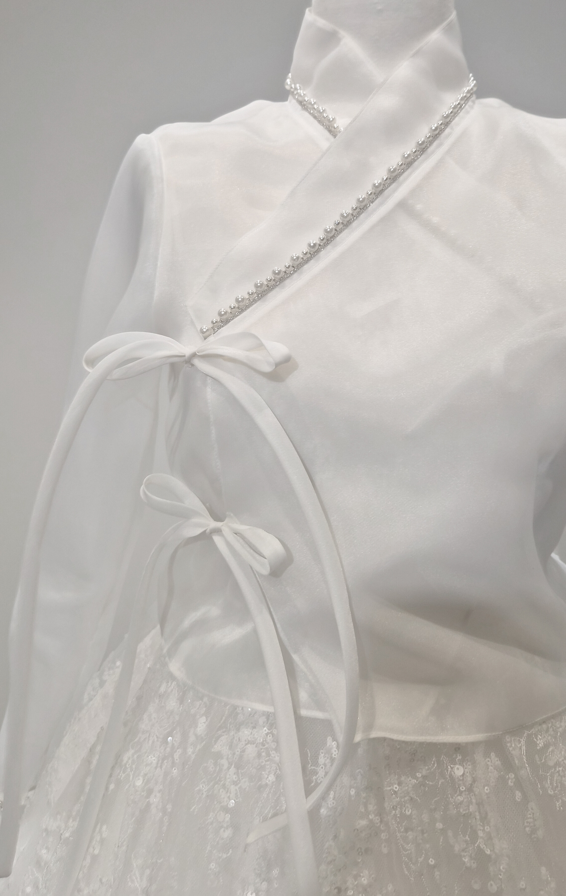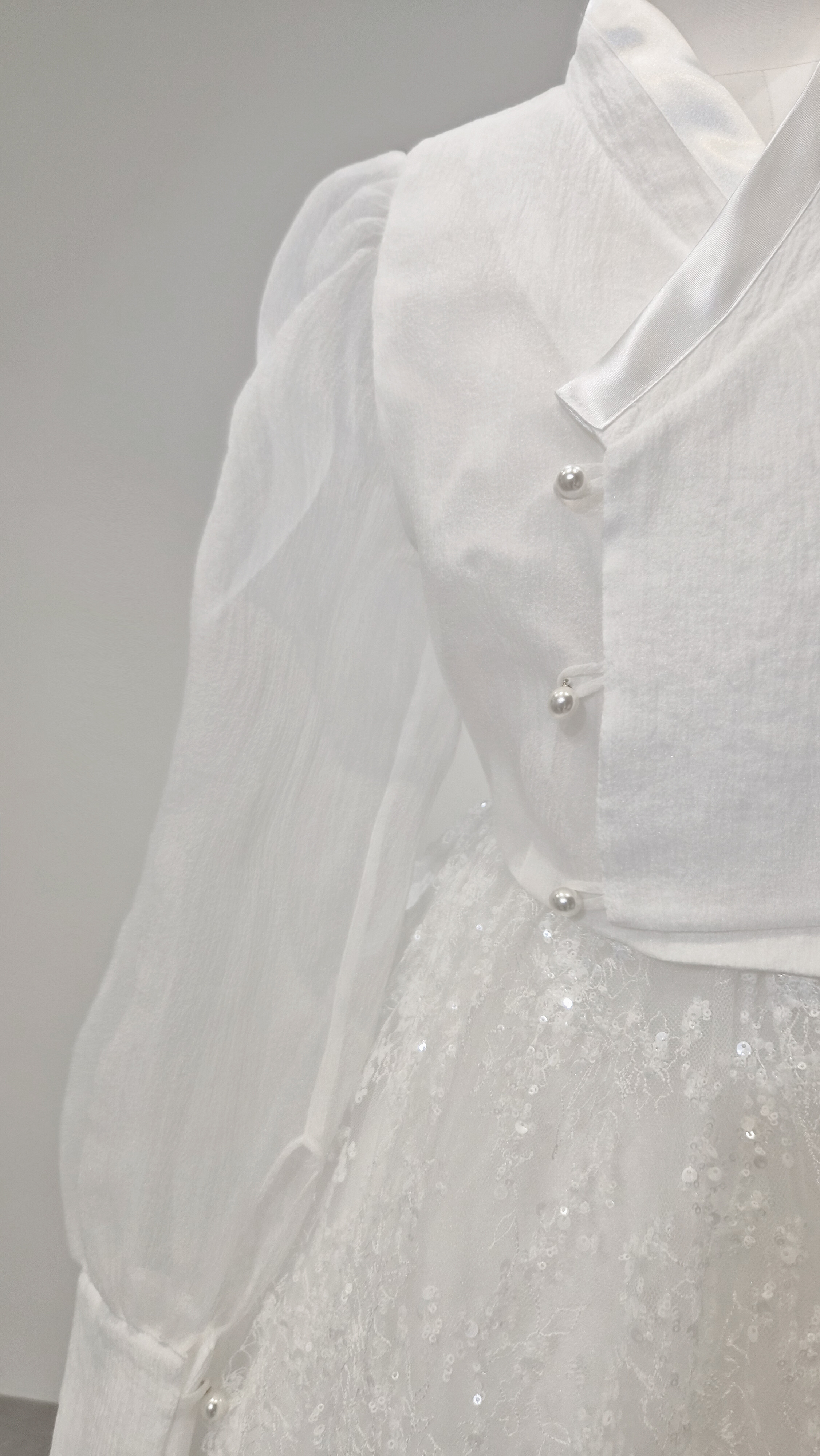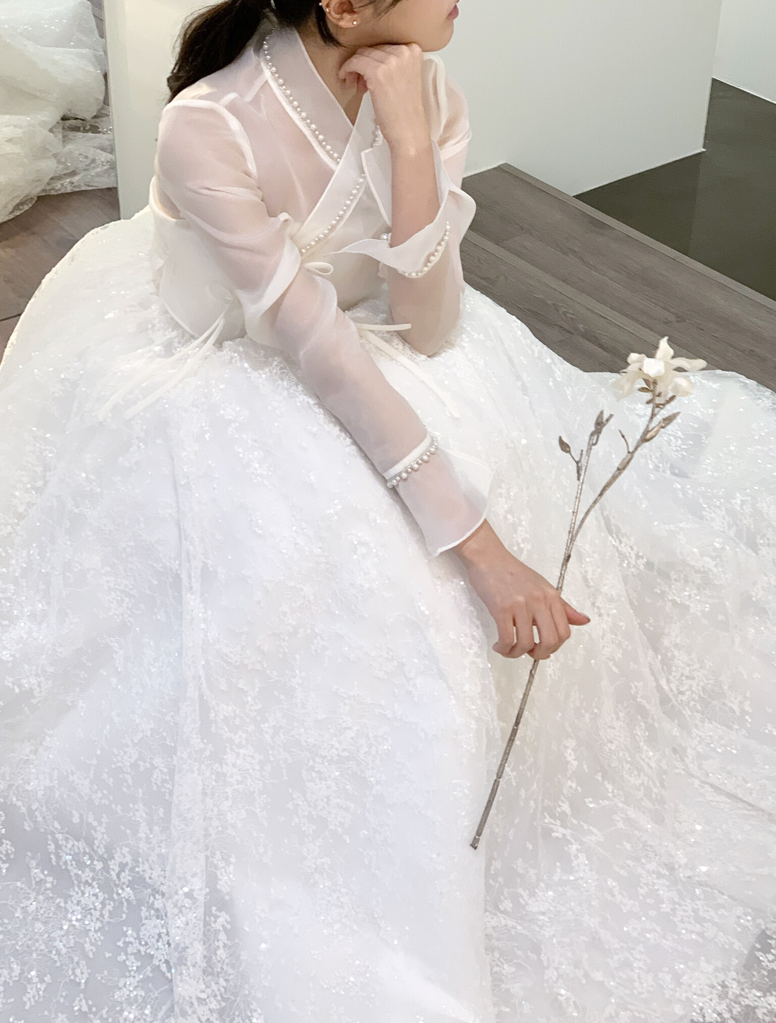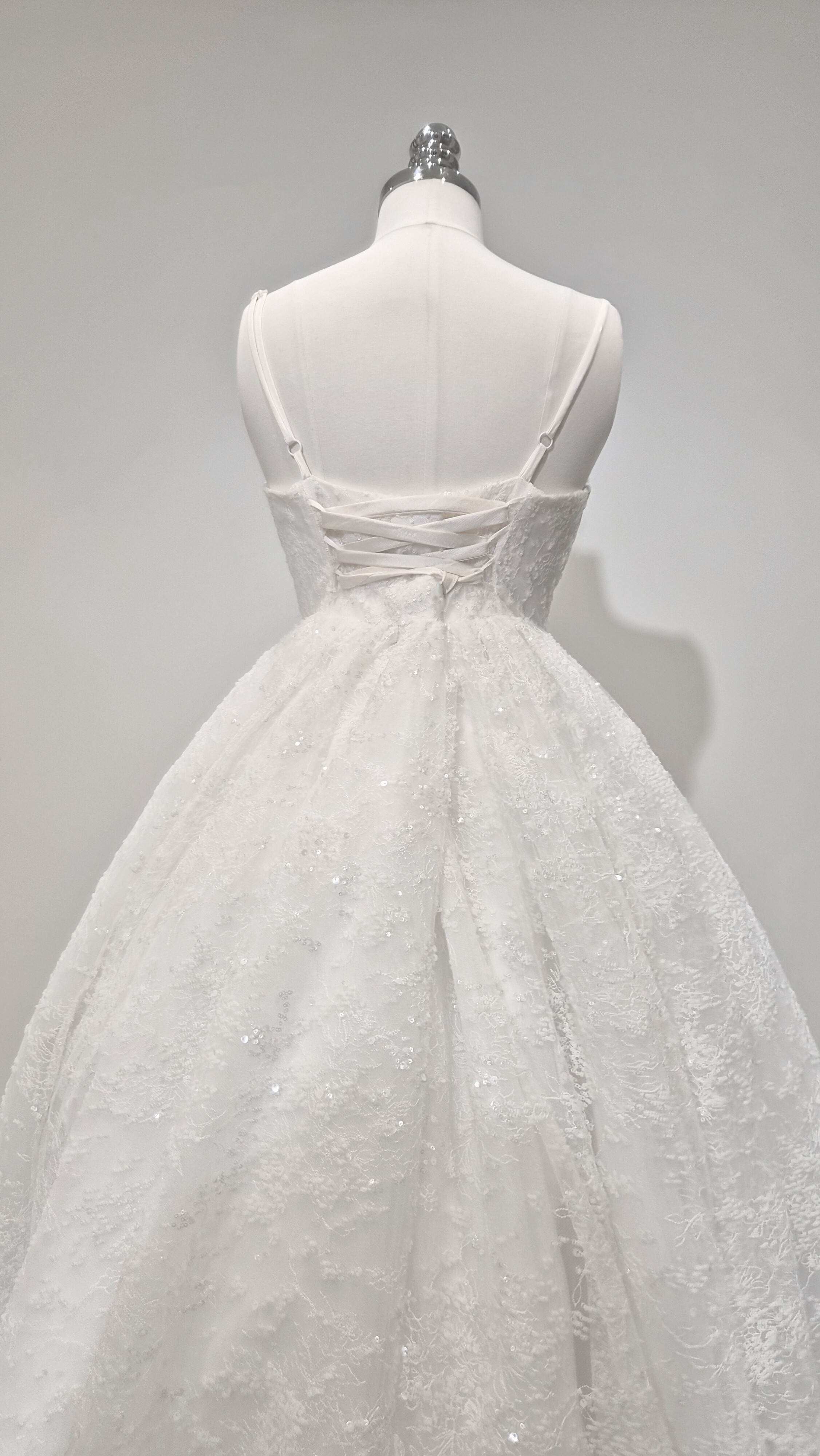 섬세하게 흩뿌린 듯한 미세 플라워 텍스처와 실버 스팽글이 은은하게 얹혀 있어, 보는 각도마다 잔잔한 반짝임이 살아납니다. 얇은 자수 레이스 조직이 층을 이루며, 자연광과 실내 조명에서 모두 고급스러운 질감을 보여줍니다.