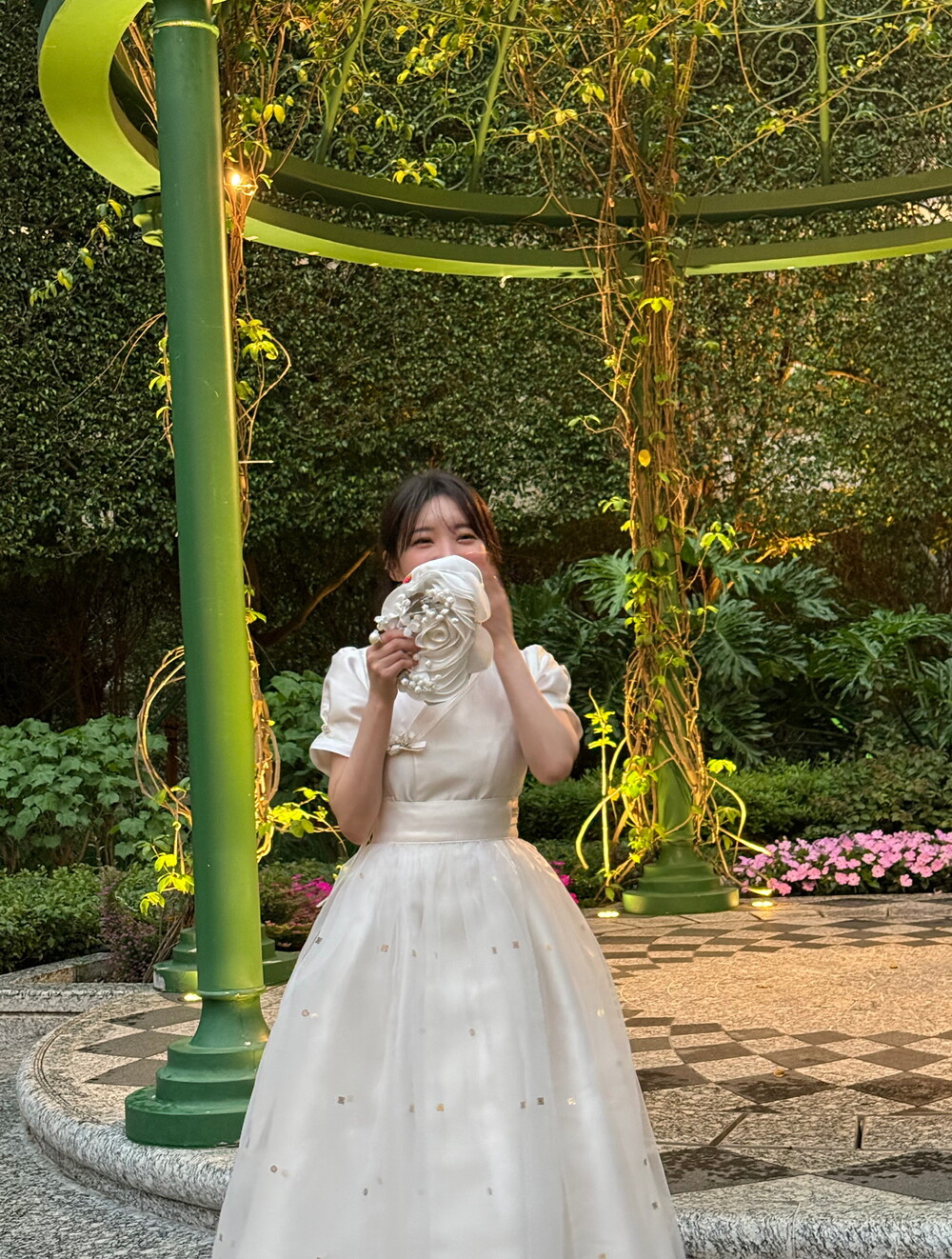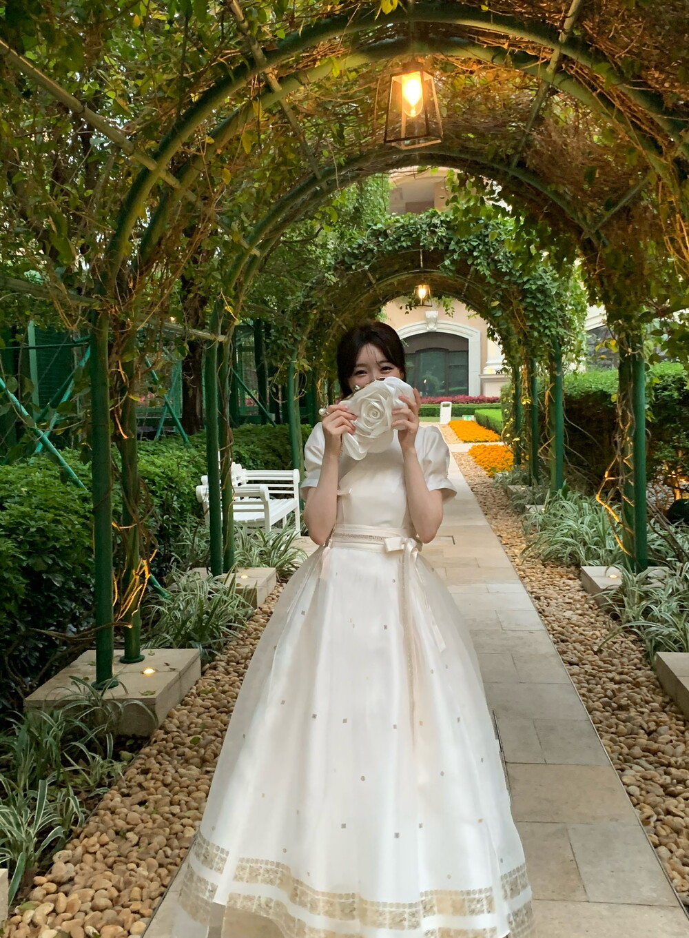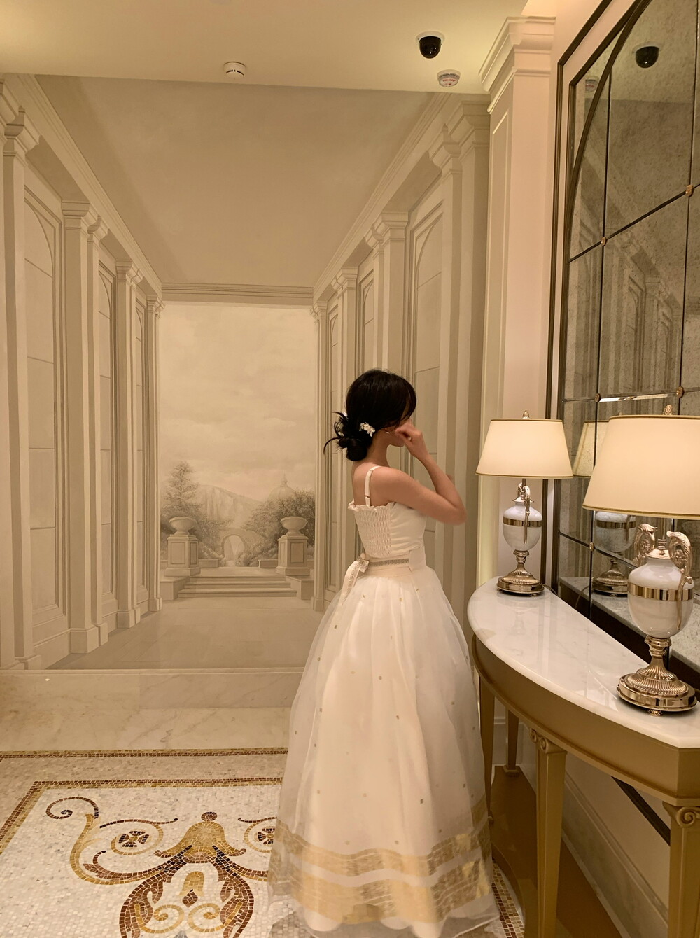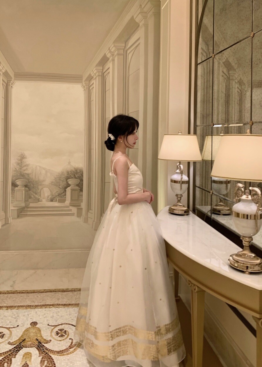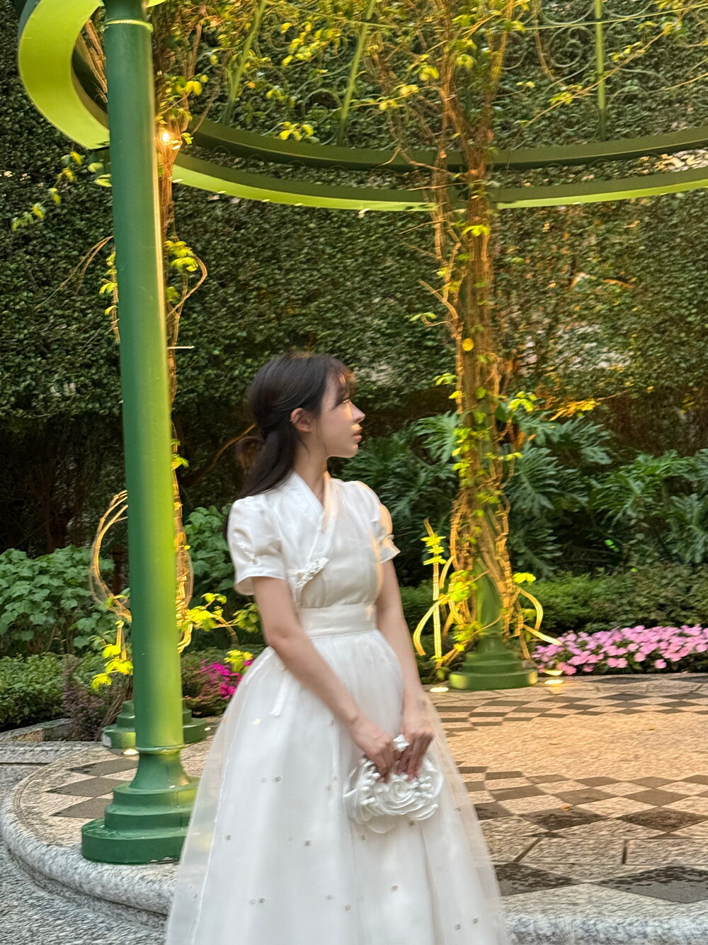 This overskirt is designed to accentuate the voluminous silhouette unique to traditional Hanbok, making it a perfect layering piece for a K-dress. Made from a lightweight, sheer fabric, it creates an overall elegant and romantic mood while adding depth and dimension to the dress. The hem is delicately adorned with gold foil detailing, offering a refined touch that blends traditional charm with a modern aesthetic.