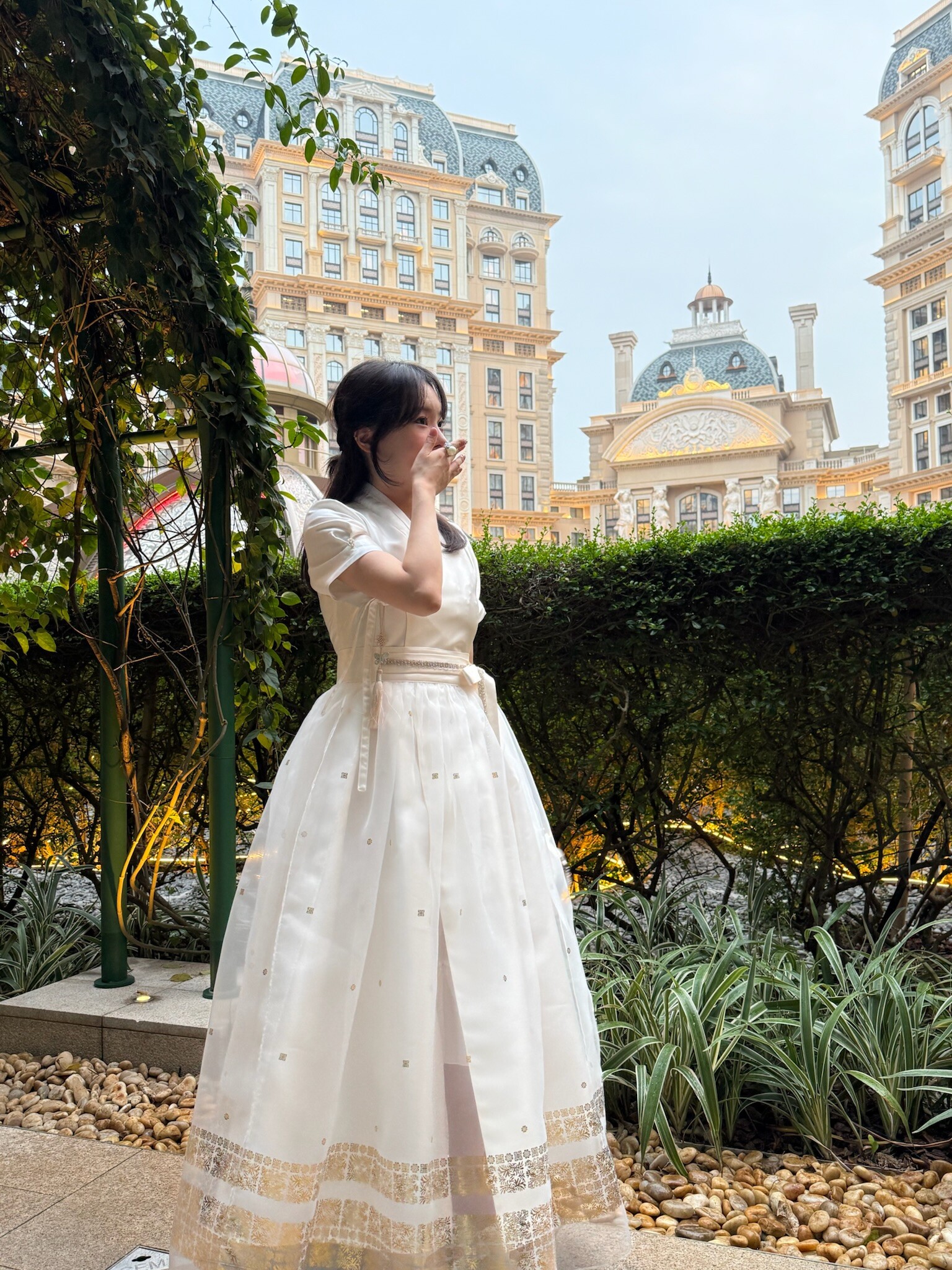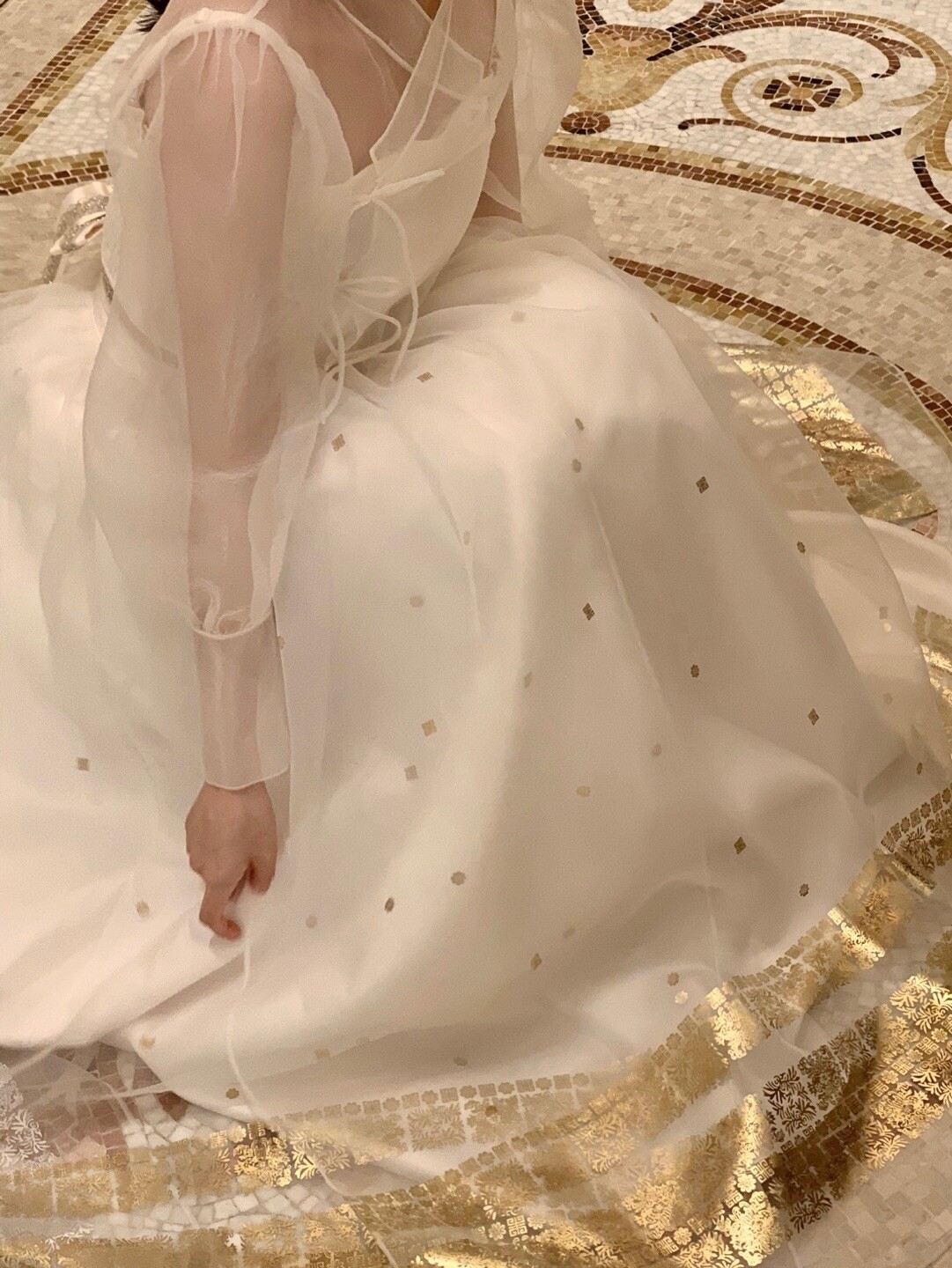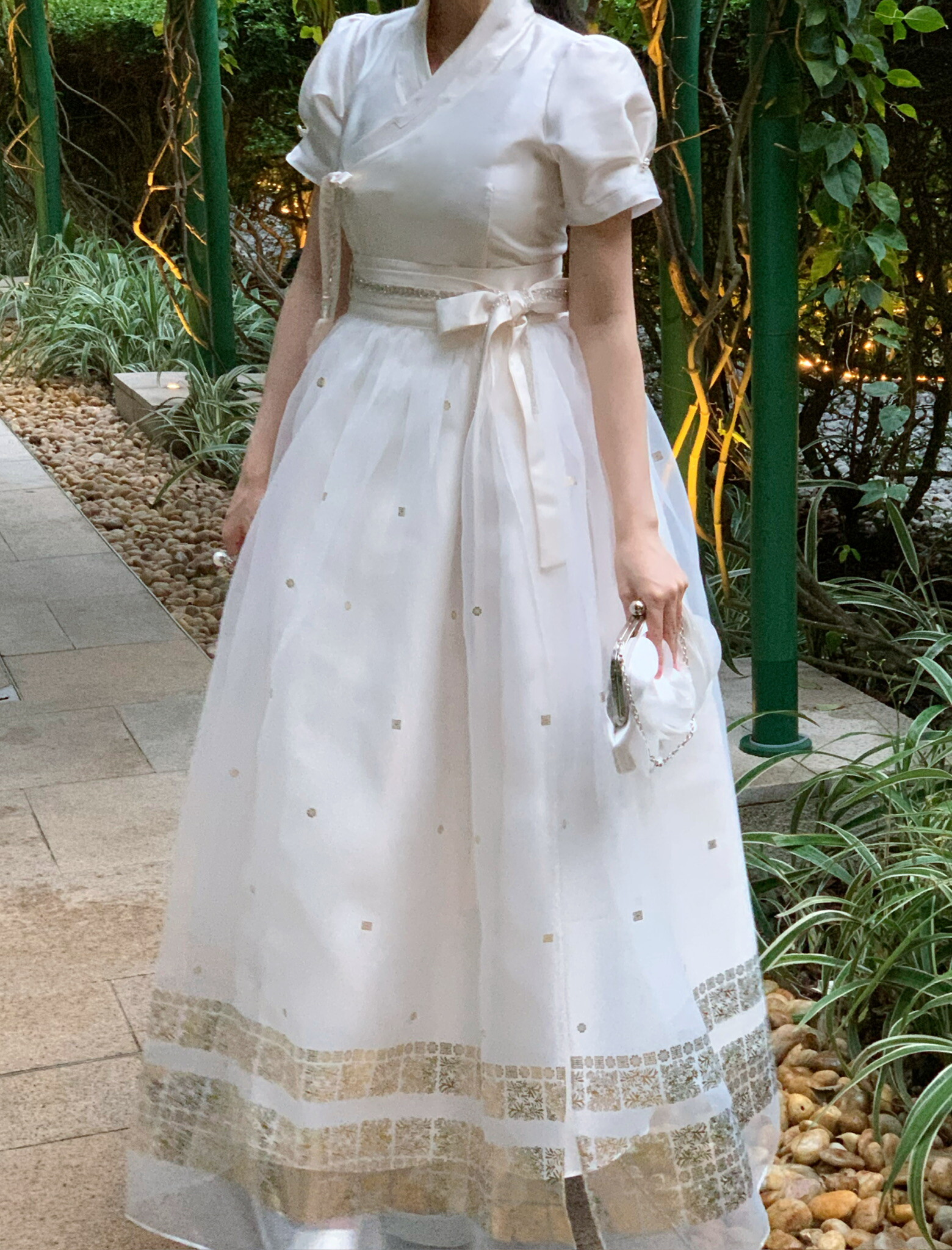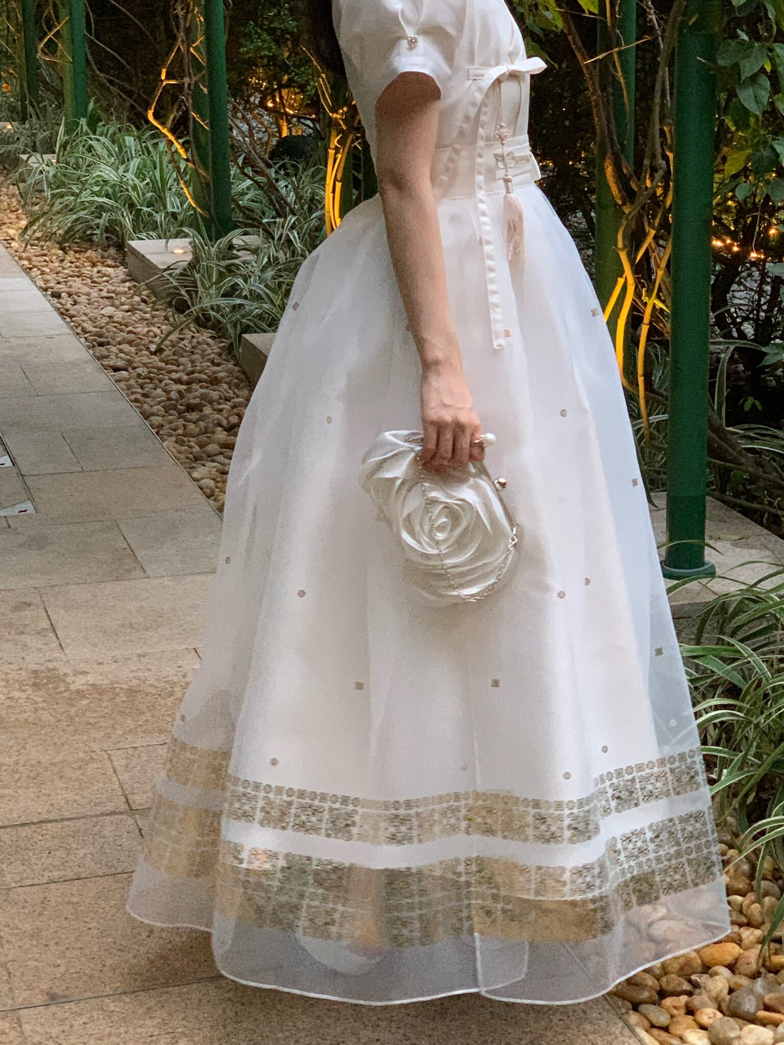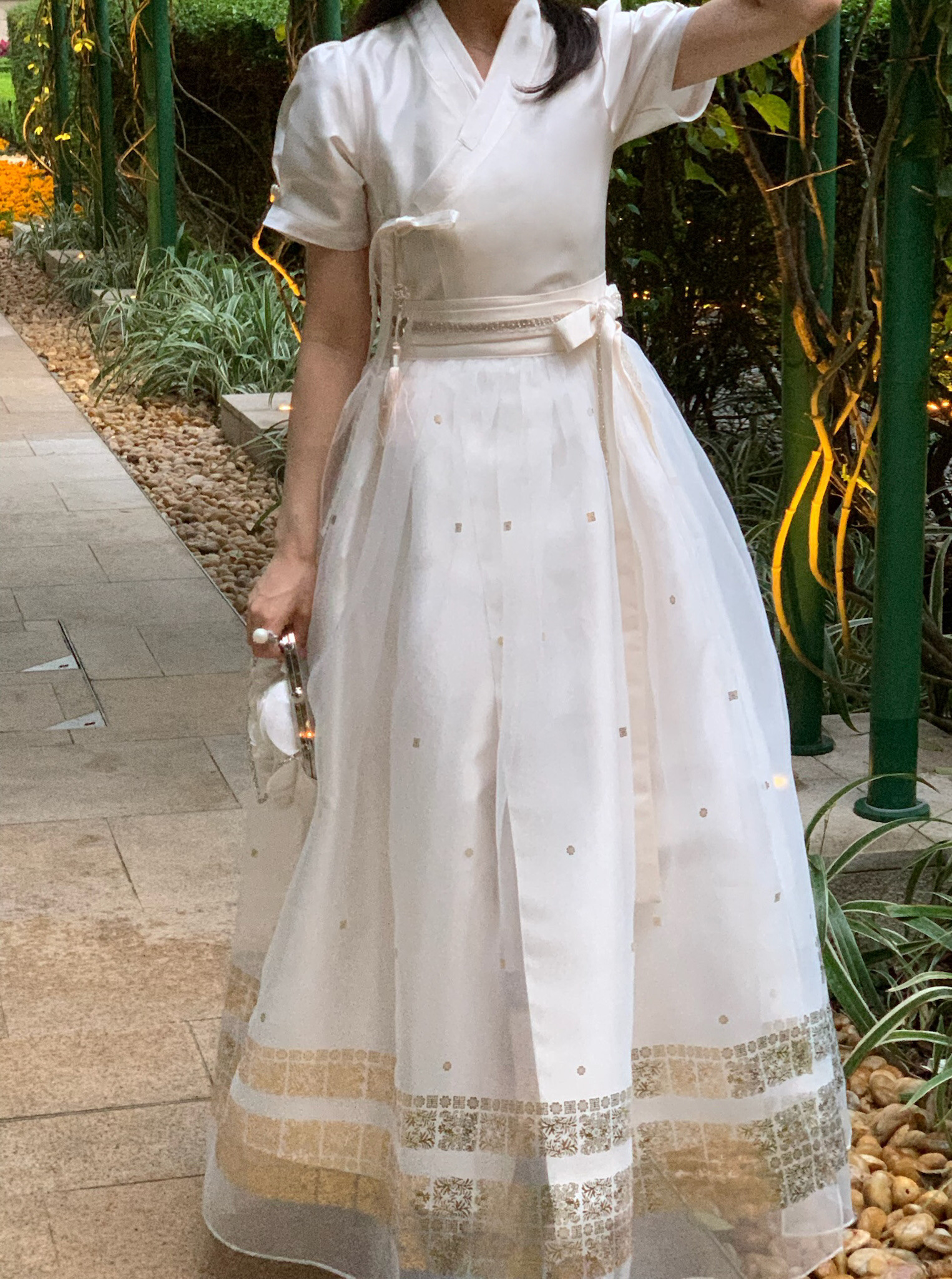 This overskirt is designed to accentuate the voluminous silhouette unique to traditional Hanbok, making it a perfect layering piece for a K-dress. Made from a lightweight, sheer fabric, it creates an overall elegant and romantic mood while adding depth and dimension to the dress. The hem is delicately adorned with gold foil detailing, offering a refined touch that blends traditional charm with a modern aesthetic.